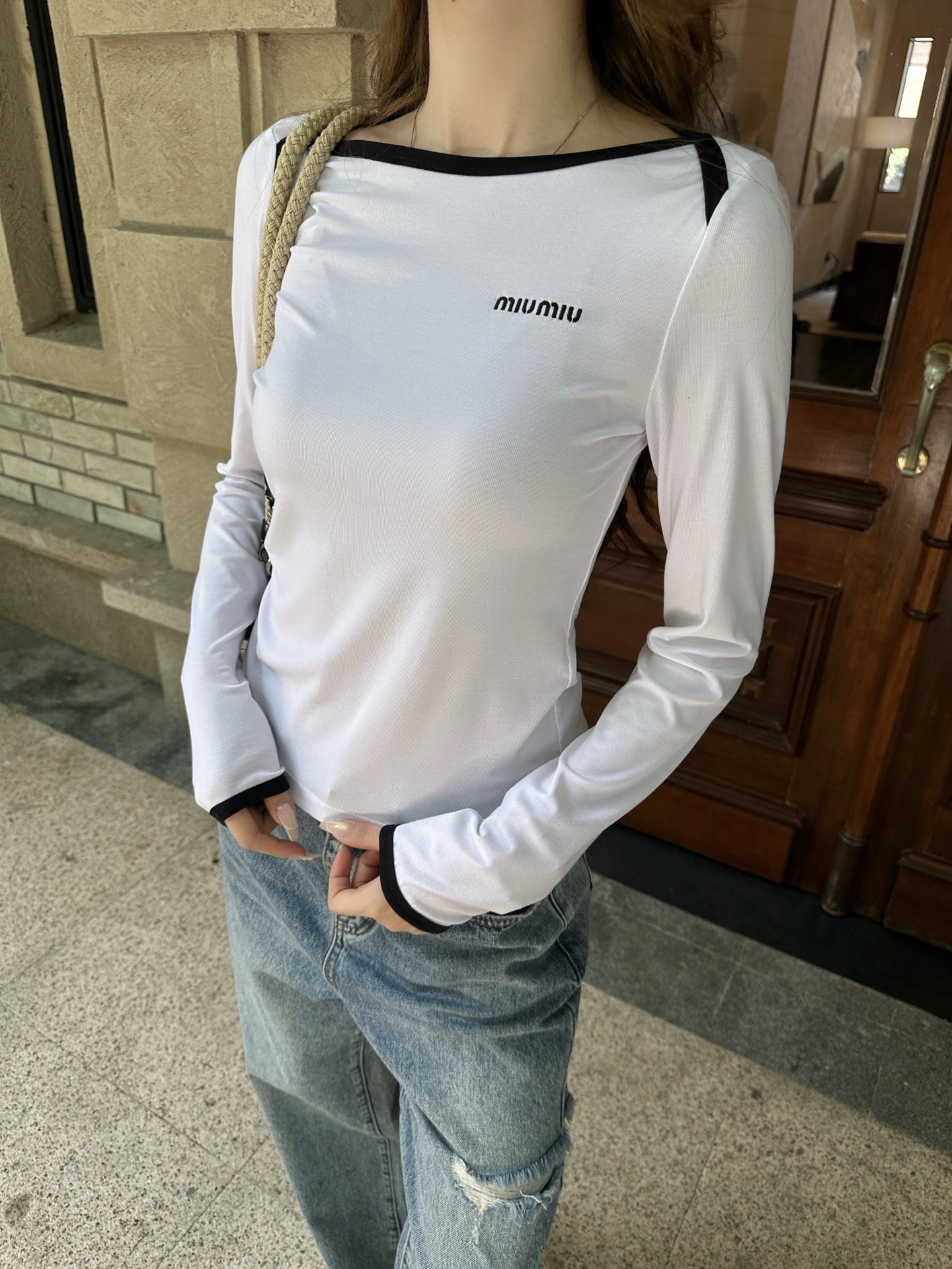 Elevate your wardrobe with this Miu Miu long-sleeve tee. Features delicate embroidery and a flattering fit, perfect for any occasion.