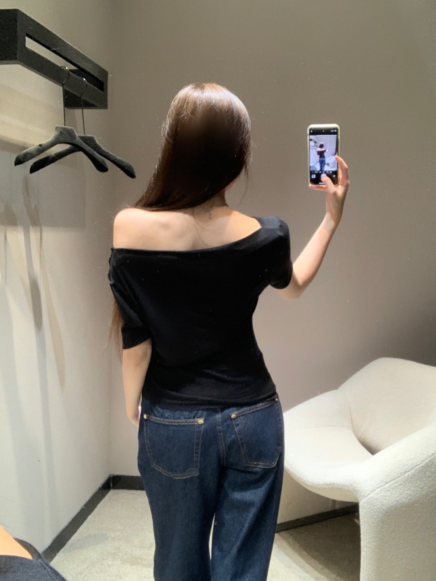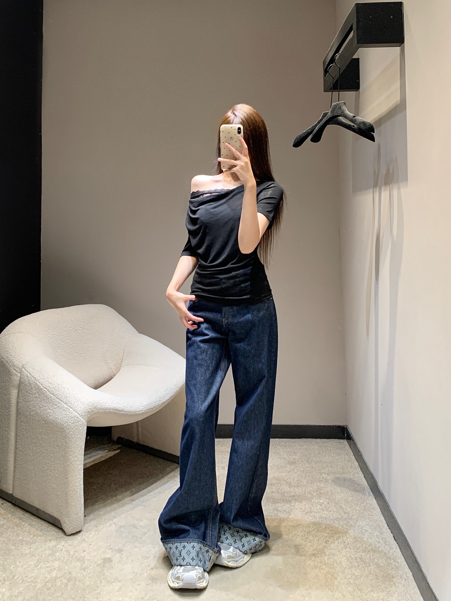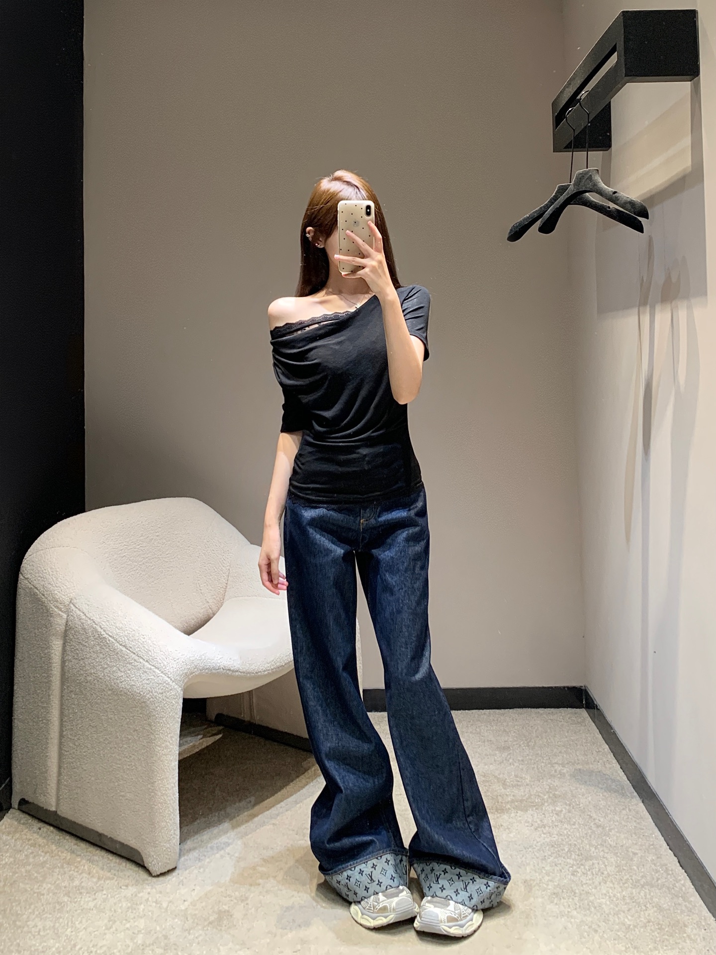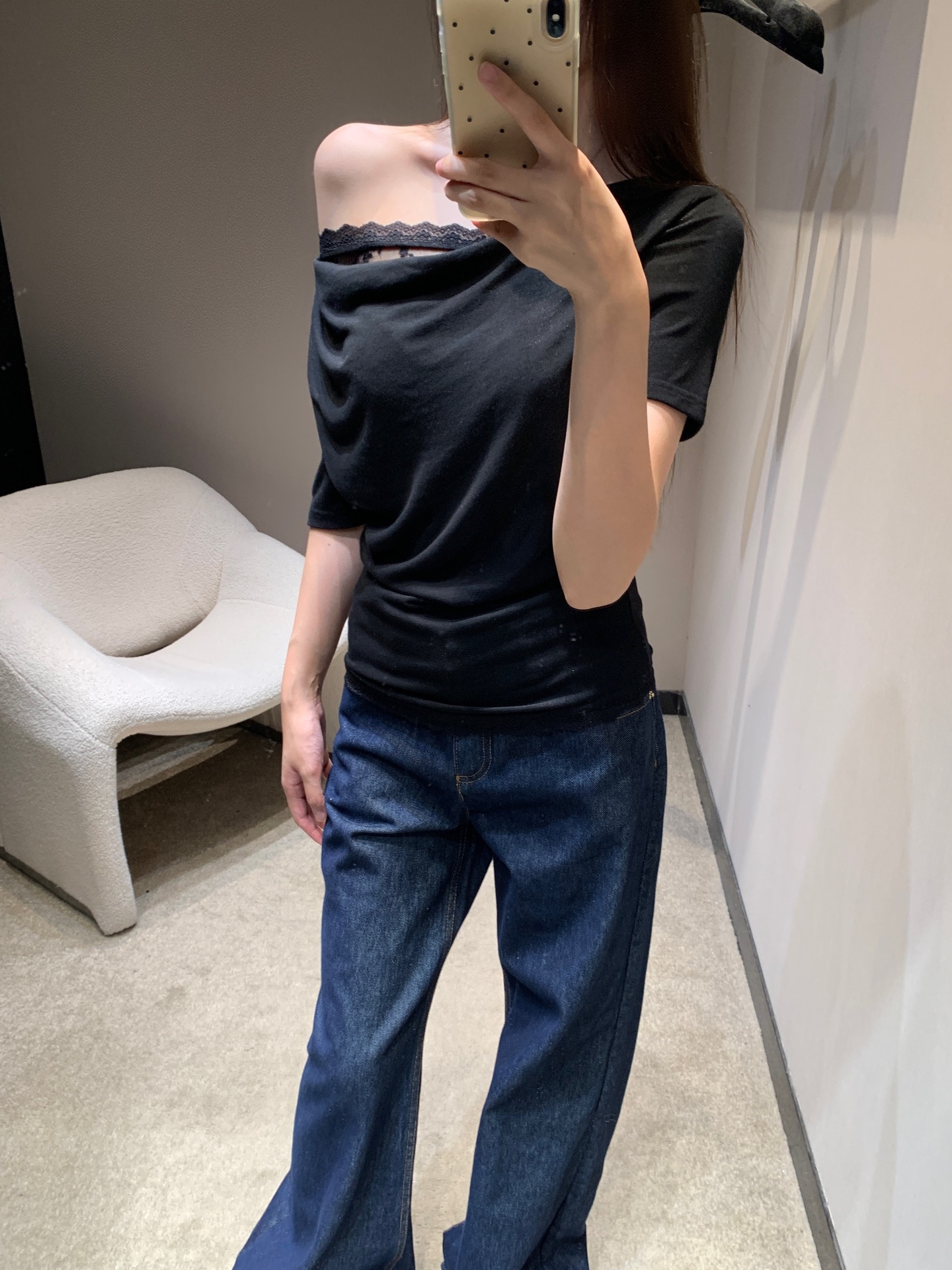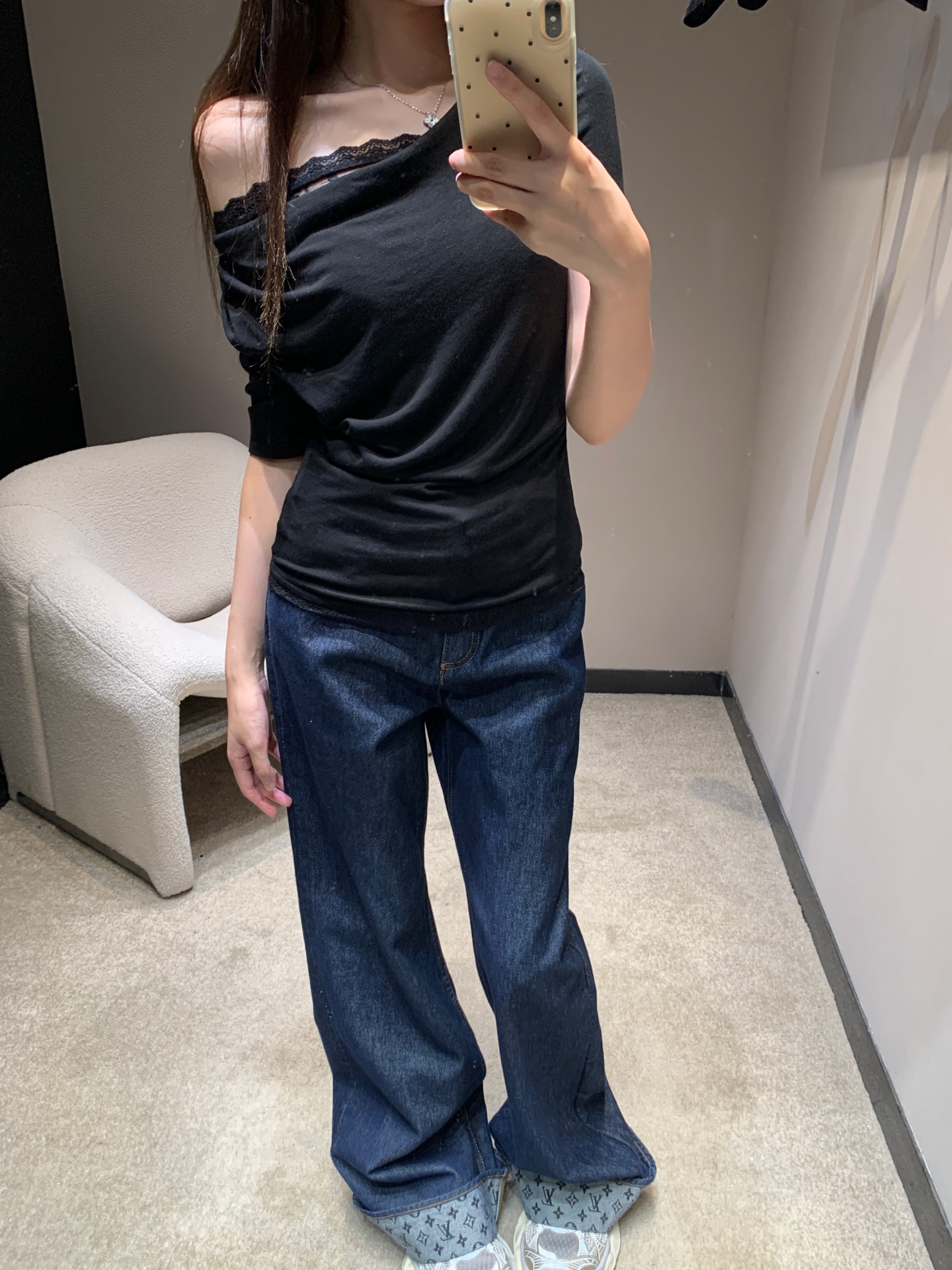 Elevate your wardrobe with this stunning lace-trimmed, off-shoulder T-shirt from Miu Miu. Designed for both style and comfort, this top is perfect for adding a touch of elegance to any outfit.