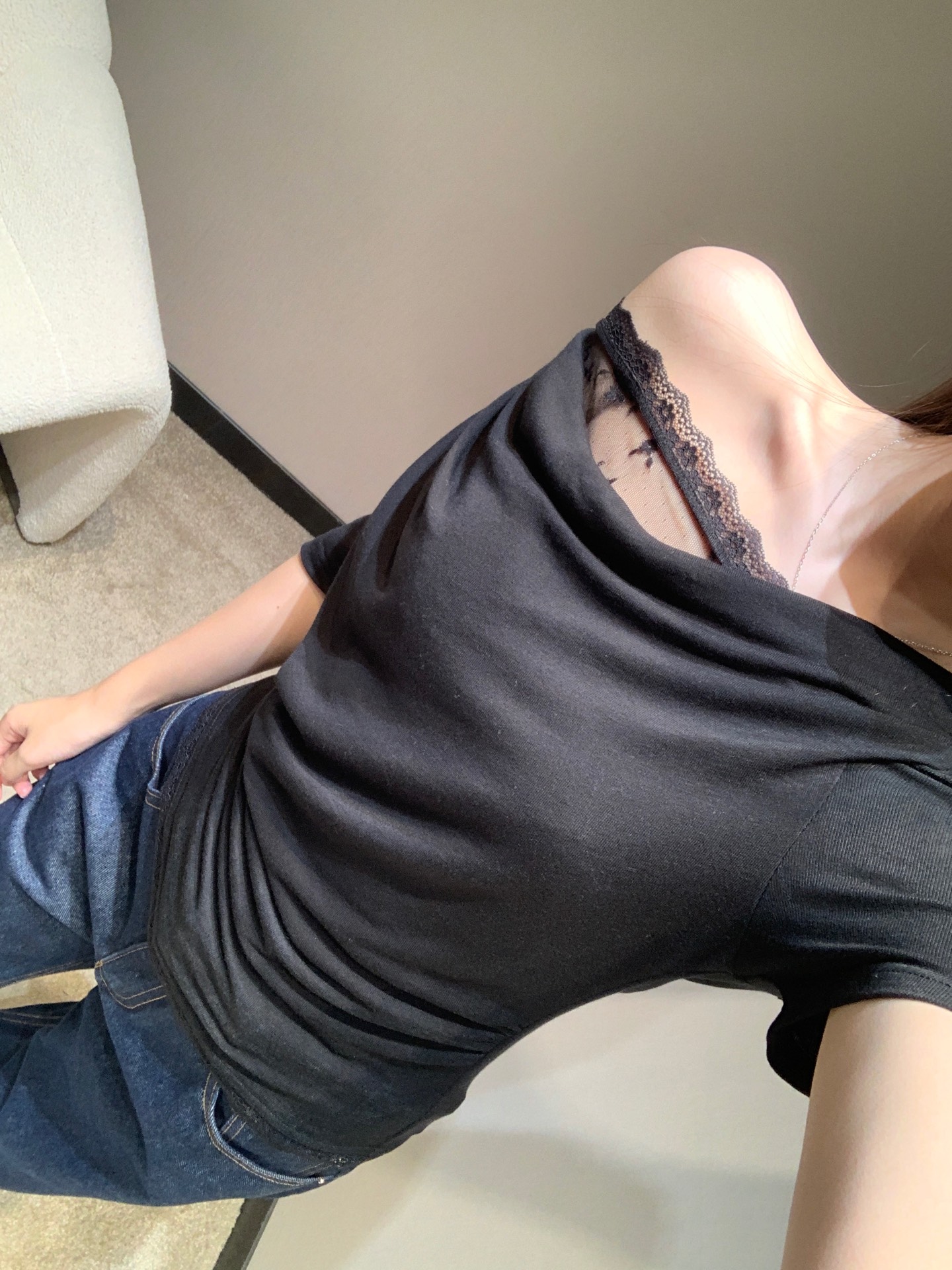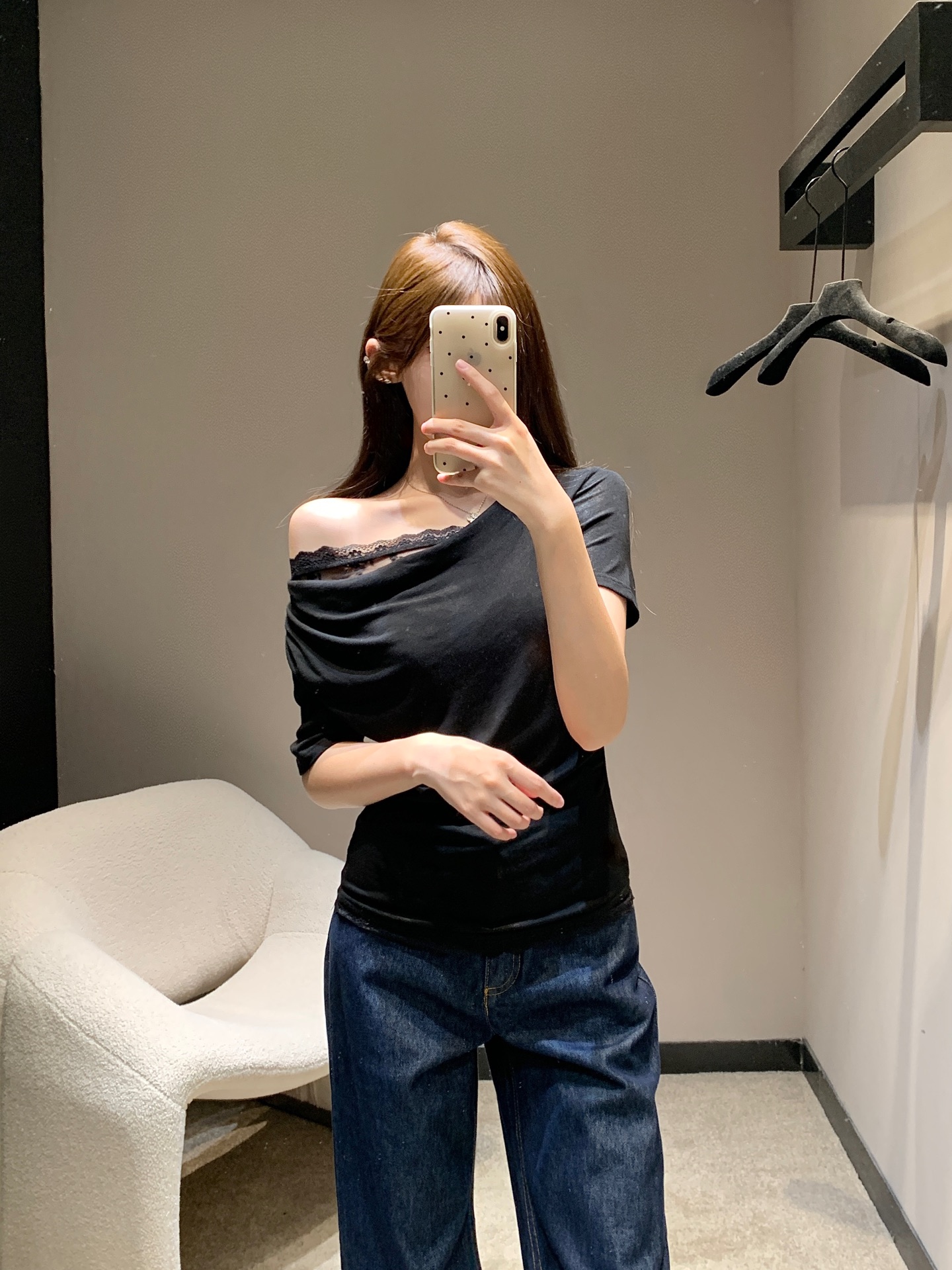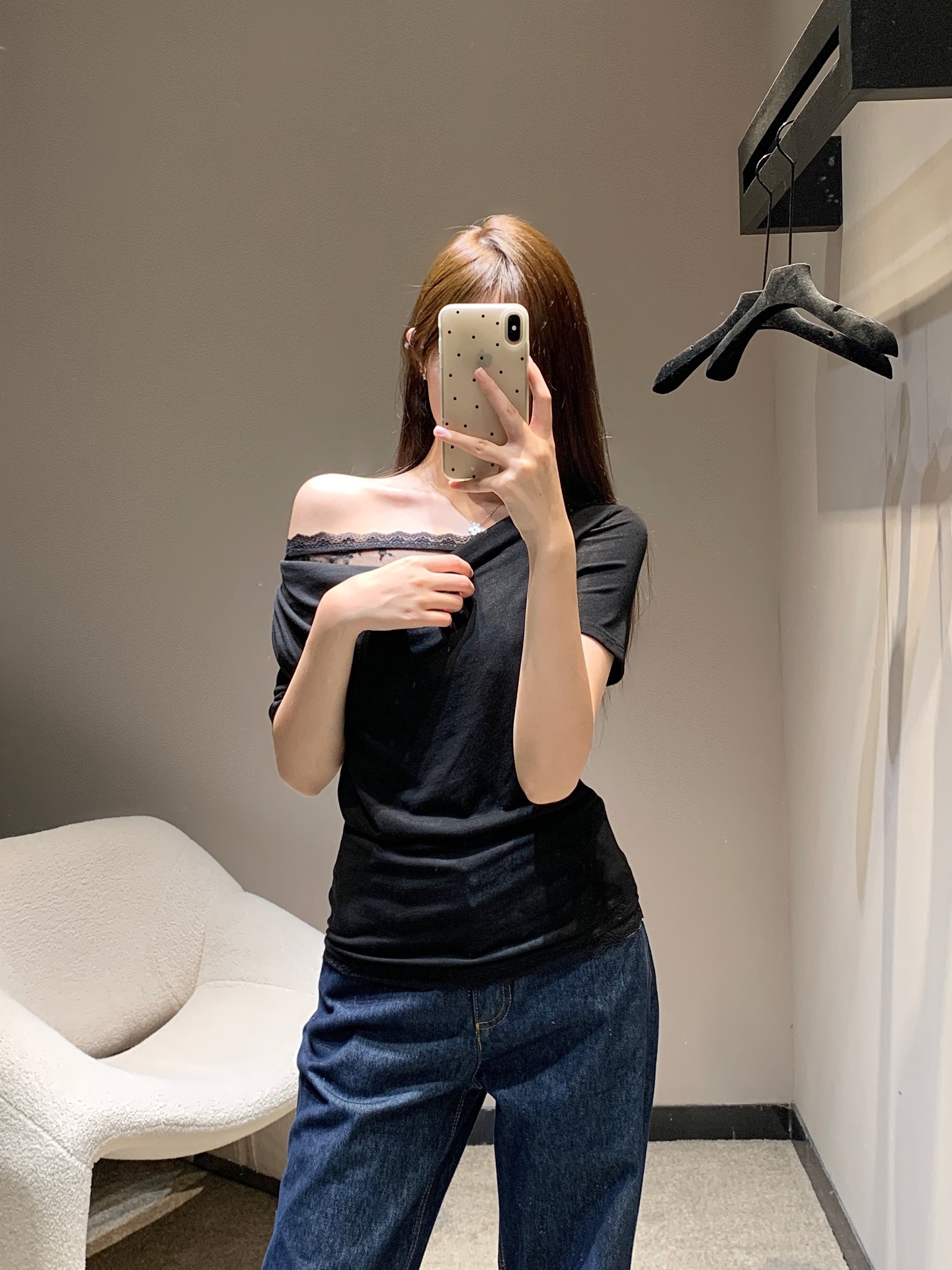Miu Miu Lace Trim Off-Shoulder Top, Elegant Short Sleeve Tee