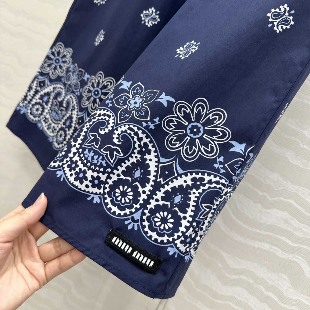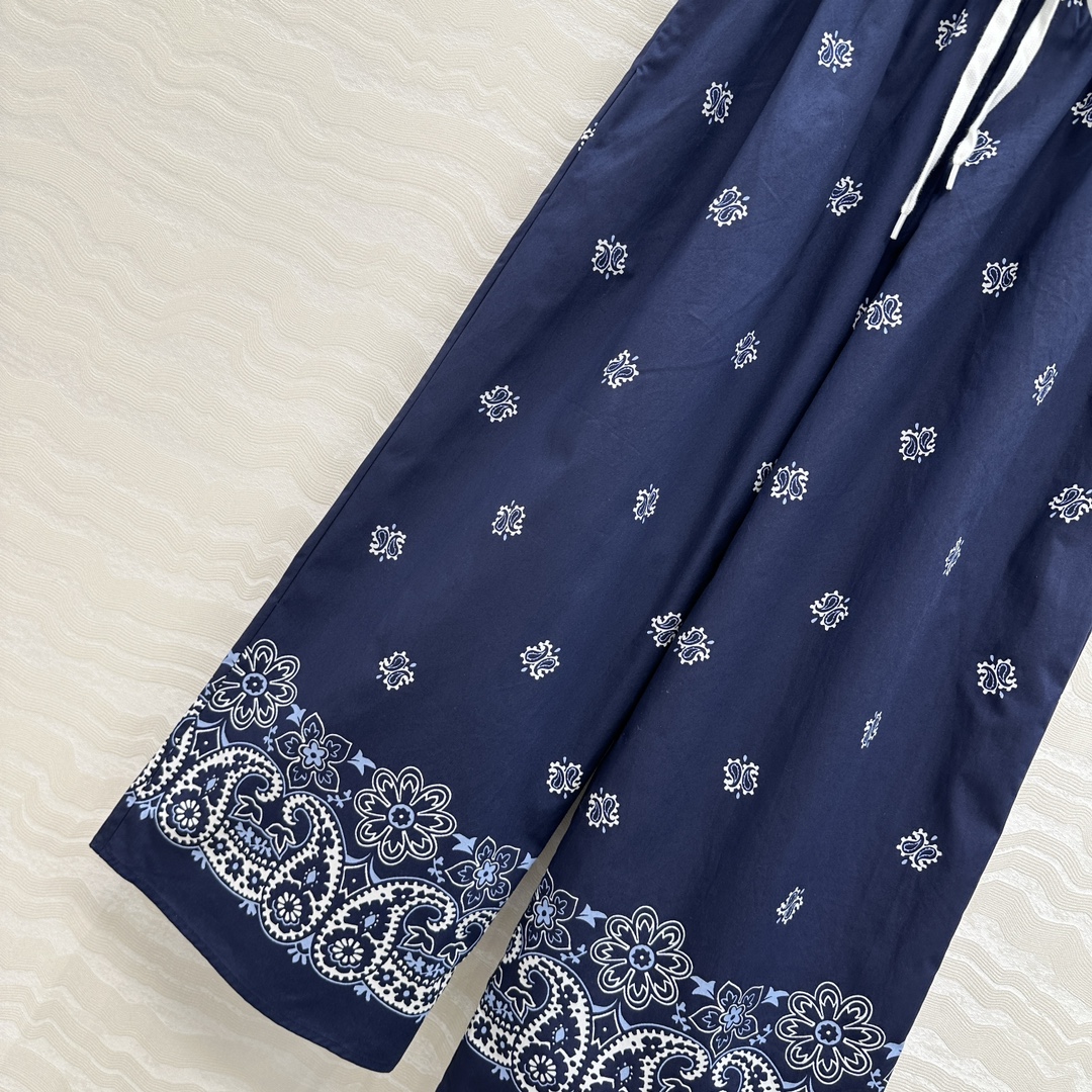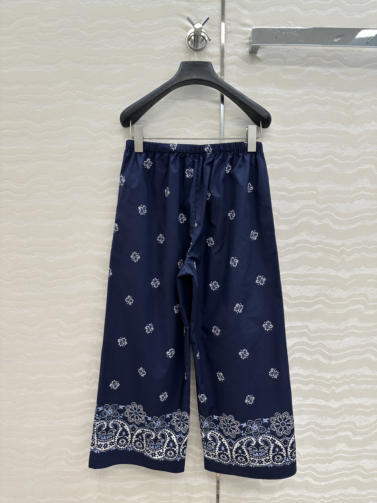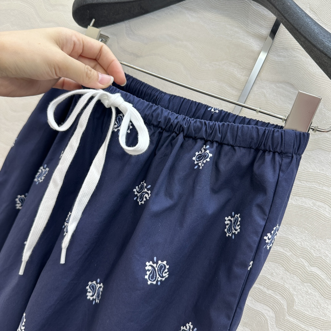 Miu Miu Navy Blue Paisley Print Cropped Pants Elastic Waist Cotton