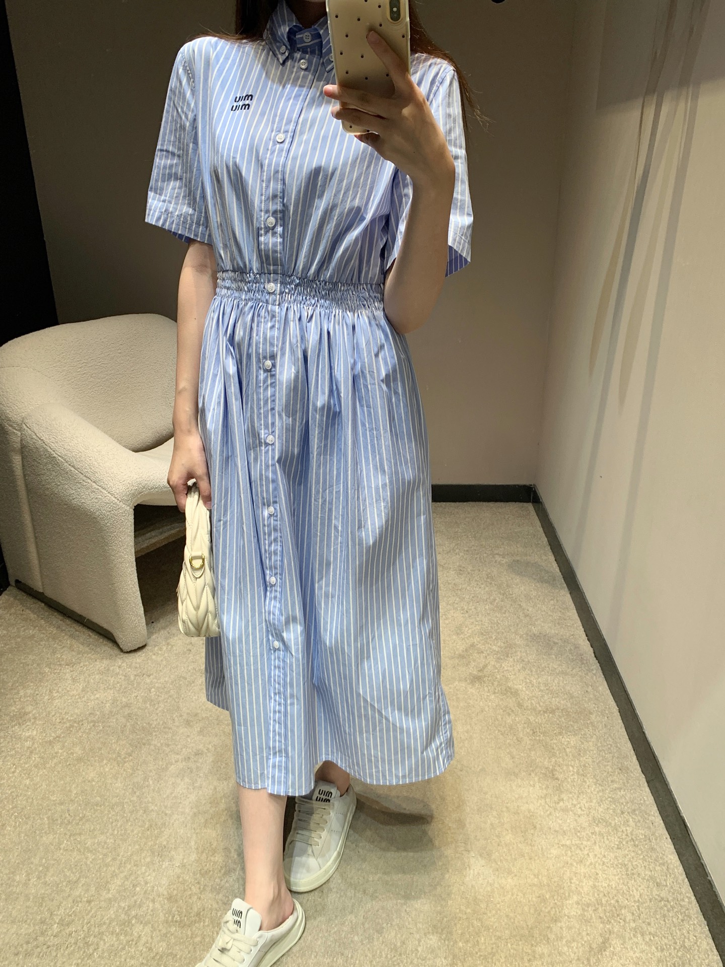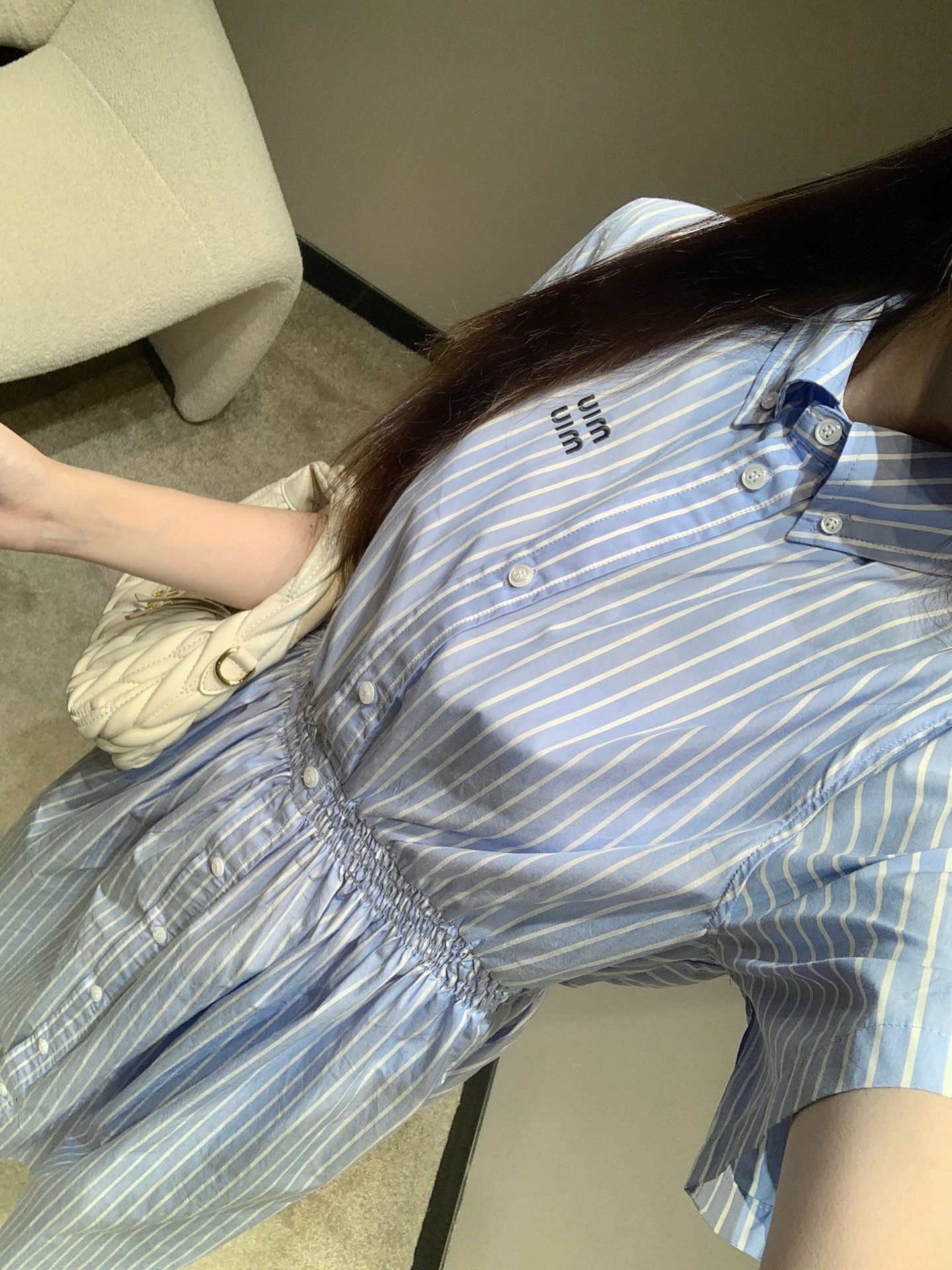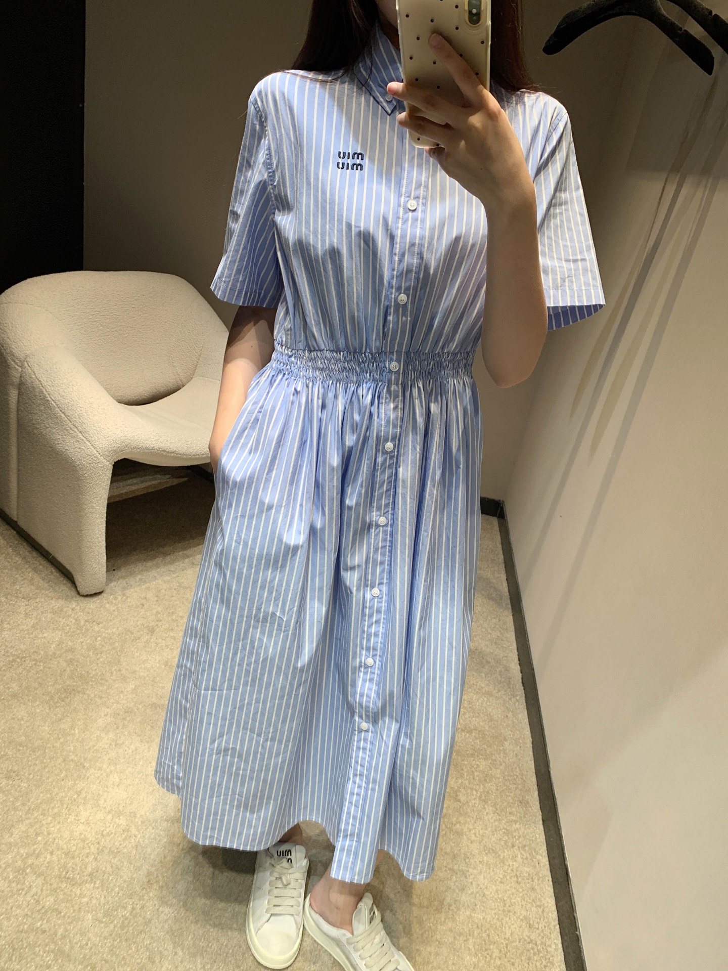 This Miu Miu shirtdress combines classic design with modern comfort, perfect for any occasion. Its striped pattern and elastic waist create a flattering silhouette that's both stylish and comfortable.