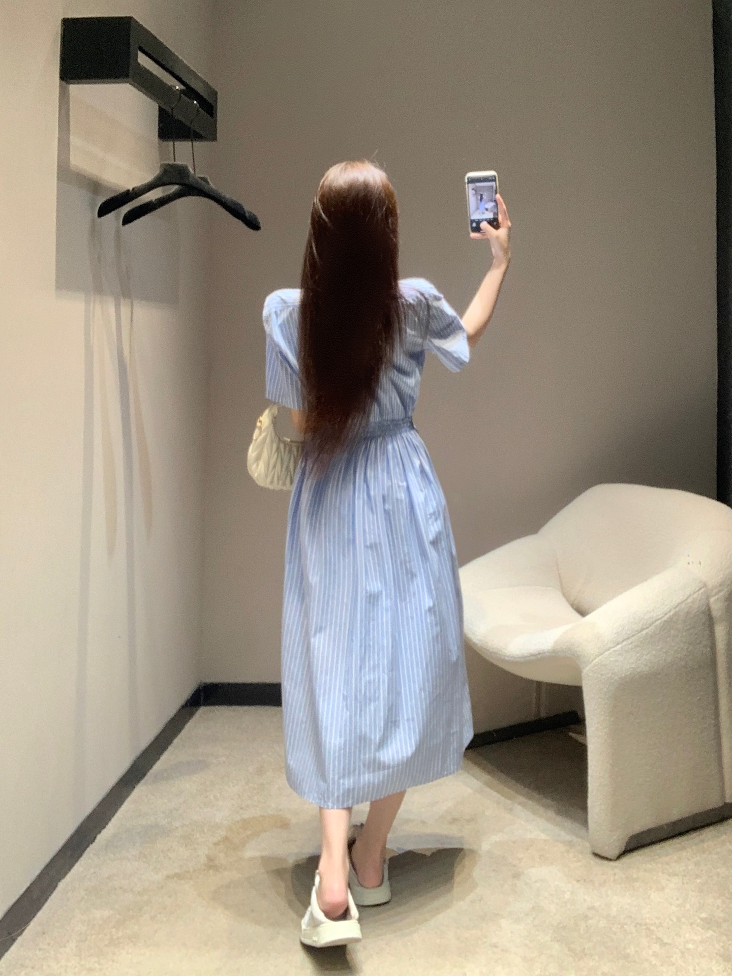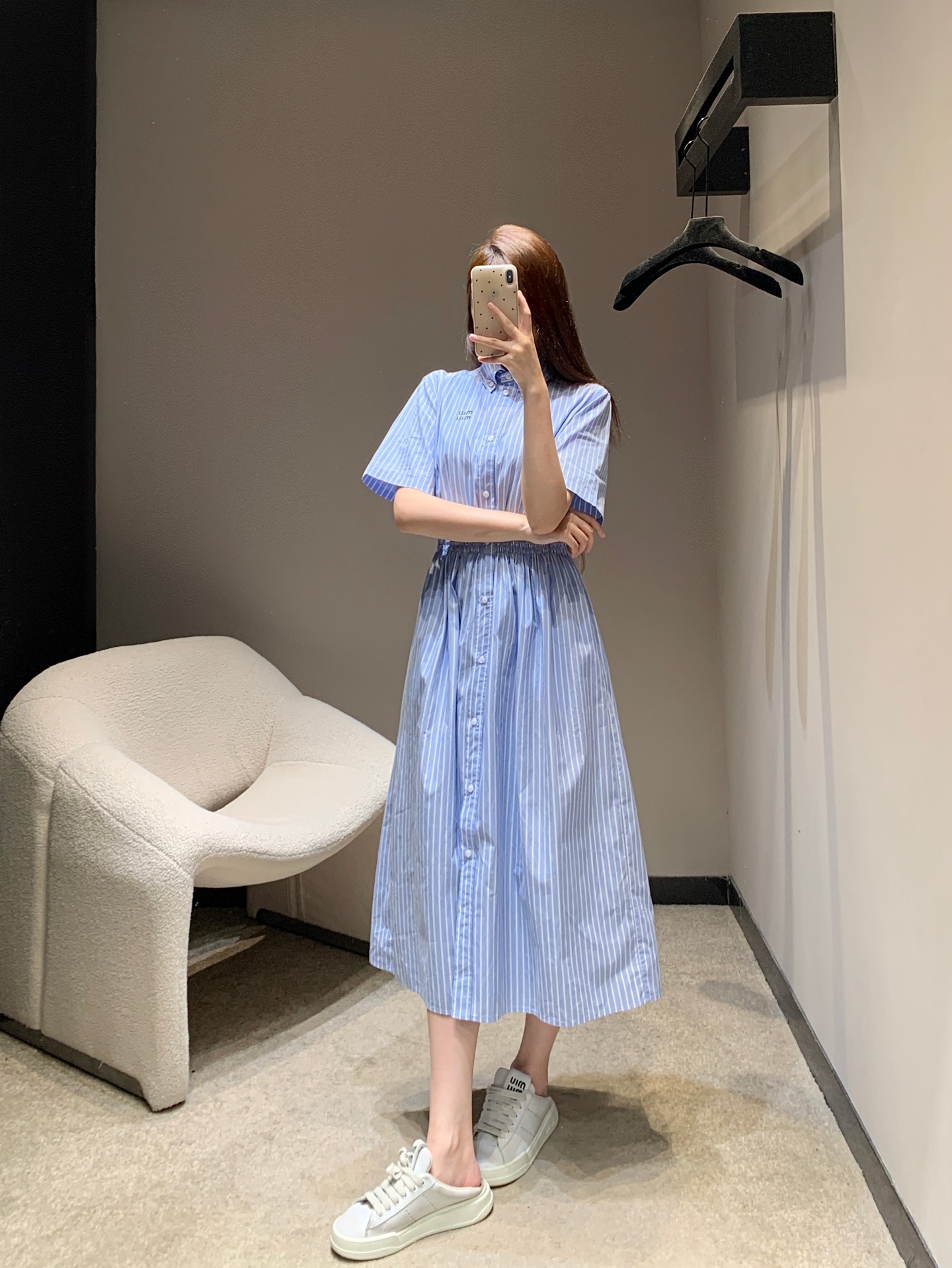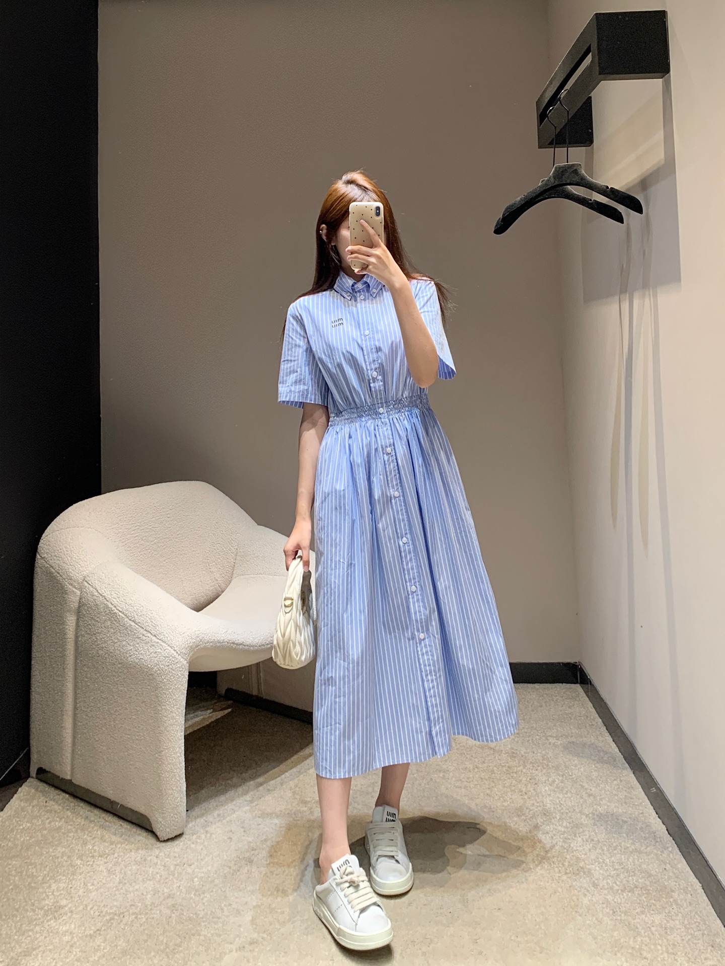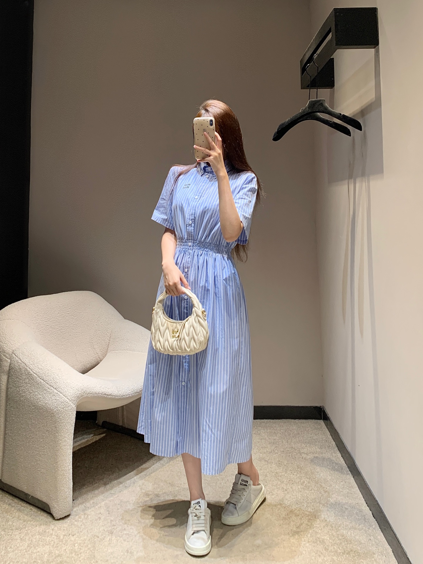 This Miu Miu shirtdress combines classic design with modern comfort, perfect for any occasion. Its striped pattern and elastic waist create a flattering silhouette that's both stylish and comfortable.
