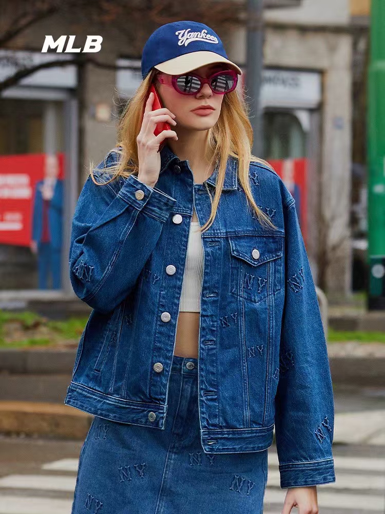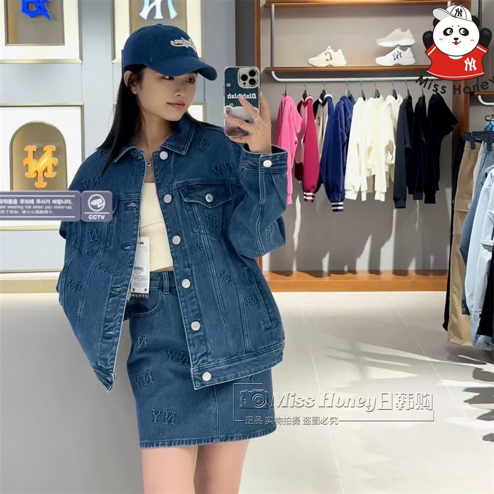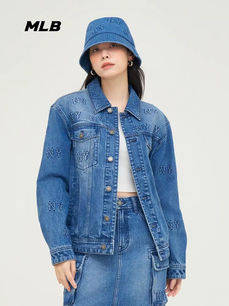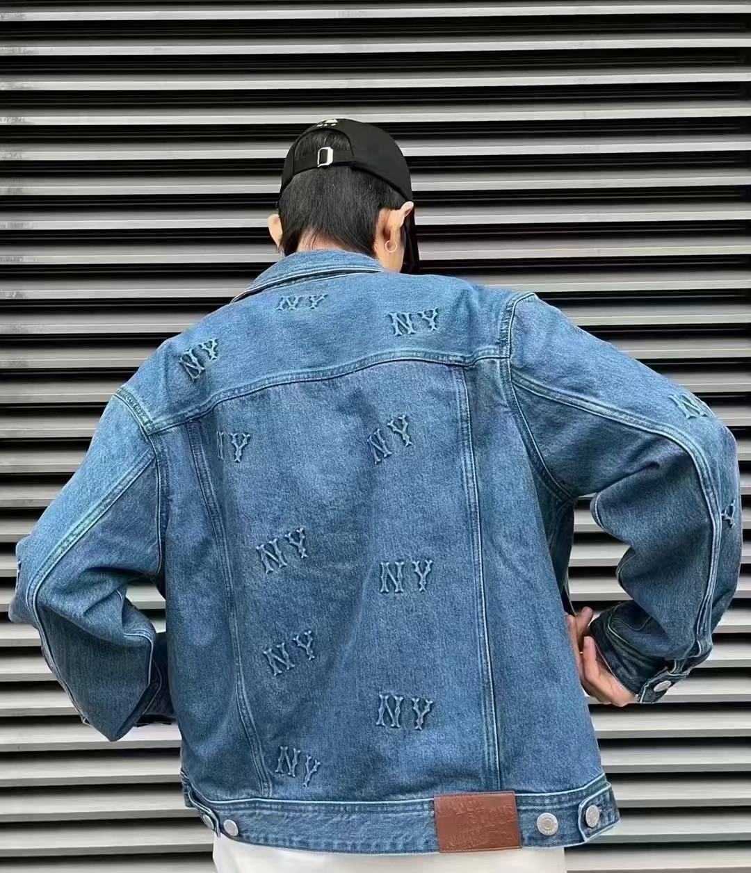 Elevate your style with this MLB NY jacquard denim jacket. Perfect for all seasons and suitable for both men and women.