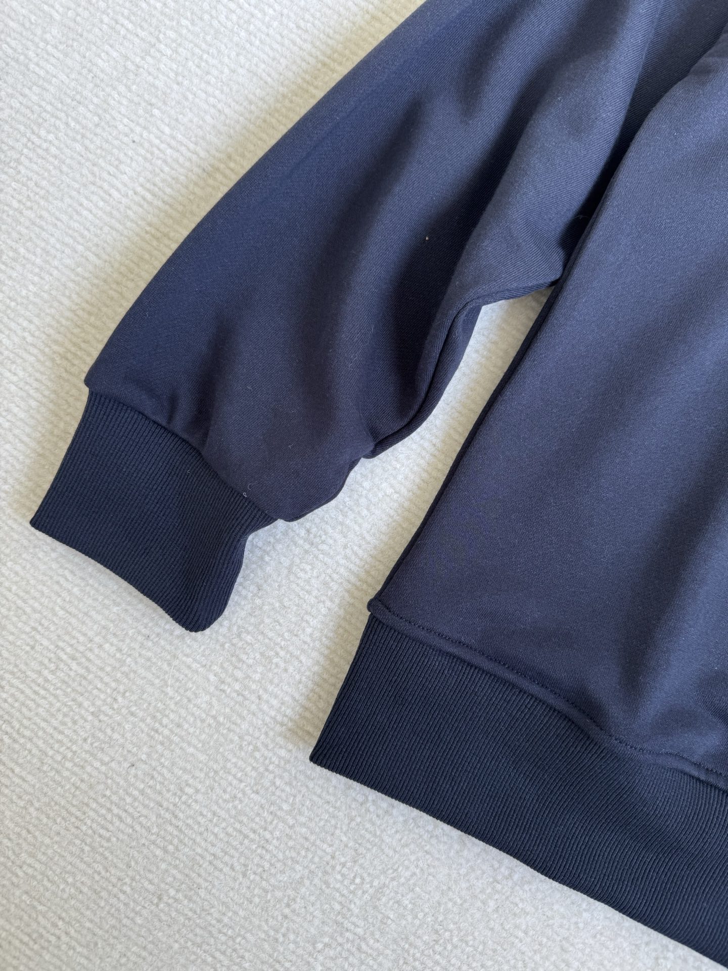 - Ribbed Details: Custom horizontal-cut ribbed cuffs and hem provide a snug, refined fit.