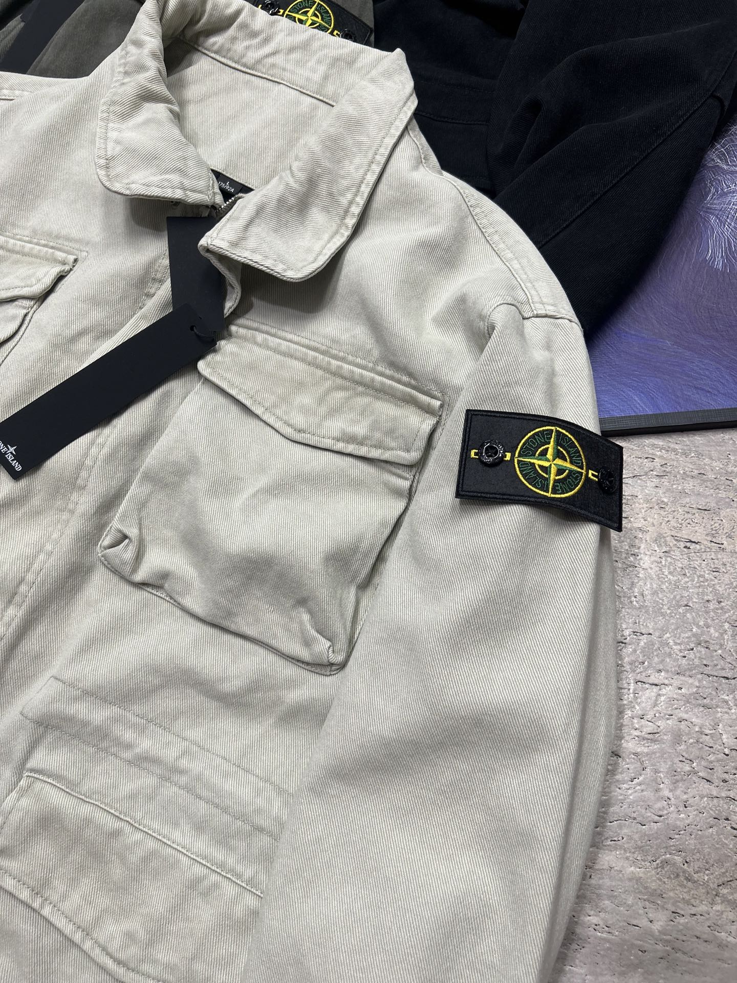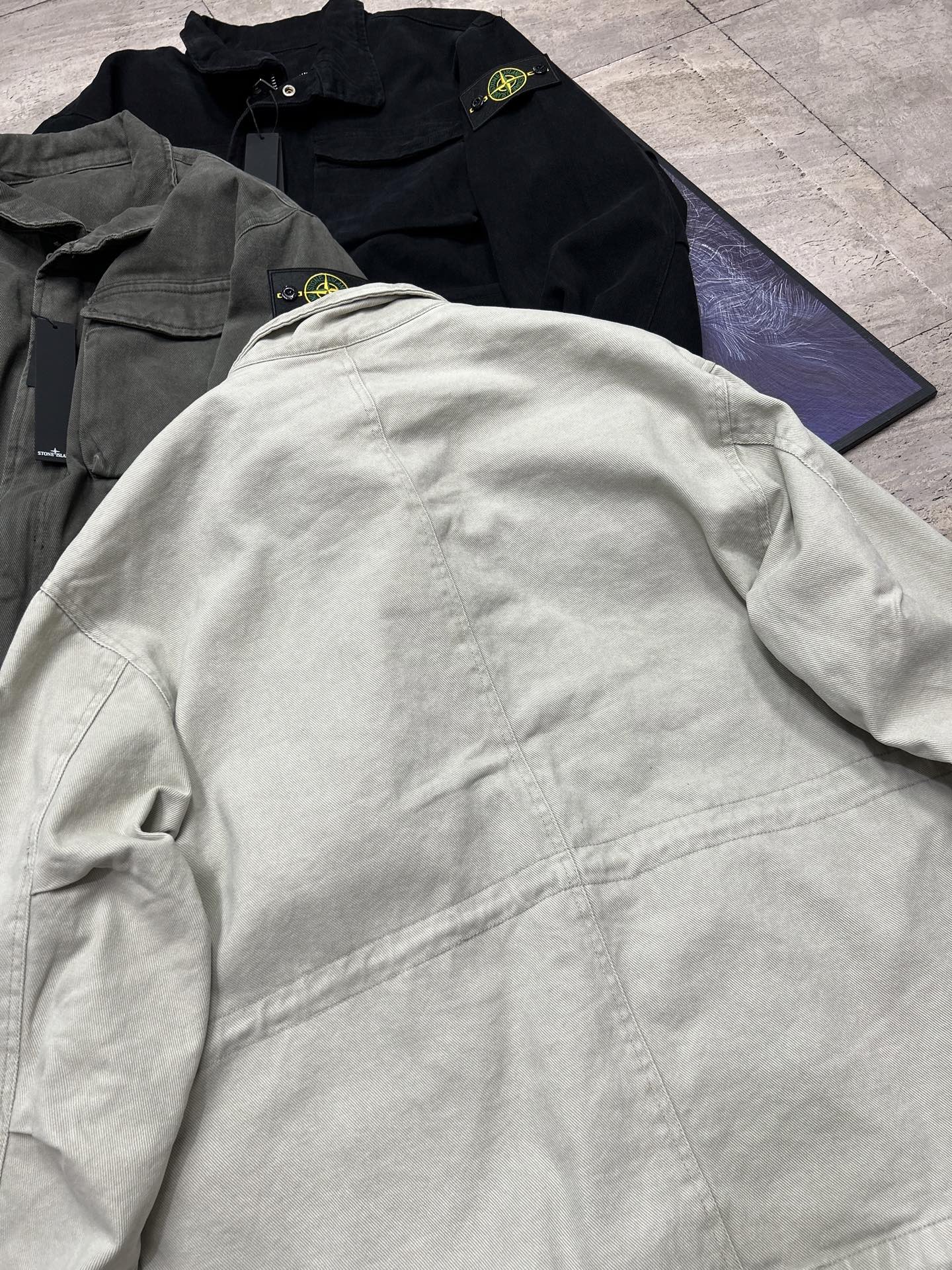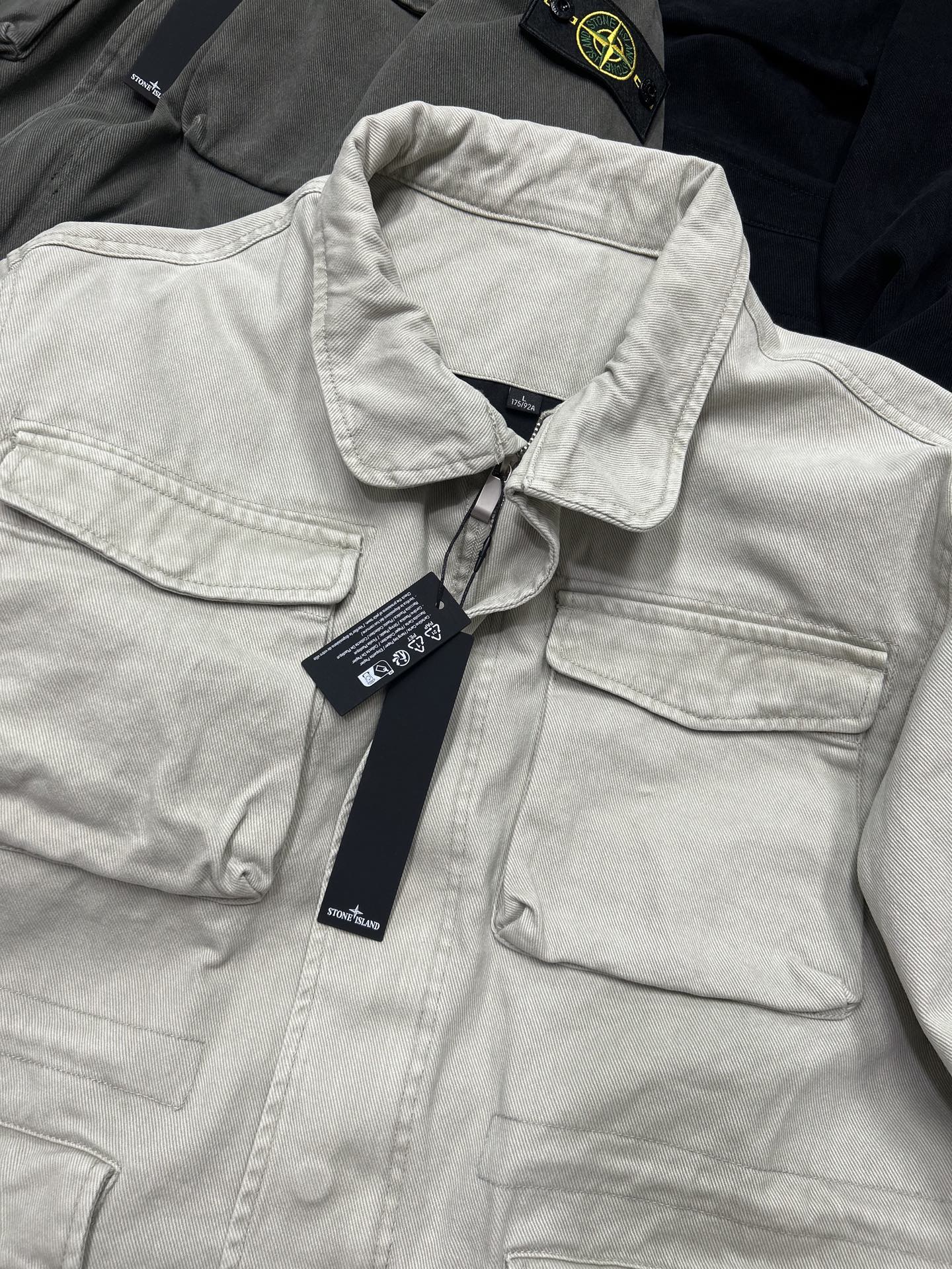 The Stone Island 2025SS Jacket features a deconstructed collar, canvas material, and multiple pockets. Available in beige, black, and green. Perfect for pairing.