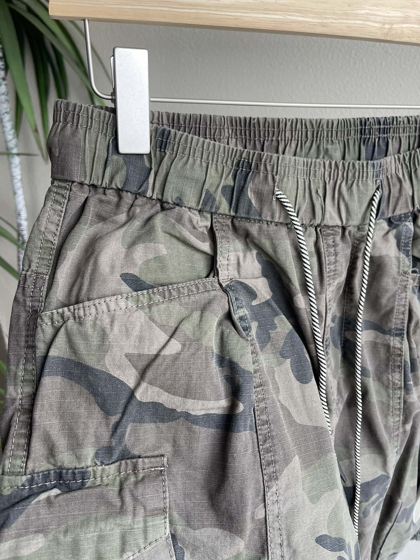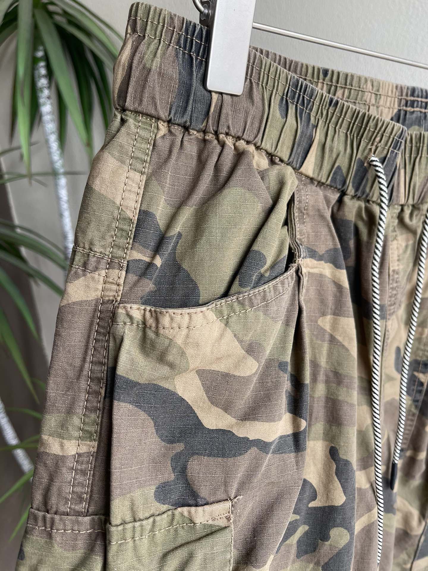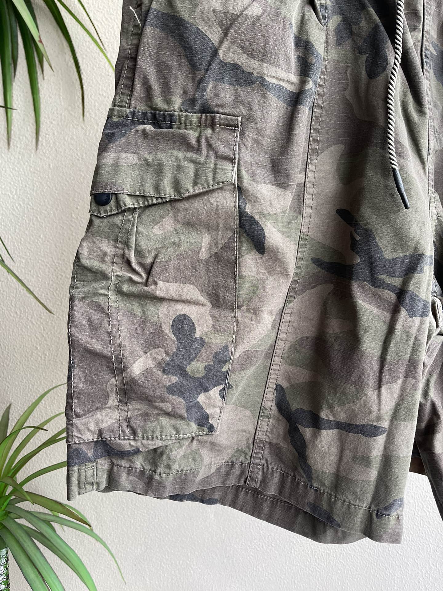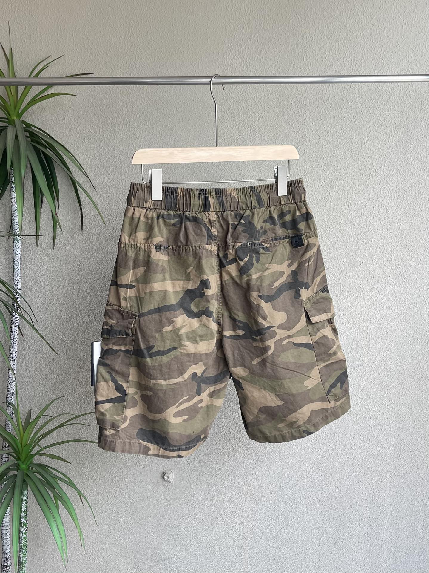 Elevate your summer style with these Stone Island camo cargo shorts. Featuring a drawstring waist, vintage wash, and practical side pockets.