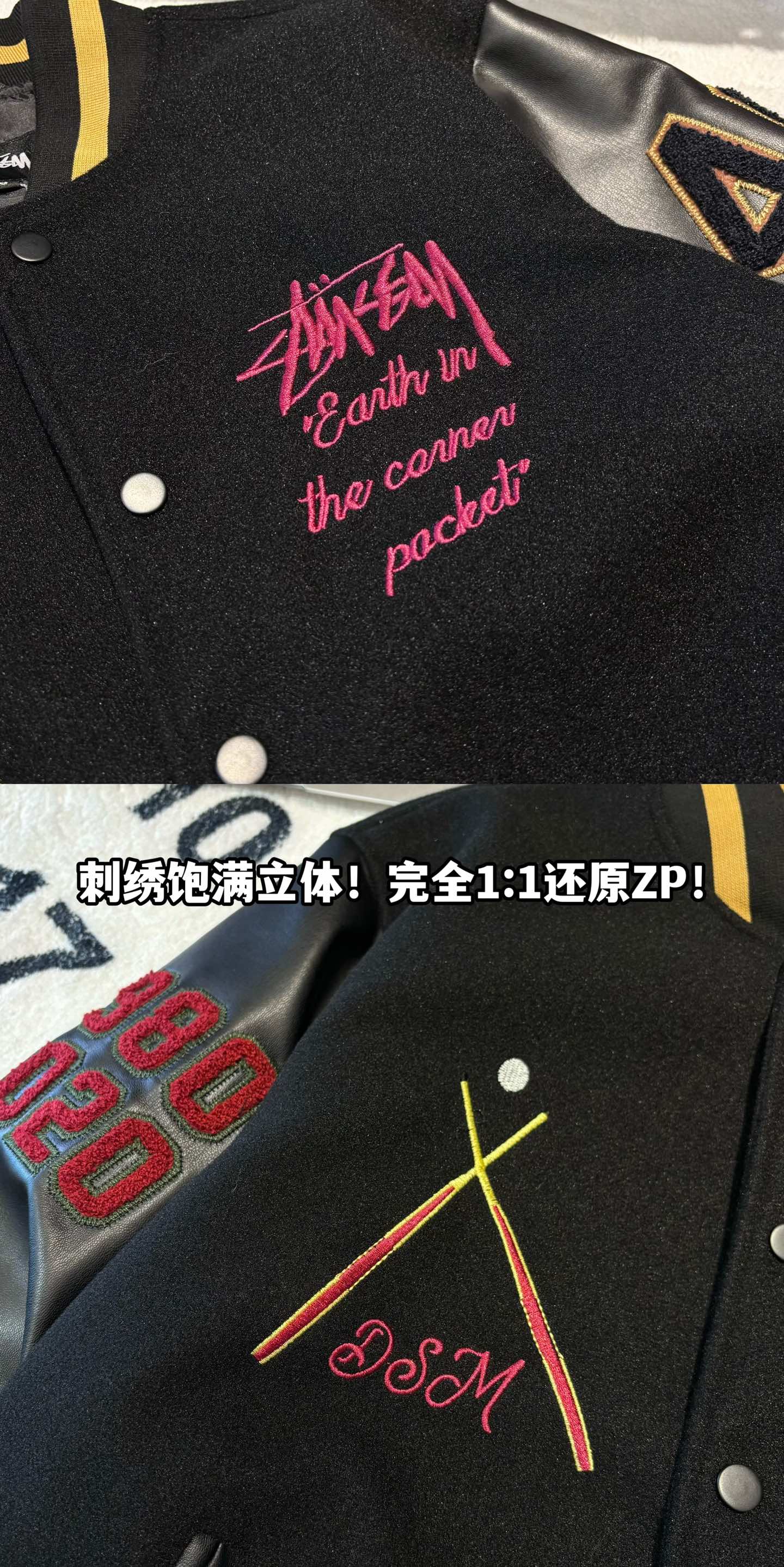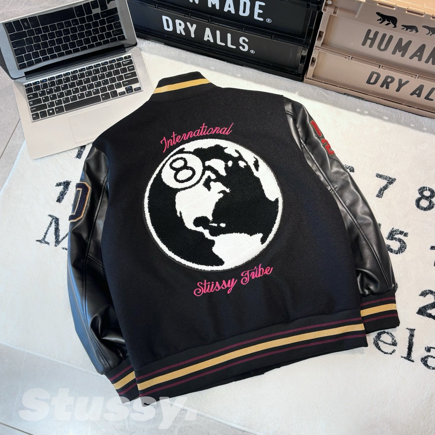 Limited edition Stussy varsity jacket featuring black 8-ball design and leather sleeves. Original fabric and trims with precise detailing.