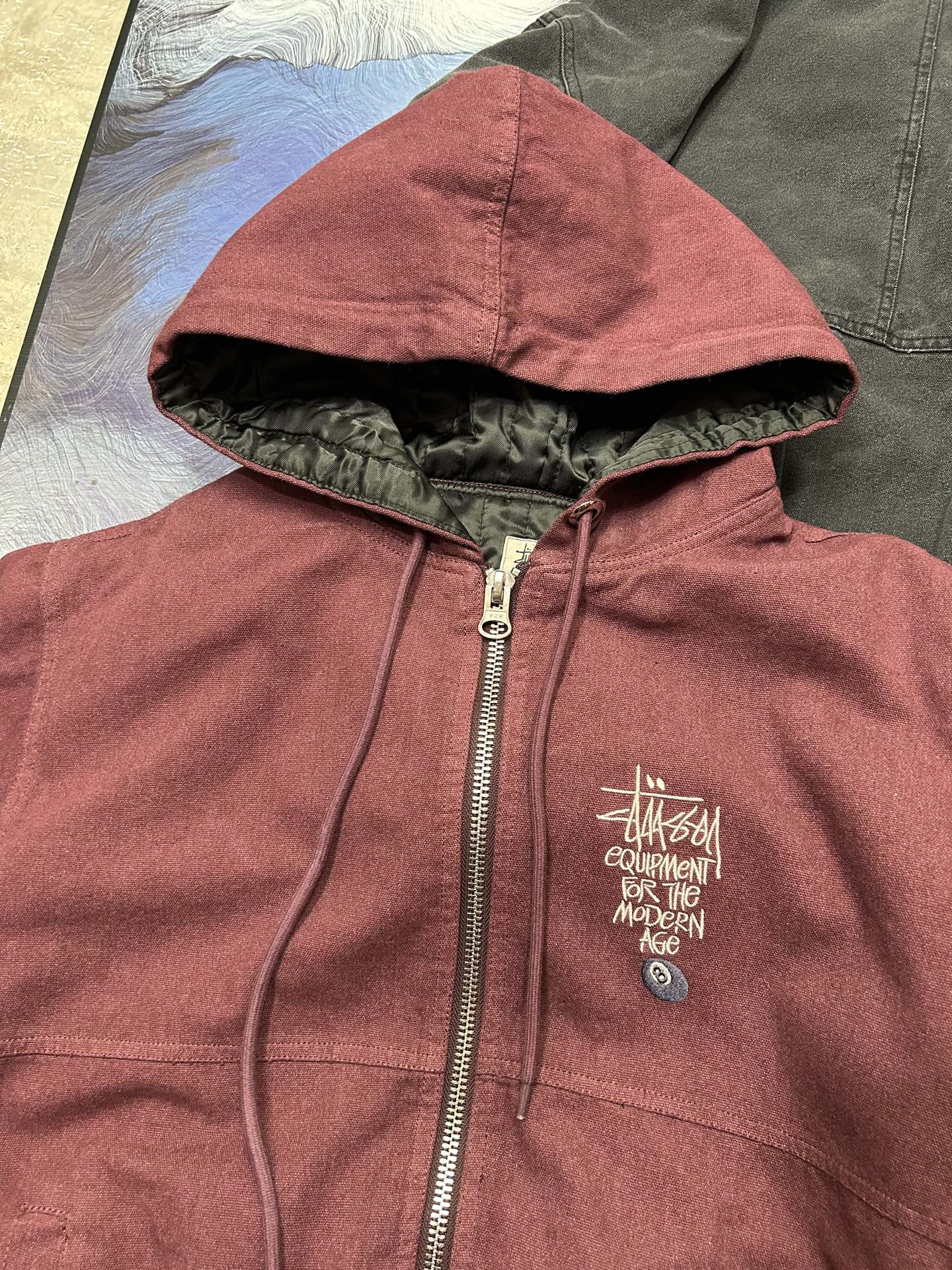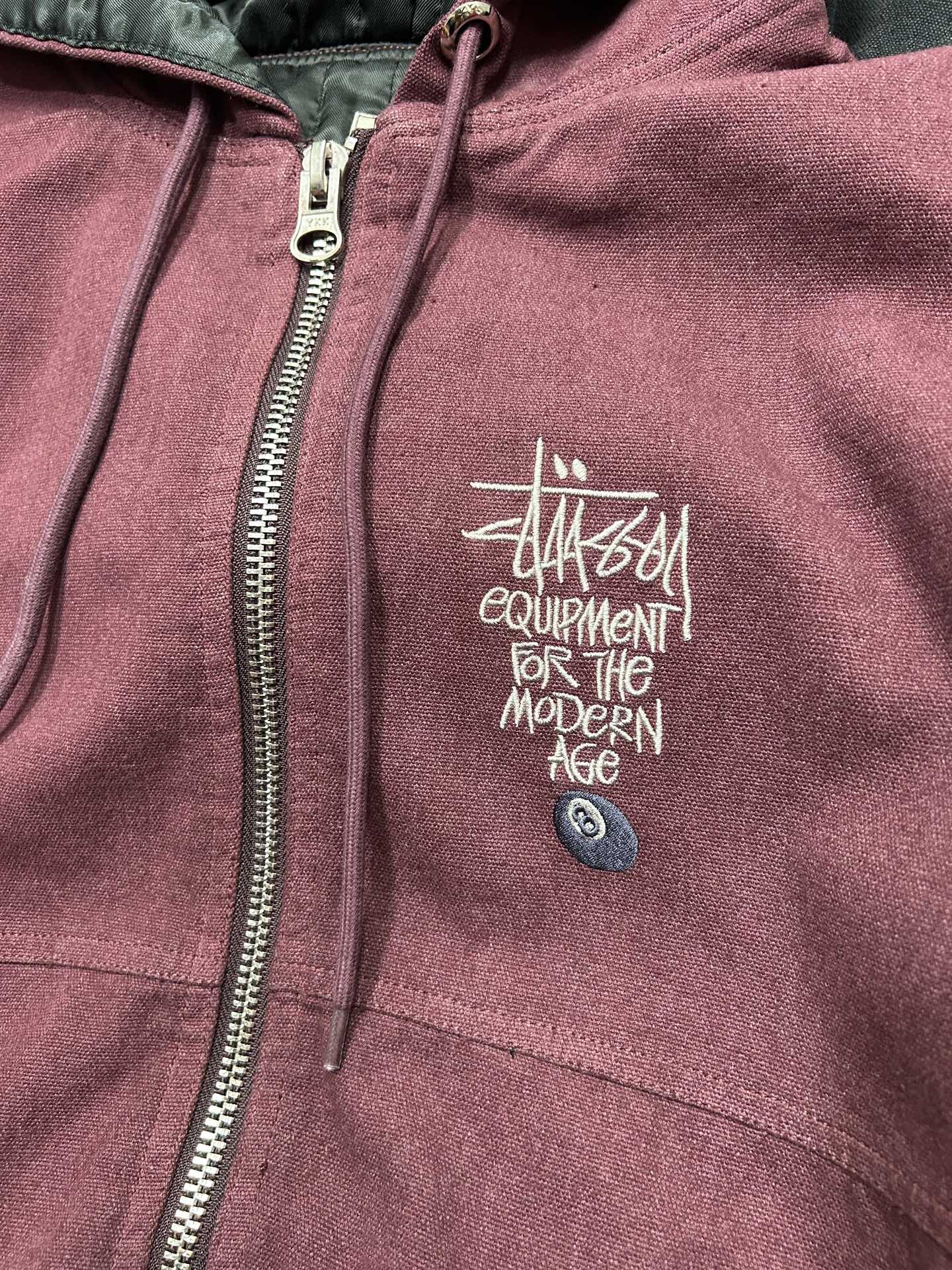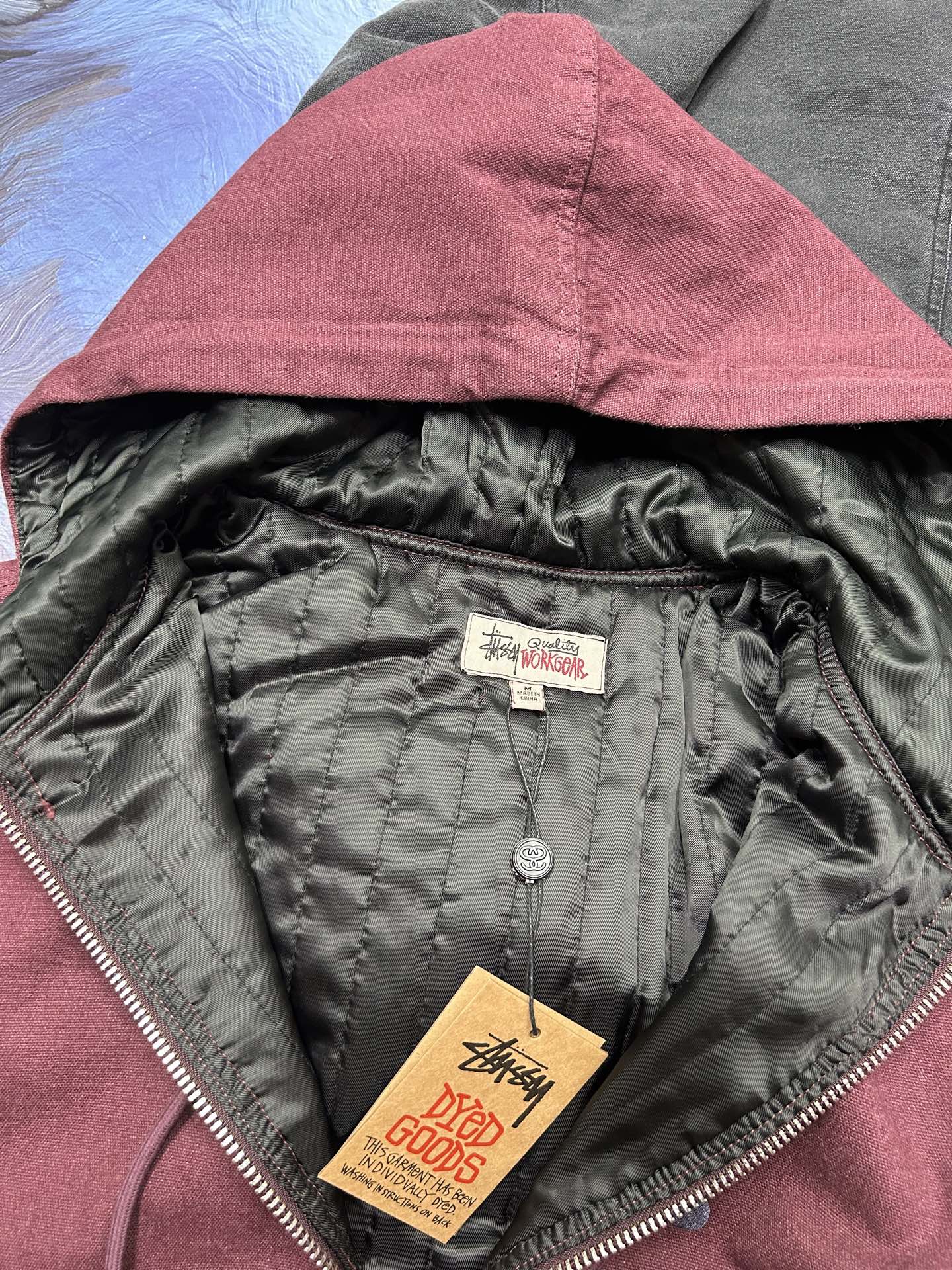 Stay warm and stylish with this Stussy insulated work jacket. Features include a quilted satin lining, YKK metal zipper, and an embroidered logo. Perfect for vintage American style.