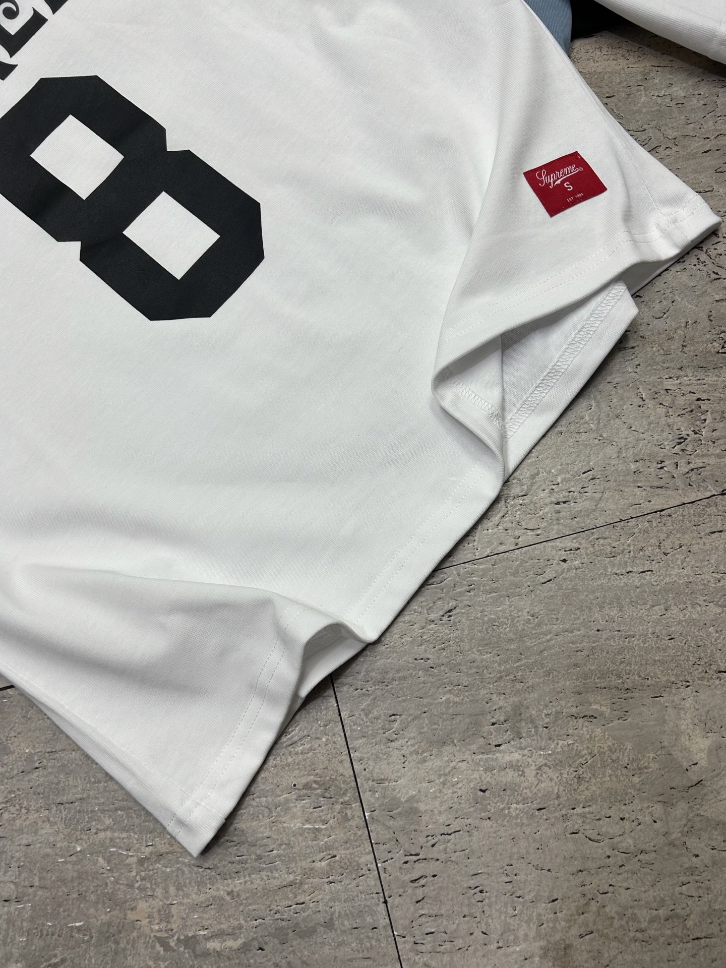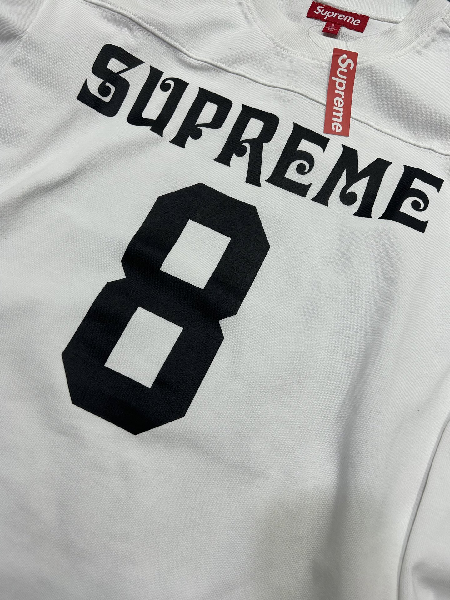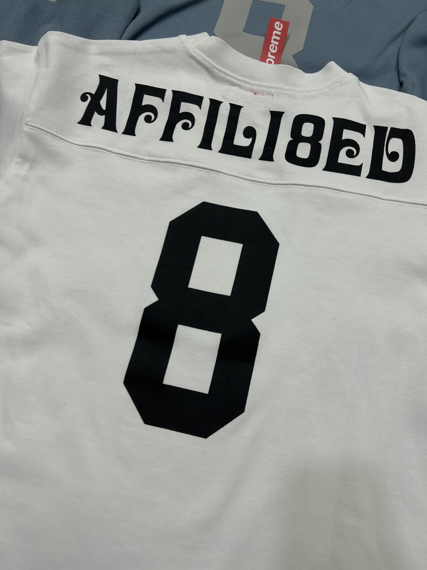 This Supreme SS25 Affiliated L/S Football Top is a standout piece. Featuring US number 8 in a Sanskrit font, this long-sleeve T-shirt blends streetwear aesthetics with unique cultural elements.