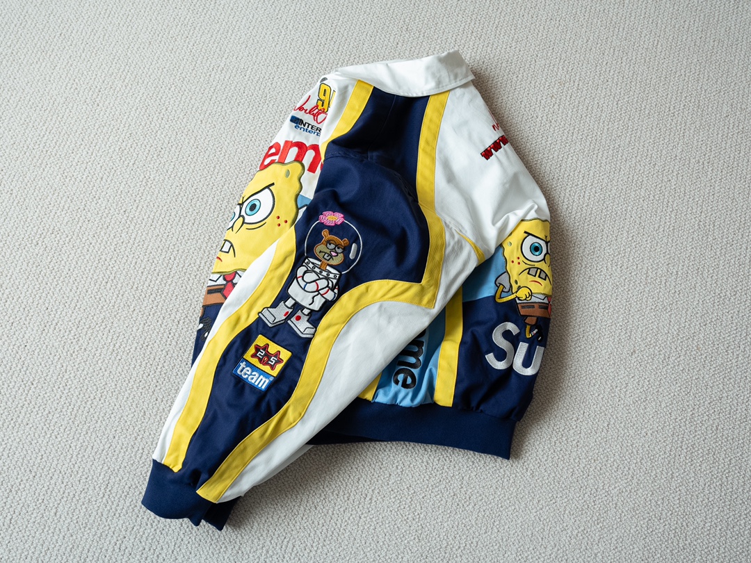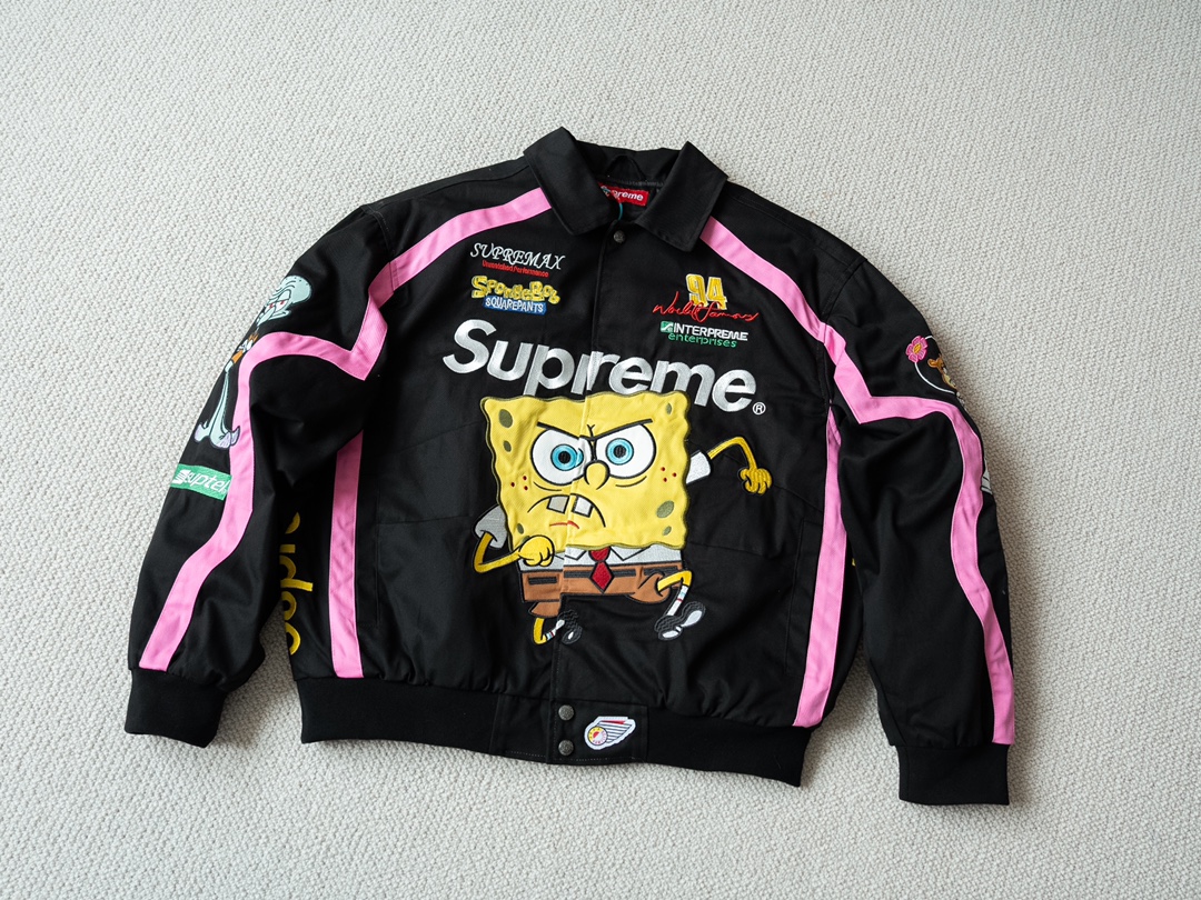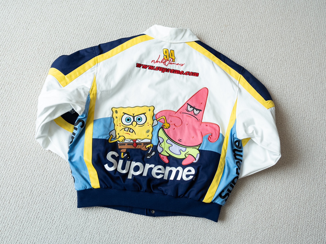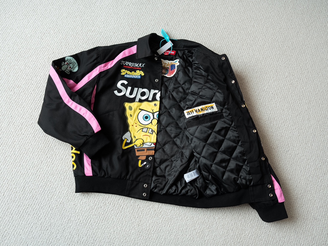 Get the Supreme x SpongeBob x Jeff Hamilton jacket from the SS25 collection. Features cartoon prints, embroidery, and a racing-inspired design.
