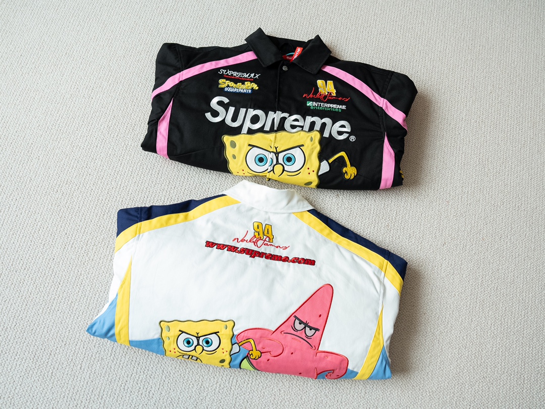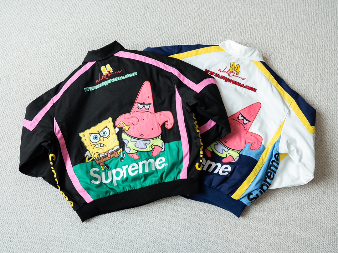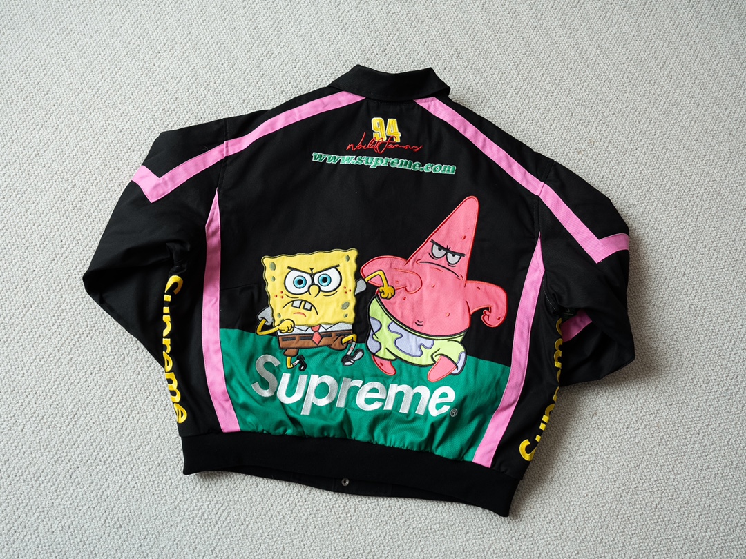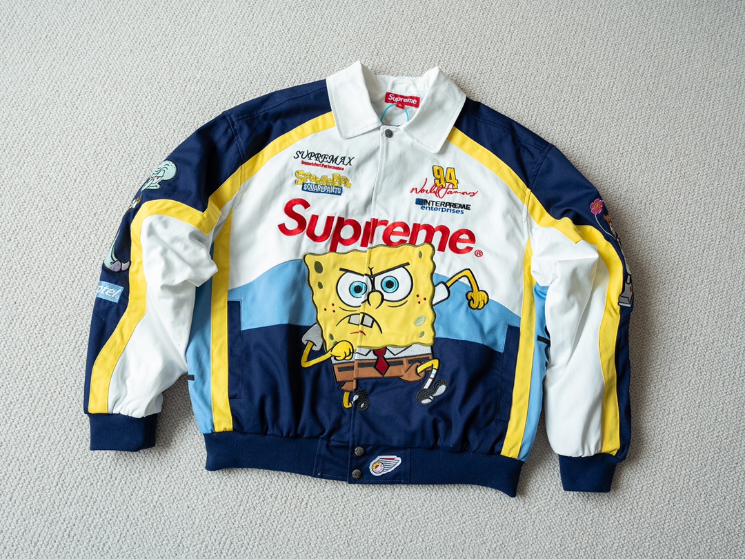 Get the Supreme x SpongeBob x Jeff Hamilton jacket from the SS25 collection. Features cartoon prints, embroidery, and a racing-inspired design.