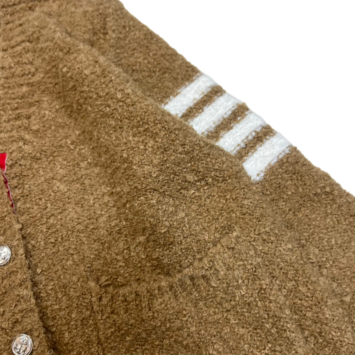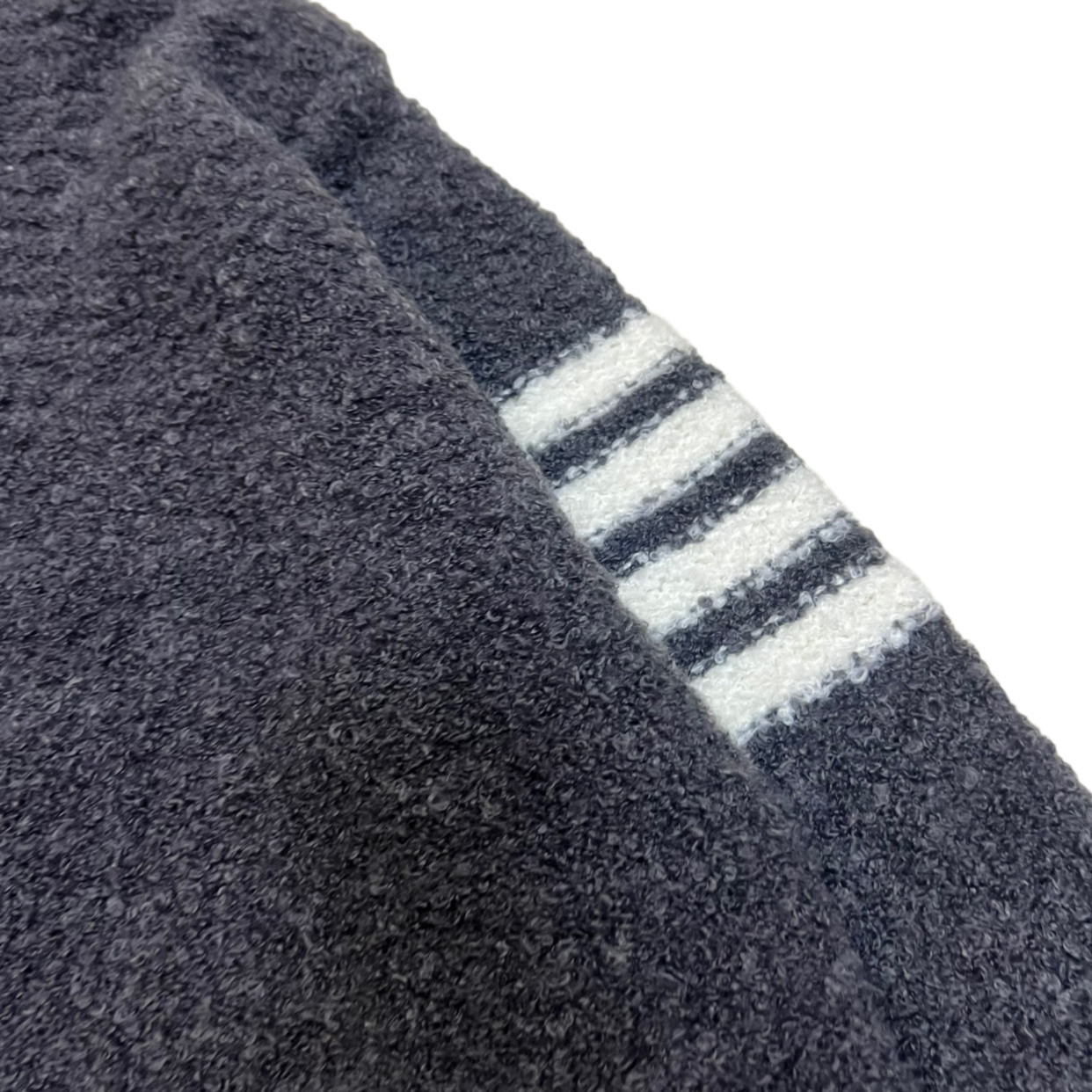 - Features Thom Browne's signature four-bar stripe on the arm.