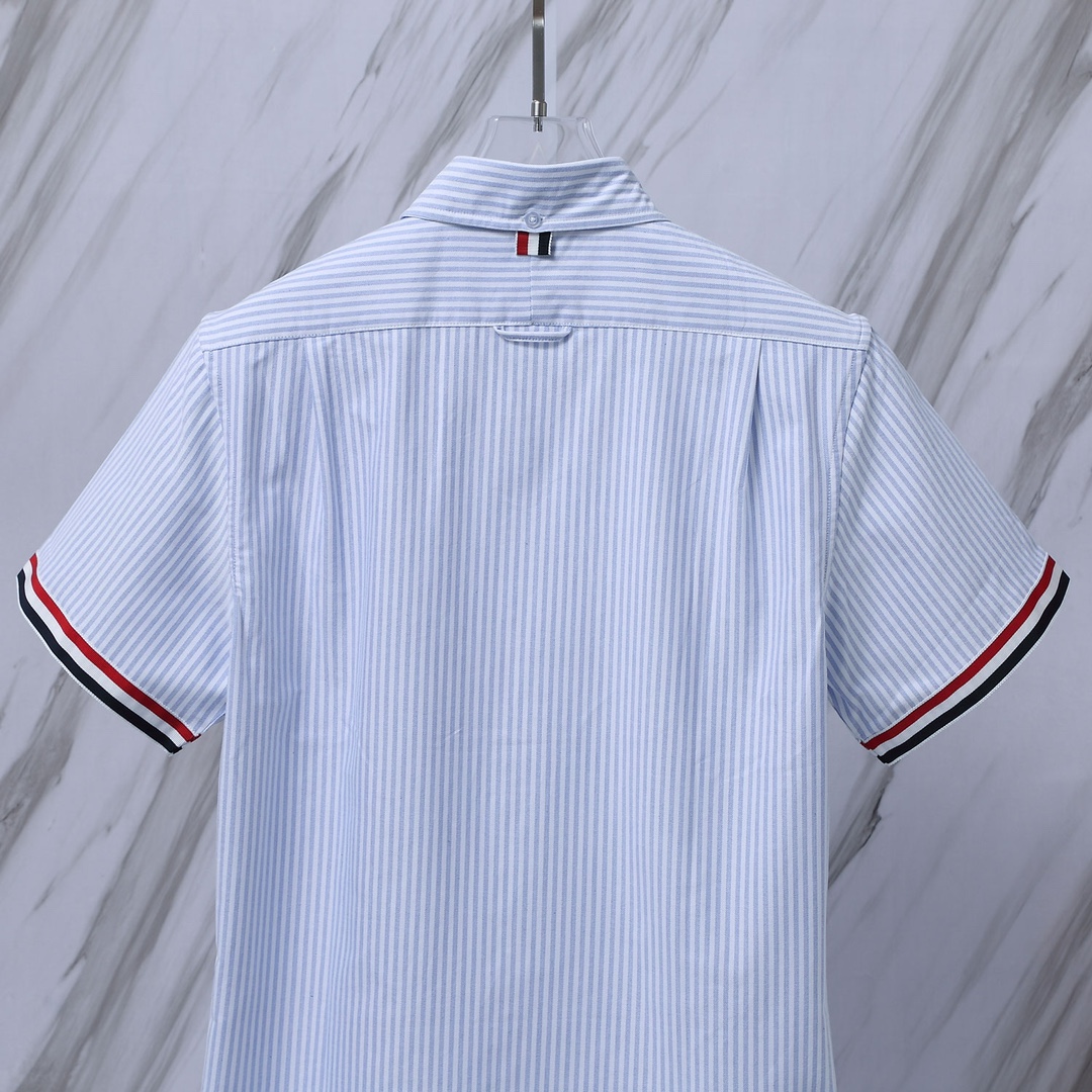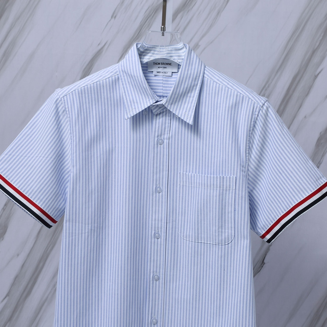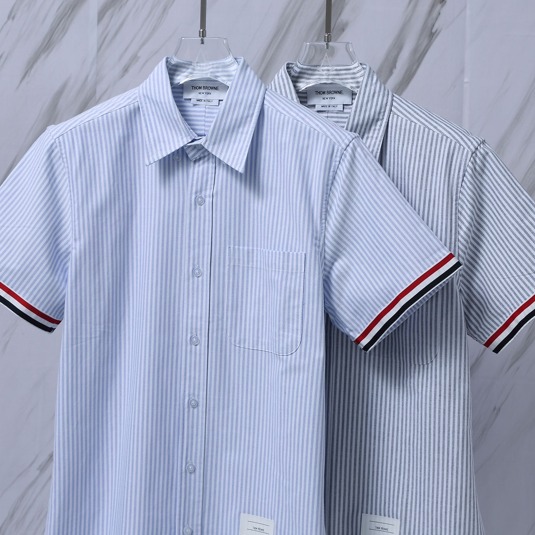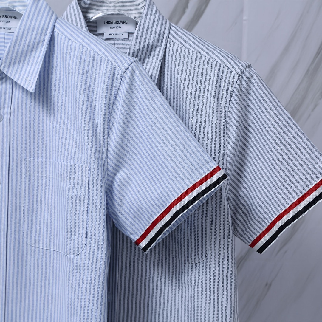 The Thom Browne striped Oxford short-sleeve shirt is a versatile piece that can be dressed up or down. Pair it with chinos or shorts for a casual look, or wear it with dress pants for a more formal occasion.