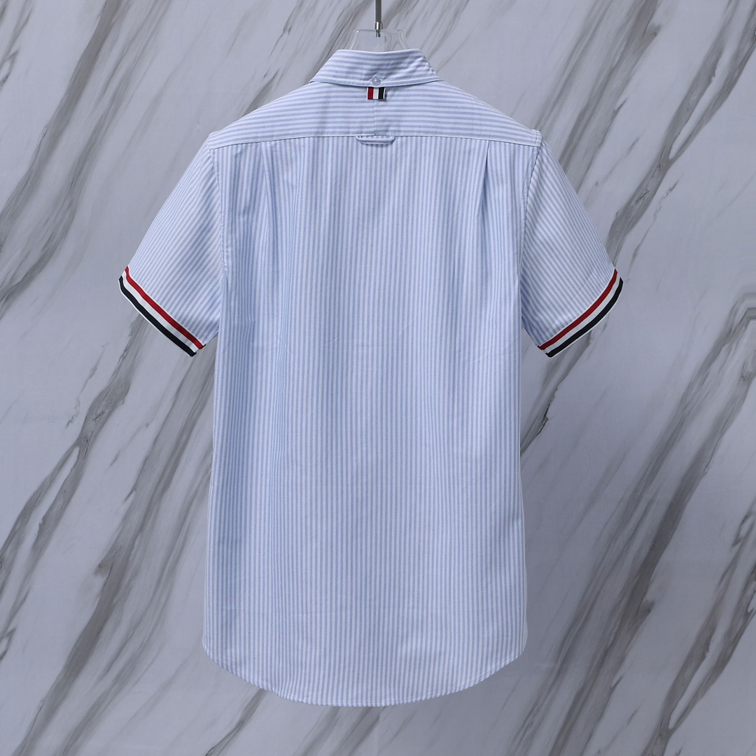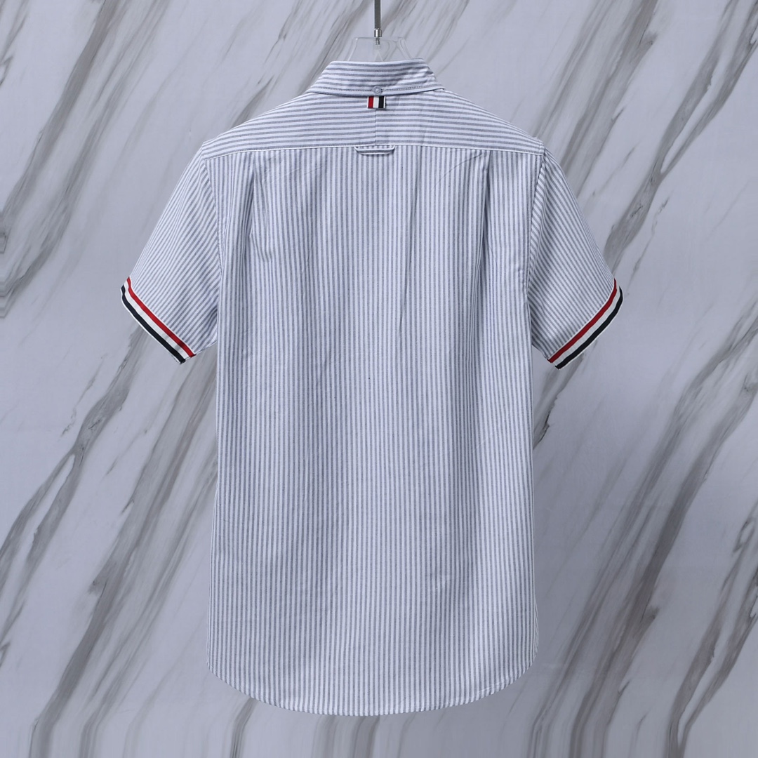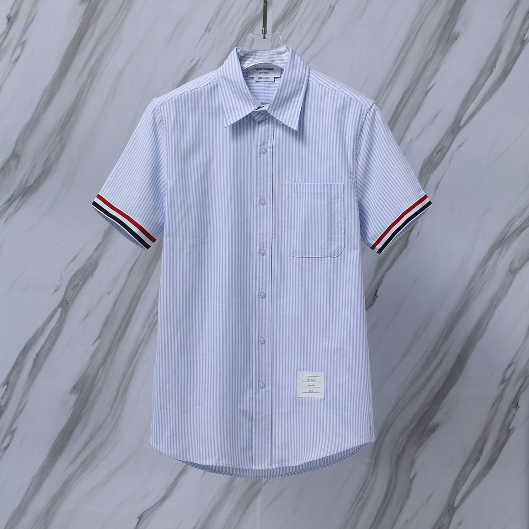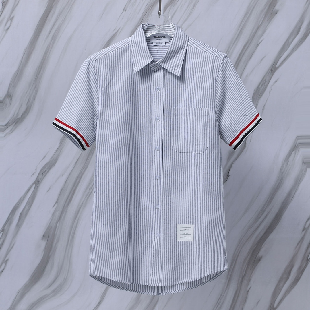 The Thom Browne striped Oxford short-sleeve shirt is a versatile piece that can be dressed up or down. Pair it with chinos or shorts for a casual look, or wear it with dress pants for a more formal occasion.