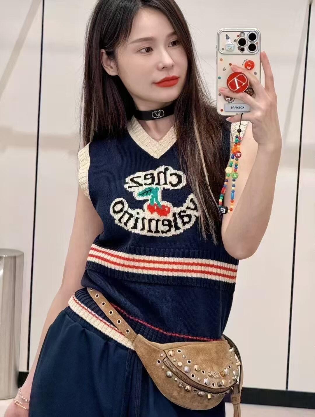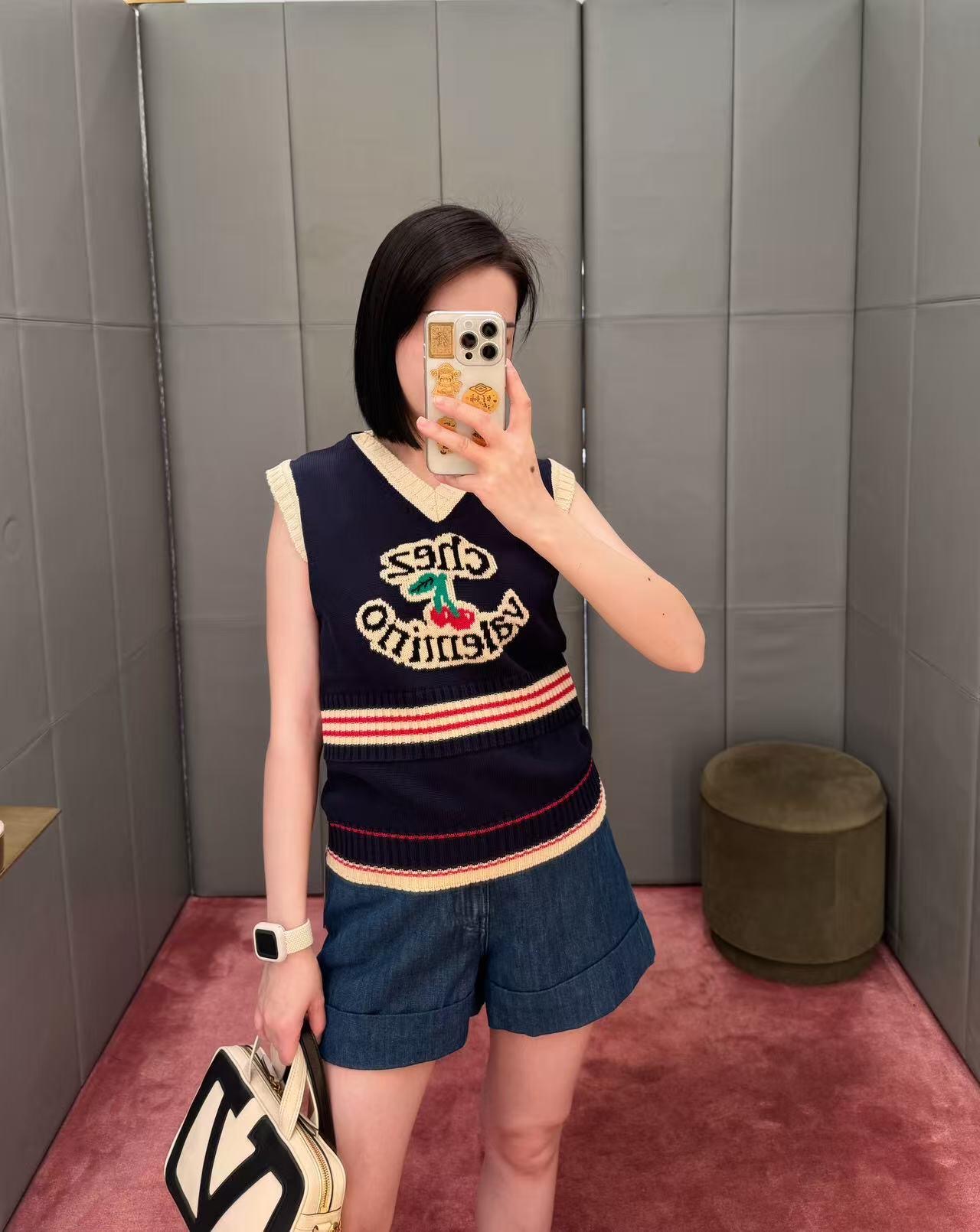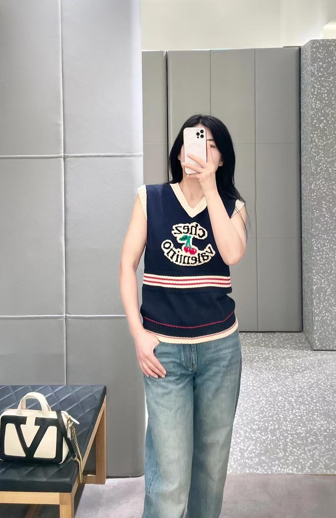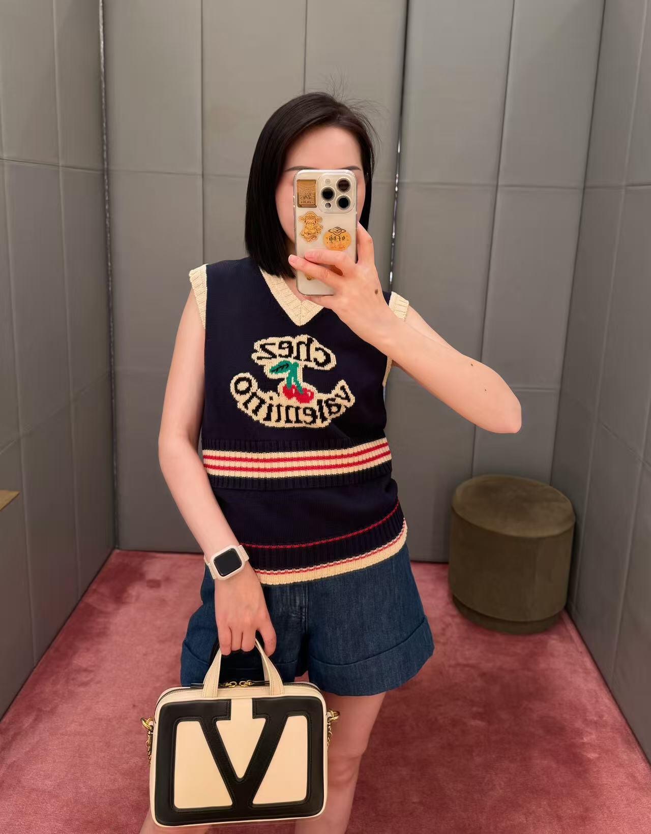 This Valentino V-neck sleeveless knit vest is a must-have for adding a touch of freshness to your summer style. The cherry and letter pattern on the chest adds a playful and fashionable element, while the soft knit fabric ensures a comfortable wearing experience.