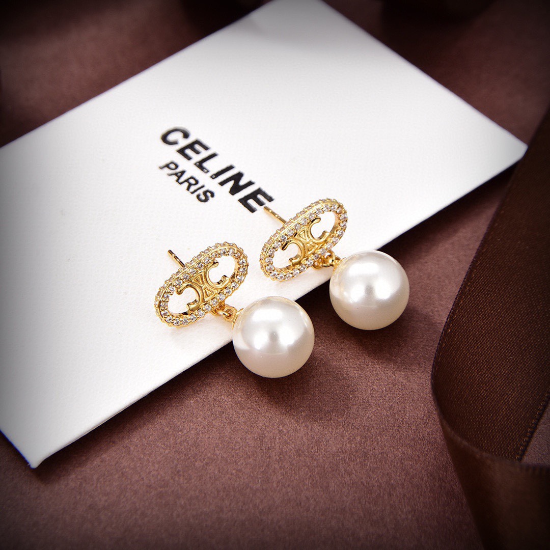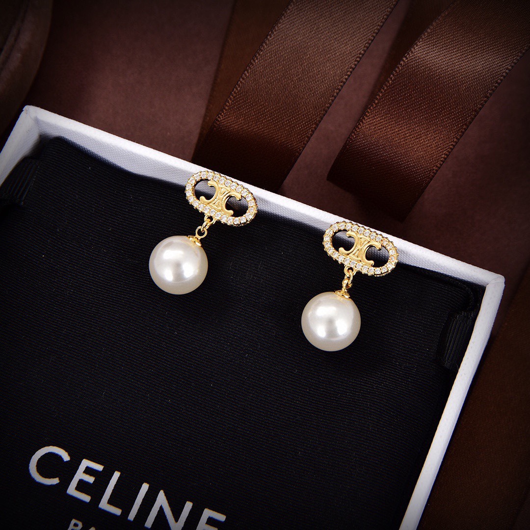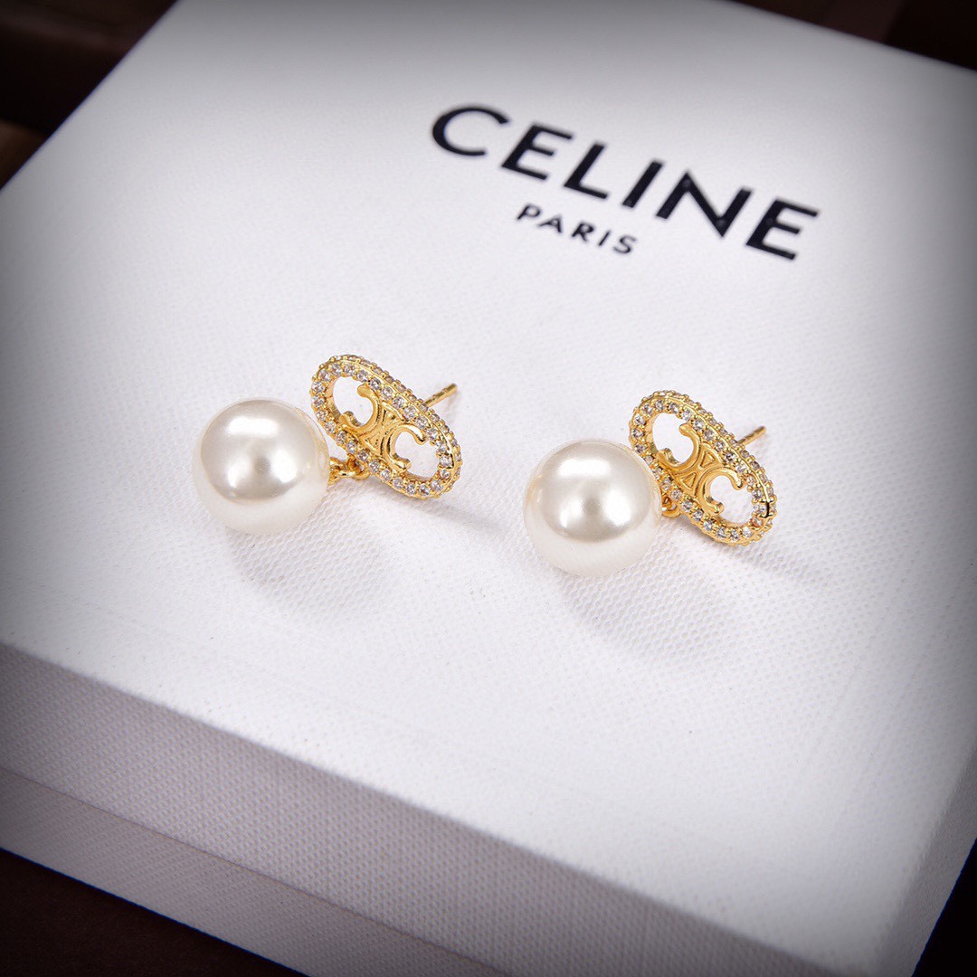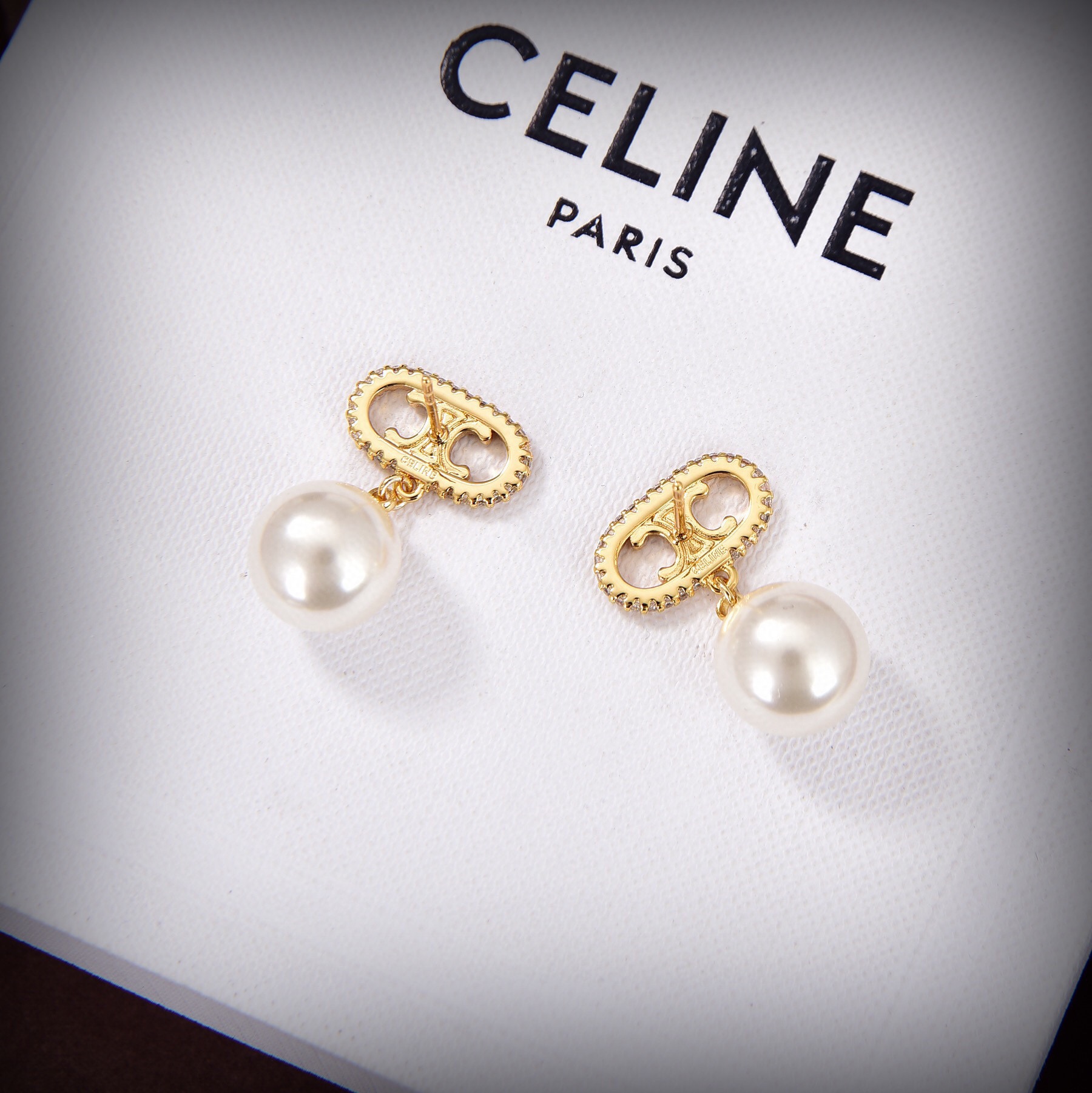 Elevate your style with these Celine earrings. Featuring a pearl drop and gold-tone finish for a touch of luxury and chic. Perfect for any occasion.