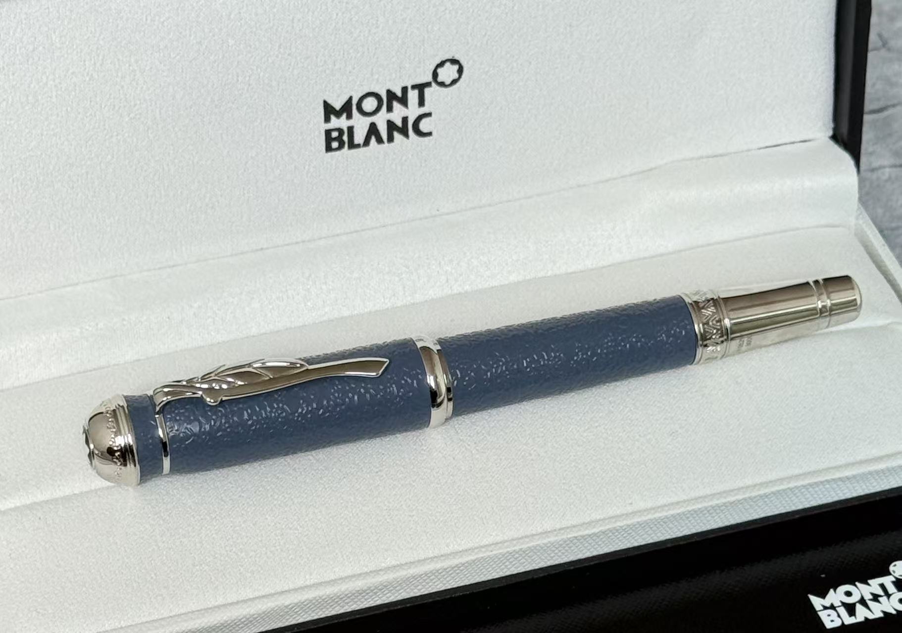 Experience the art of writing with this Montblanc Classique fountain pen. Features a blue resin barrel, silver accents, and smooth writing experience.