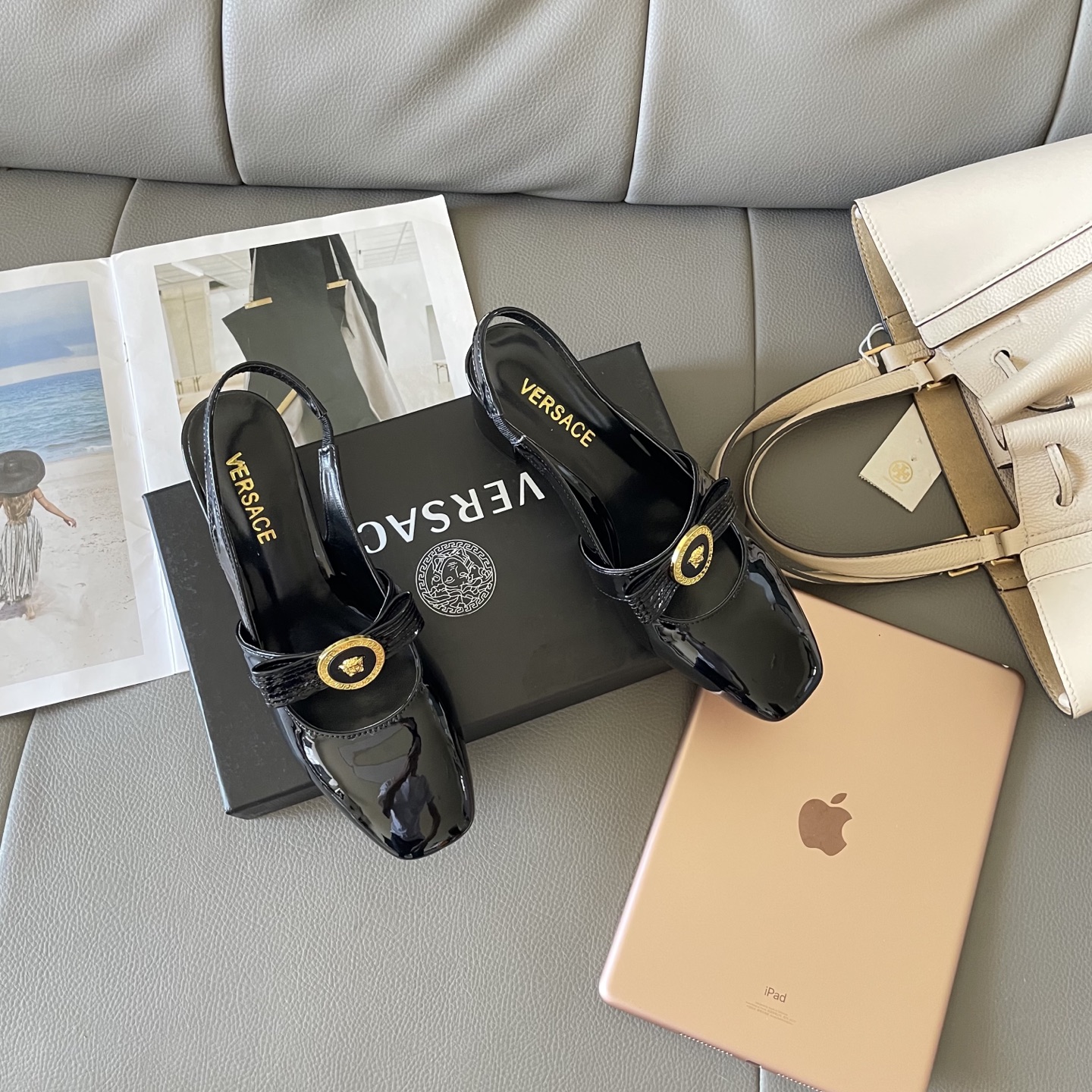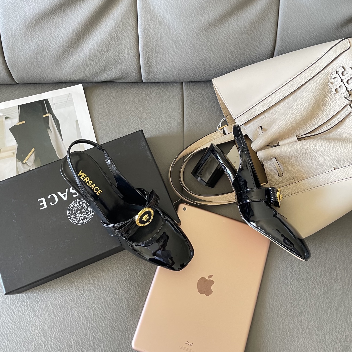 Step out in style with Versace's Mary Jane slingbacks. Crafted from black patent leather, these heels feature the iconic Medusa detail and a comfortable 7cm heel height.