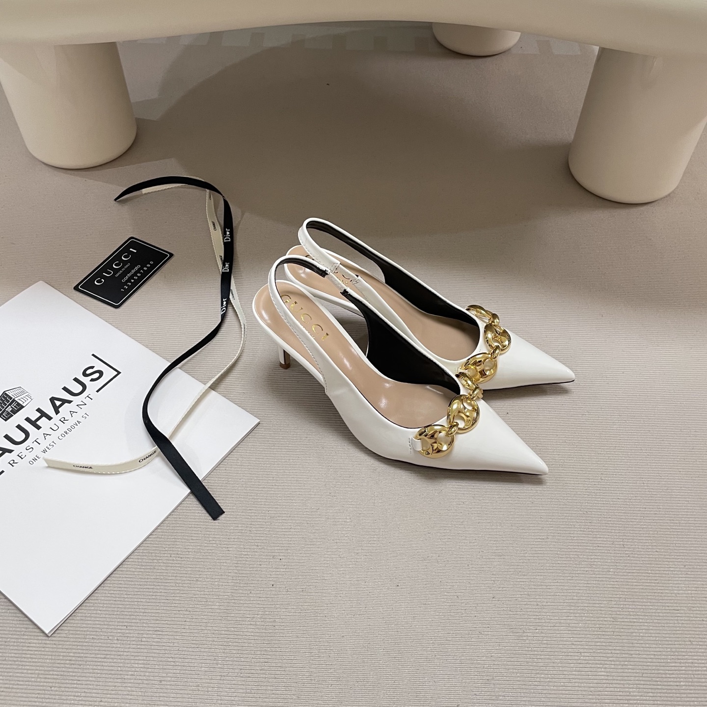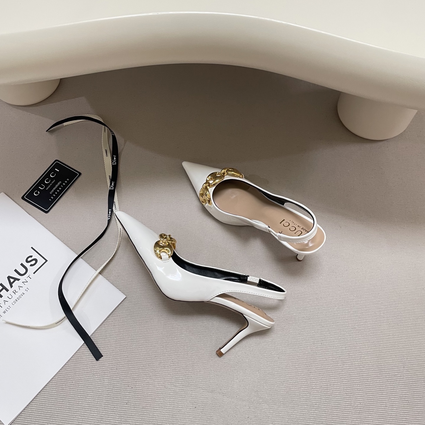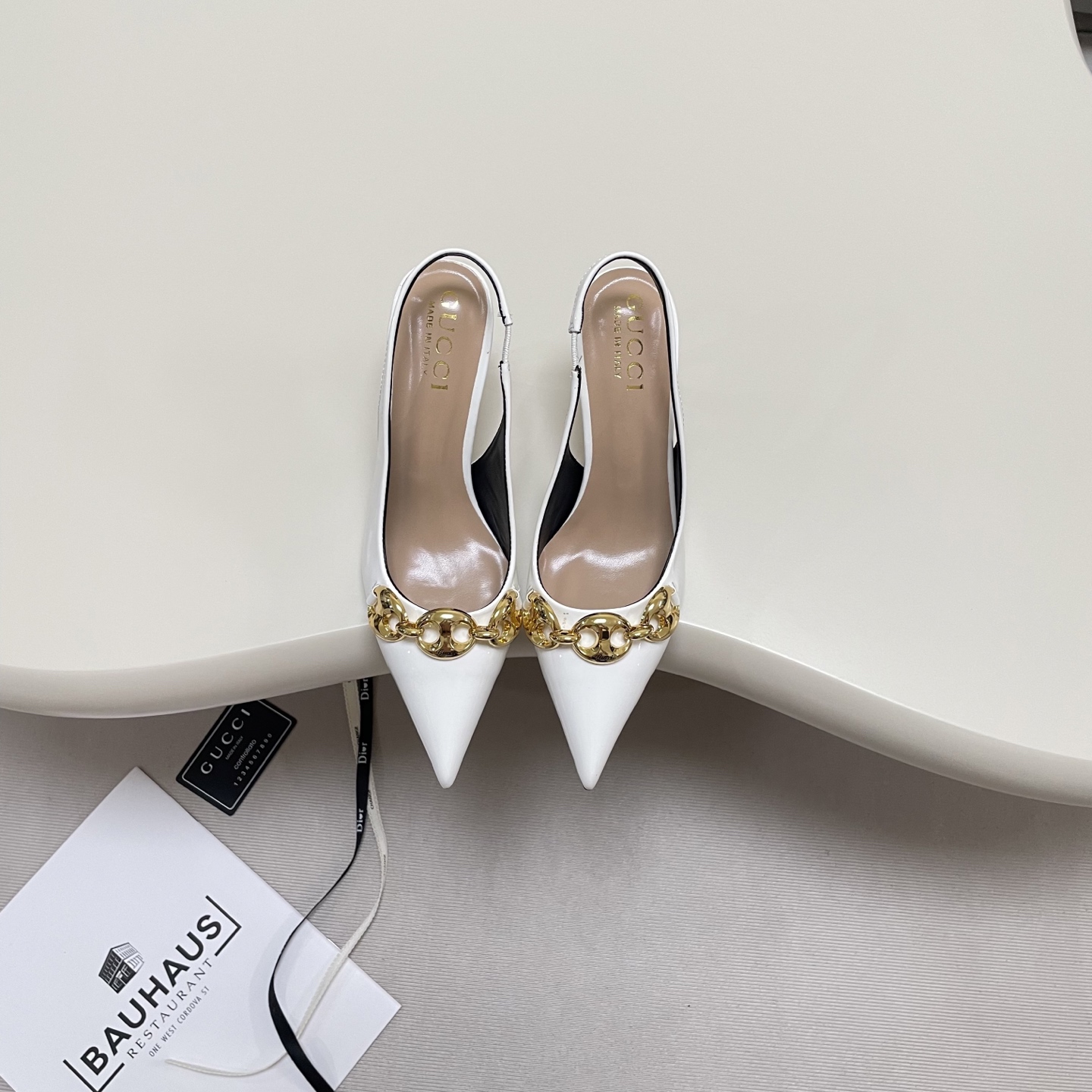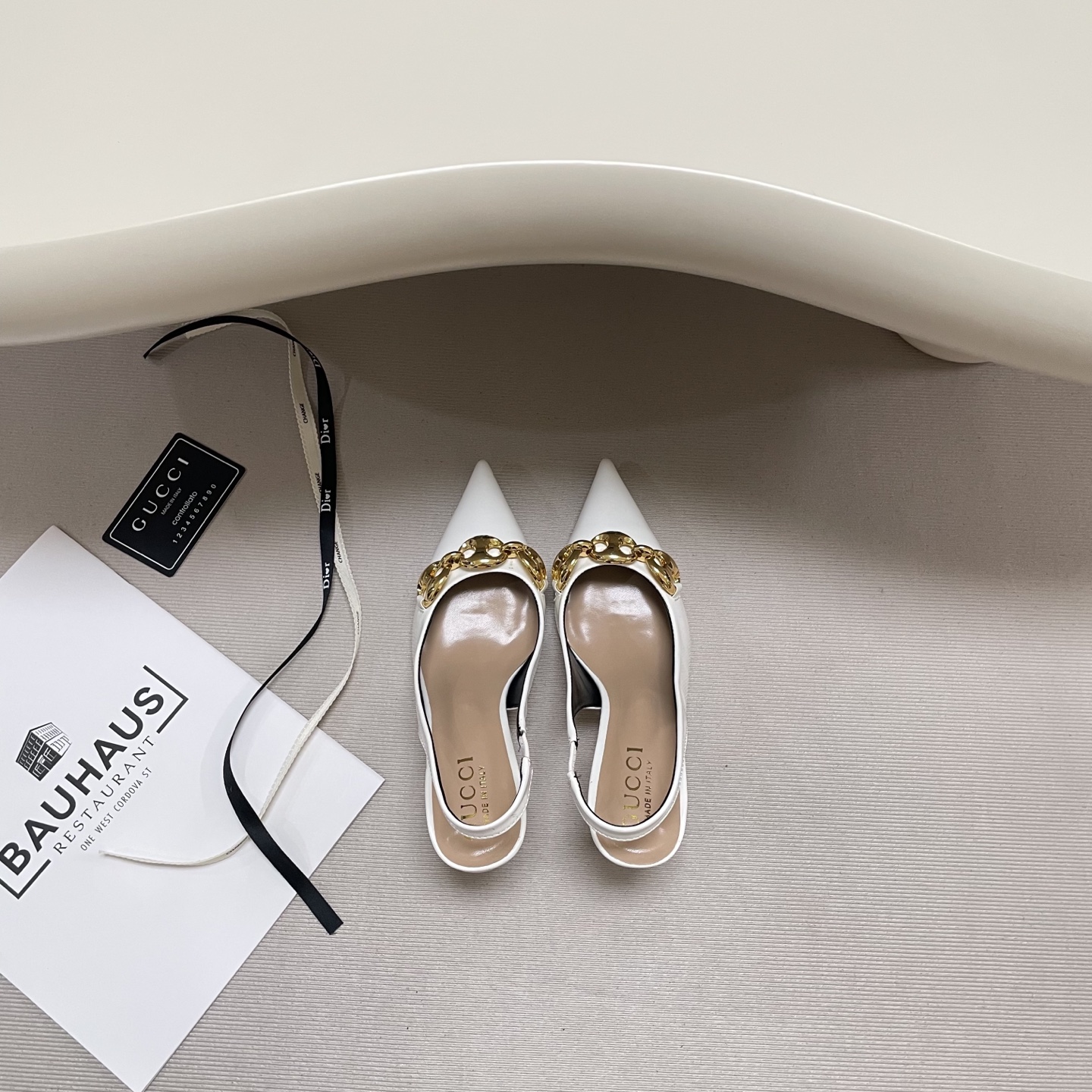 Gucci White Leather Slingback Pumps with Gold Chain Detail - Pointed Toe