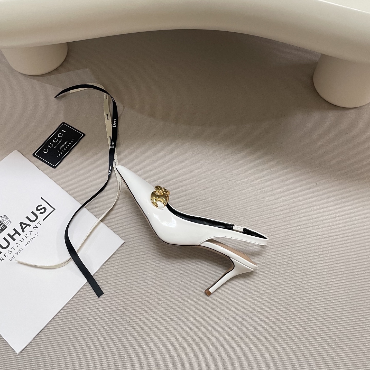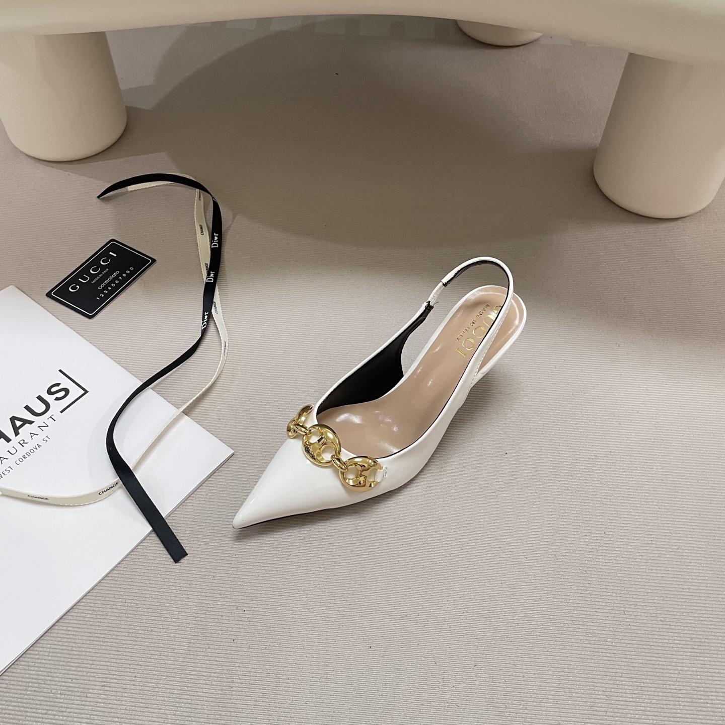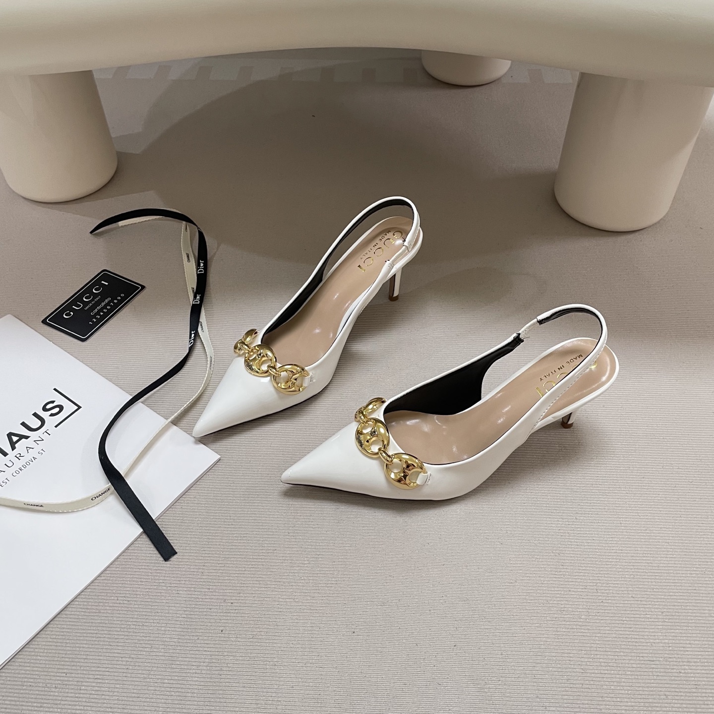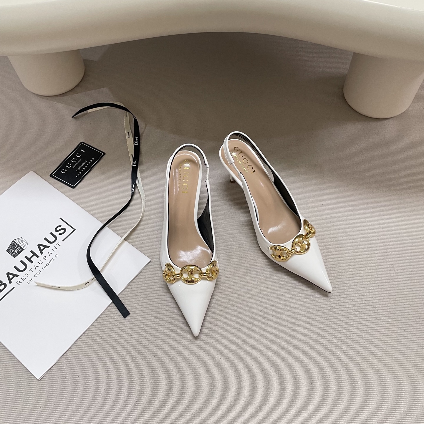 Gucci White Leather Slingback Pumps with Gold Chain Detail - Pointed Toe