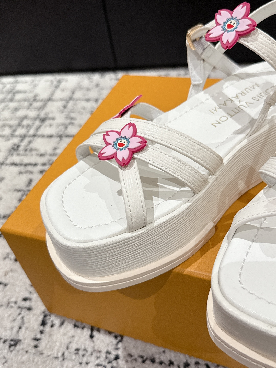 Louis Vuitton Maya Flatform Sandals - White Leather & Denim with Flower Detail
