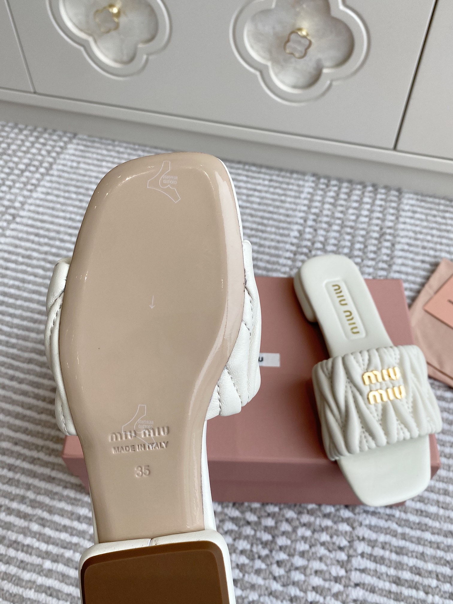 Step into luxury with these Miu Miu flat sandals. Crafted from soft lambskin with a signature quilted design, offering both style and comfort.