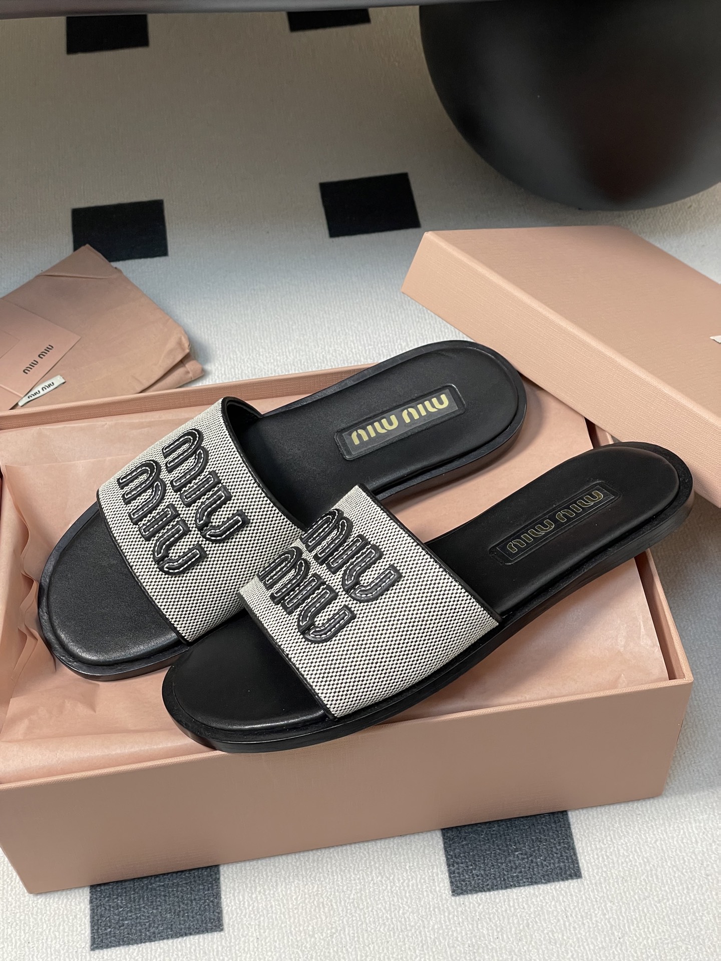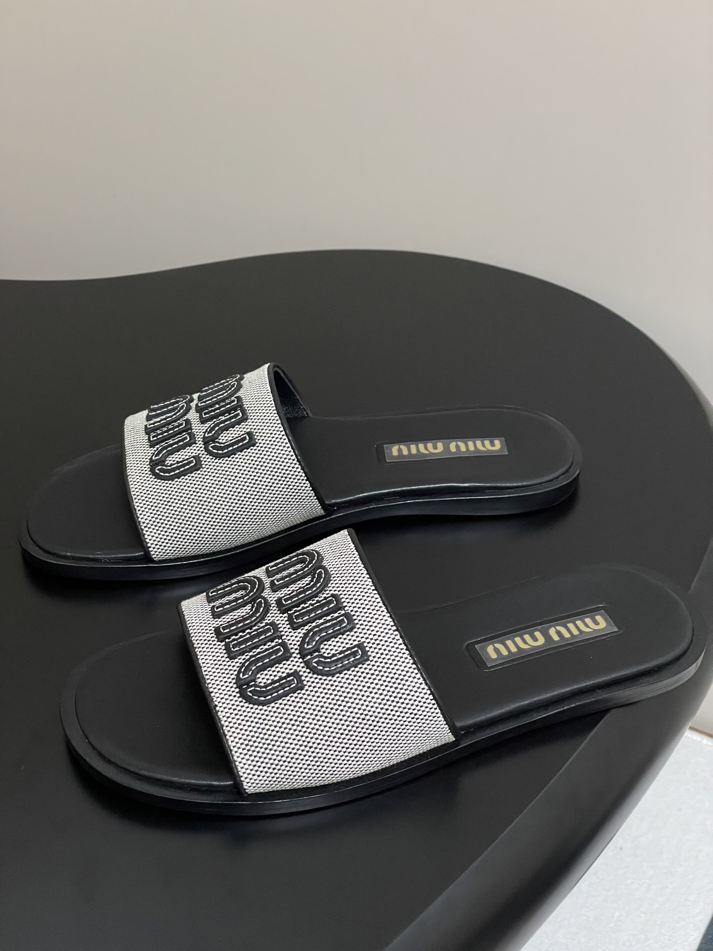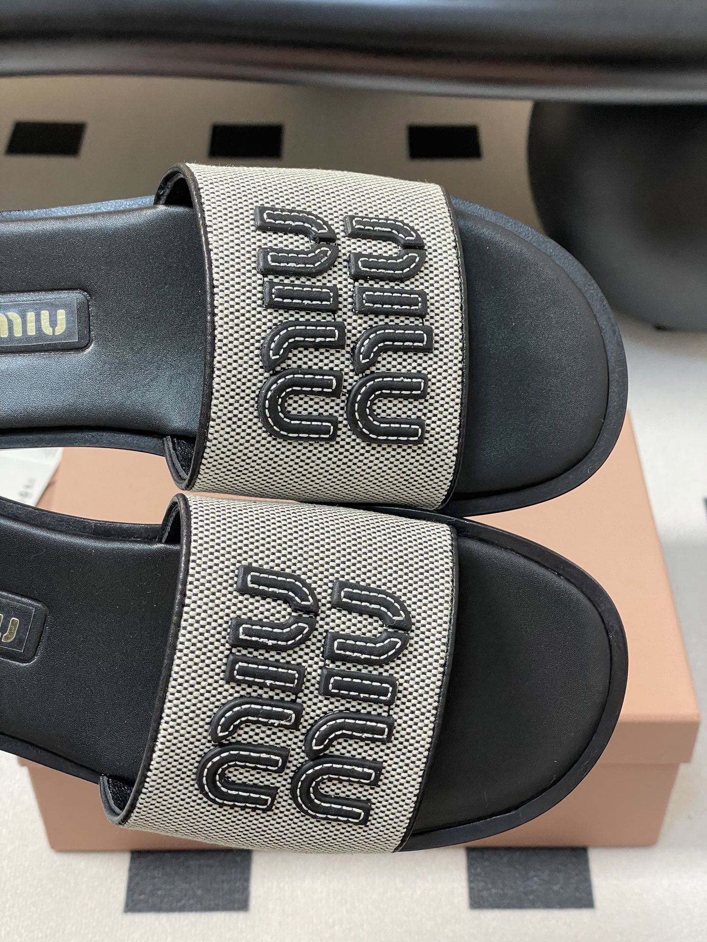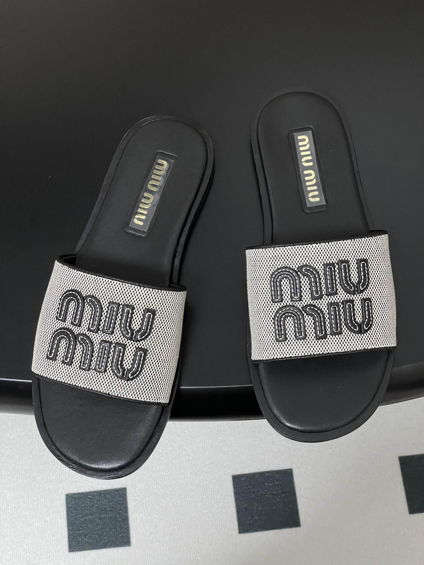 Miu Miu Linen Logo Flat Slides - Chic Summer Sandals for Women