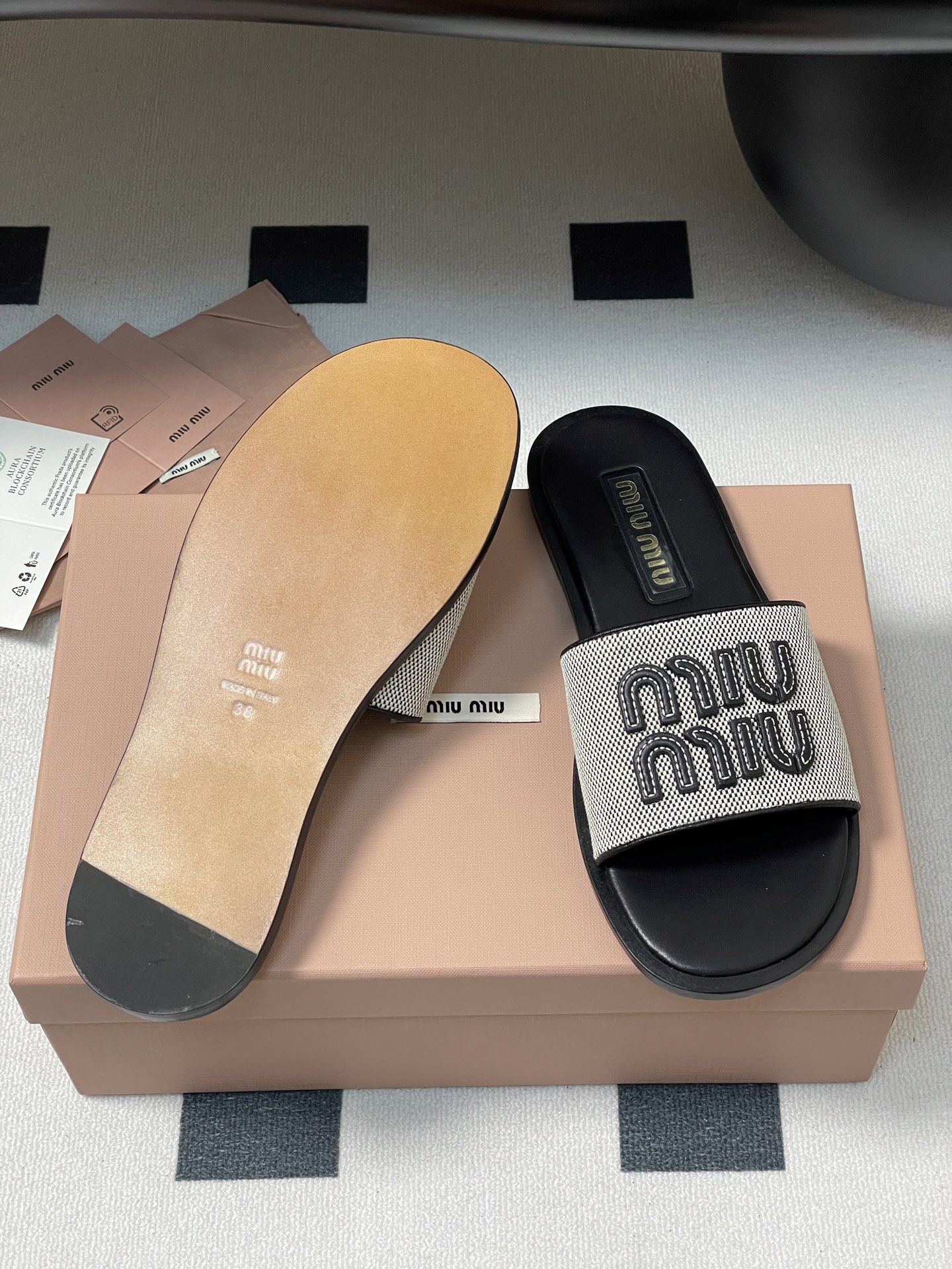 These Miu Miu flat slides are designed to elevate your summer style. Their timeless design and premium materials make them a worthwhile investment for any fashion enthusiast.