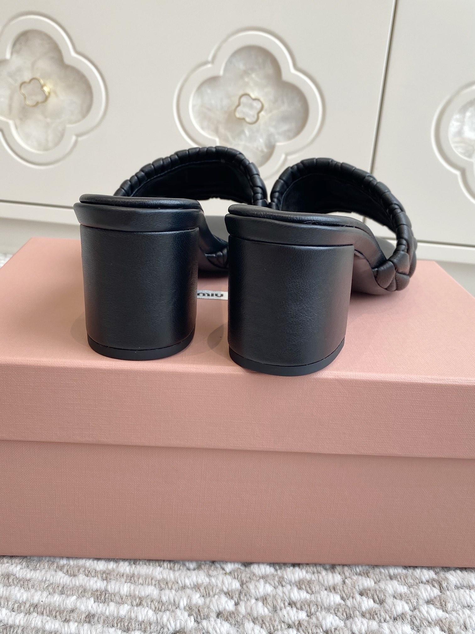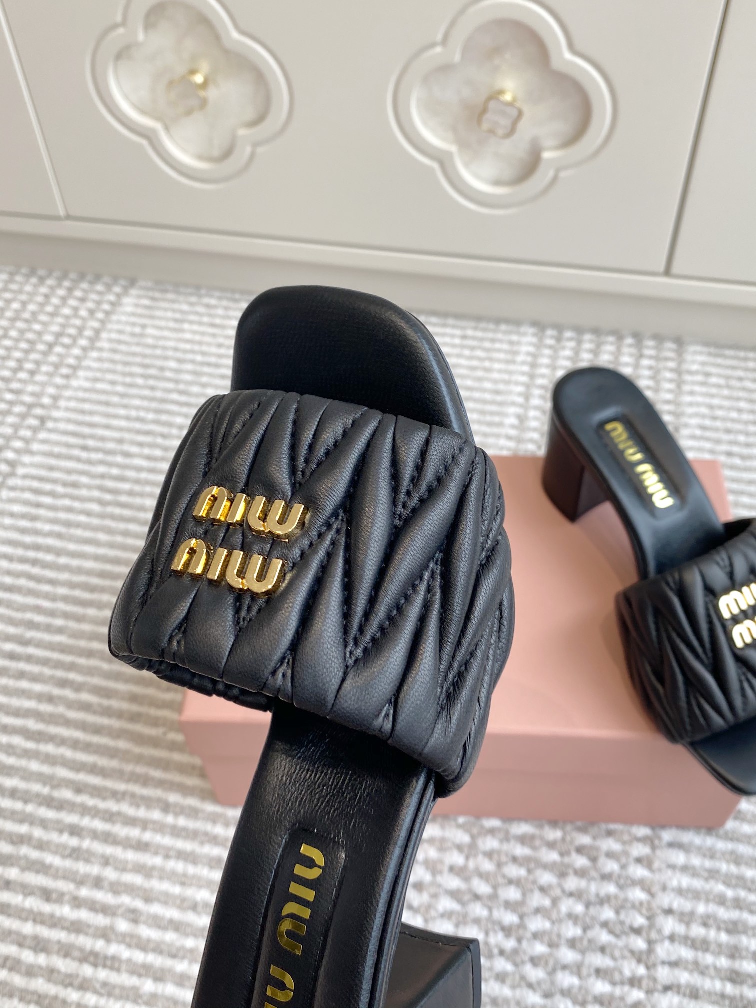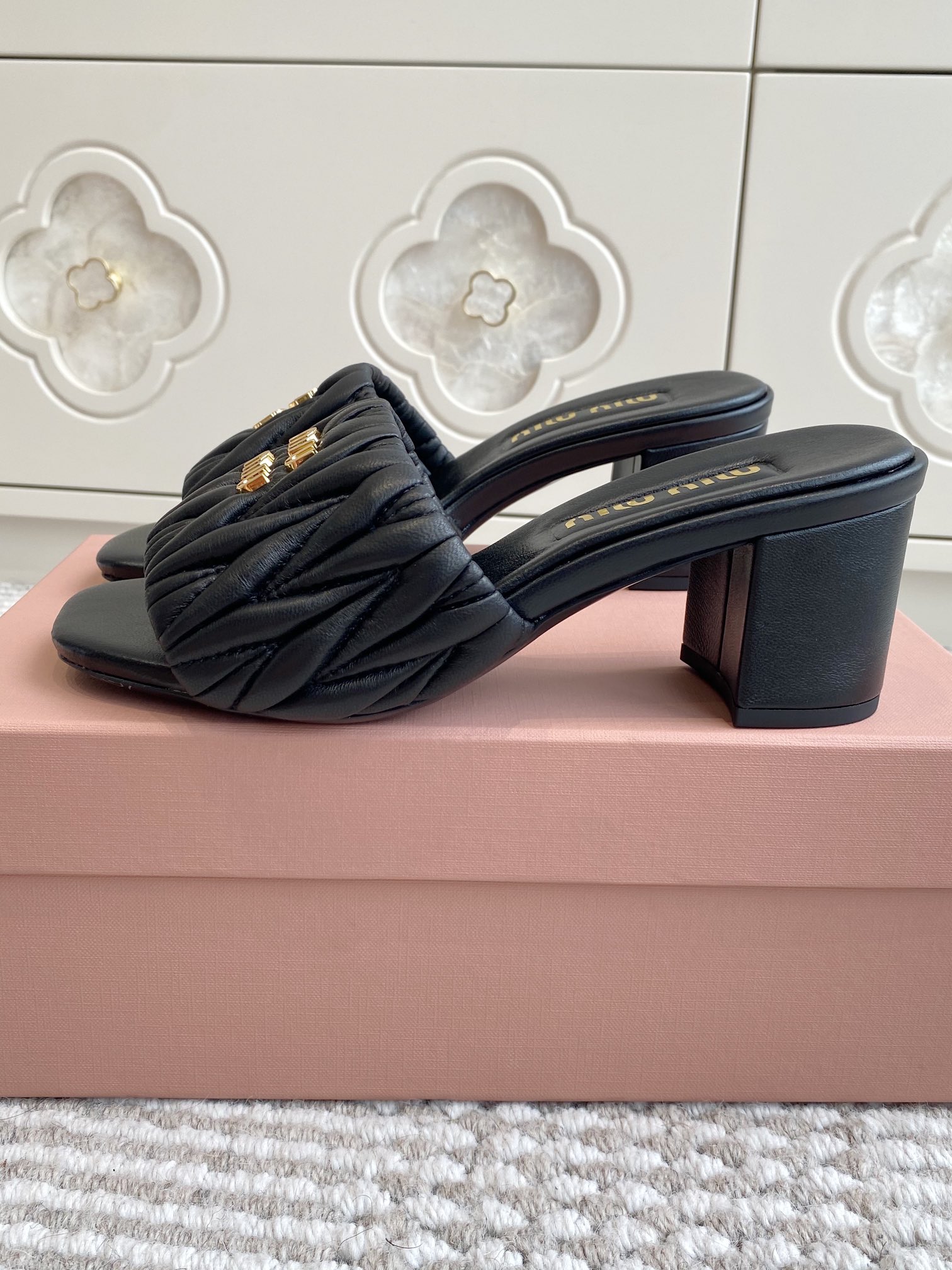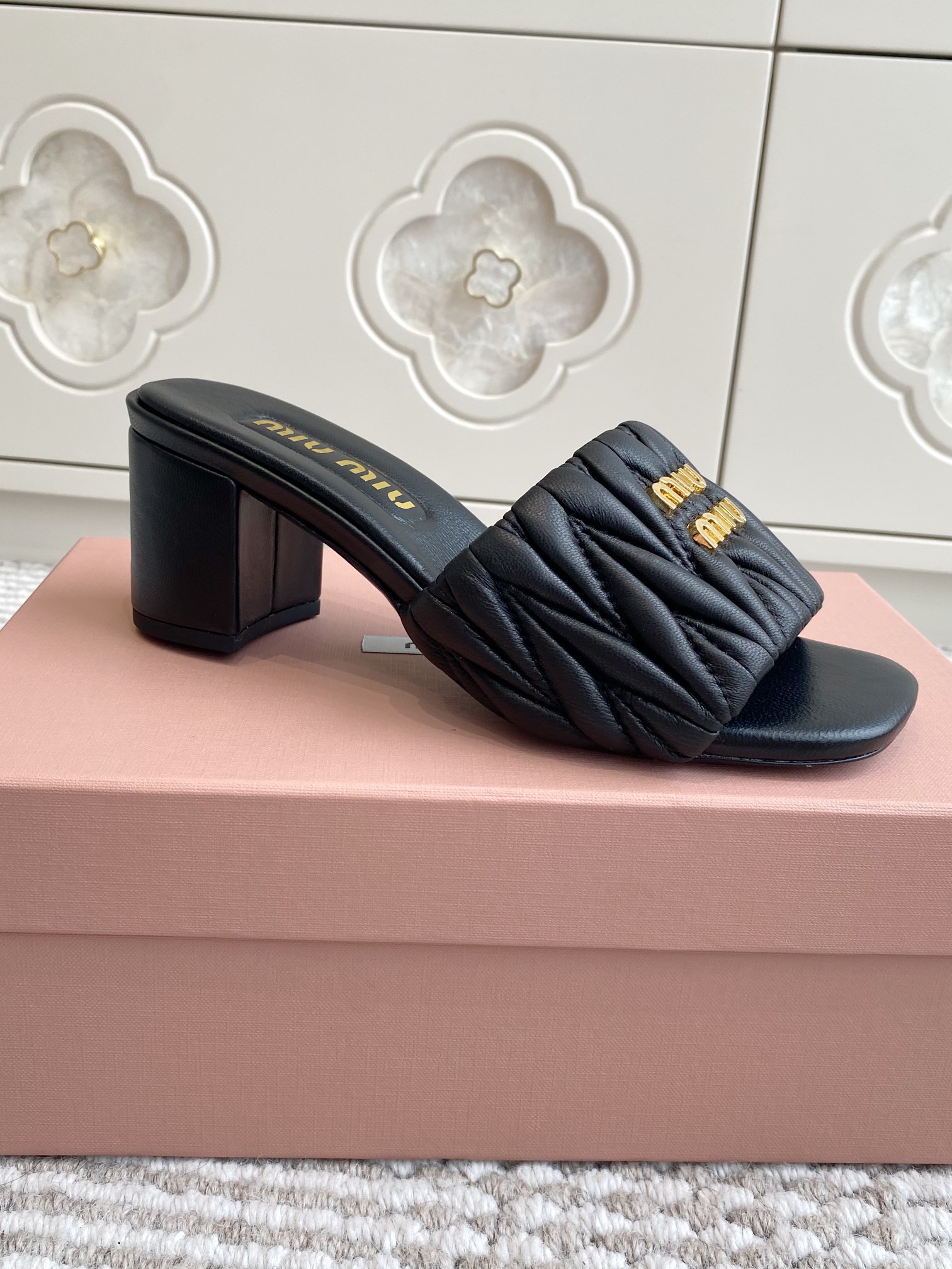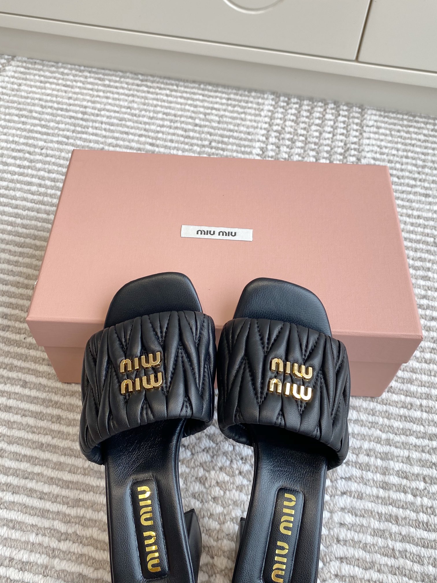 Miu Miu Women's Black Nappa Leather Quilted Heeled Sandals Slides