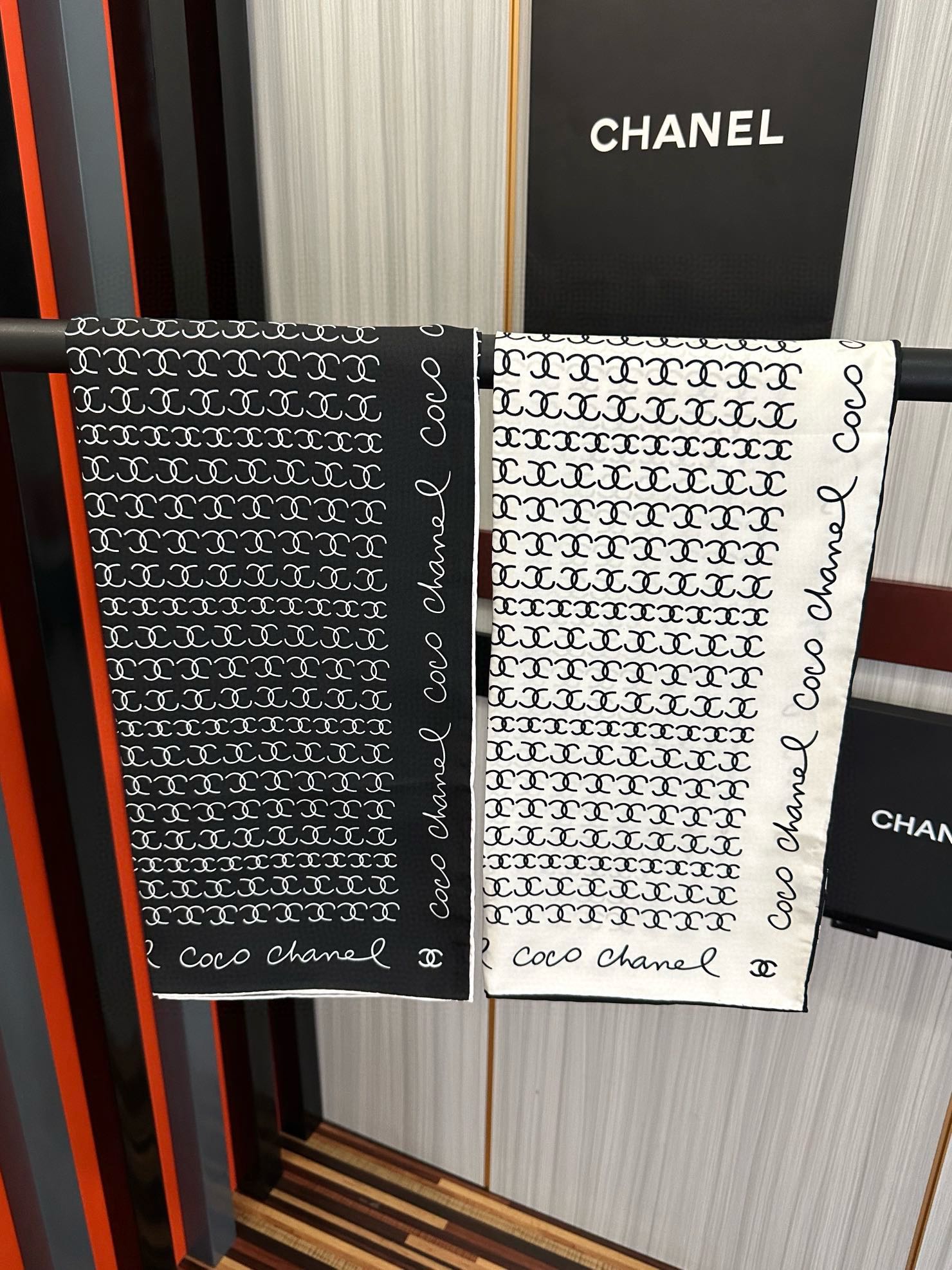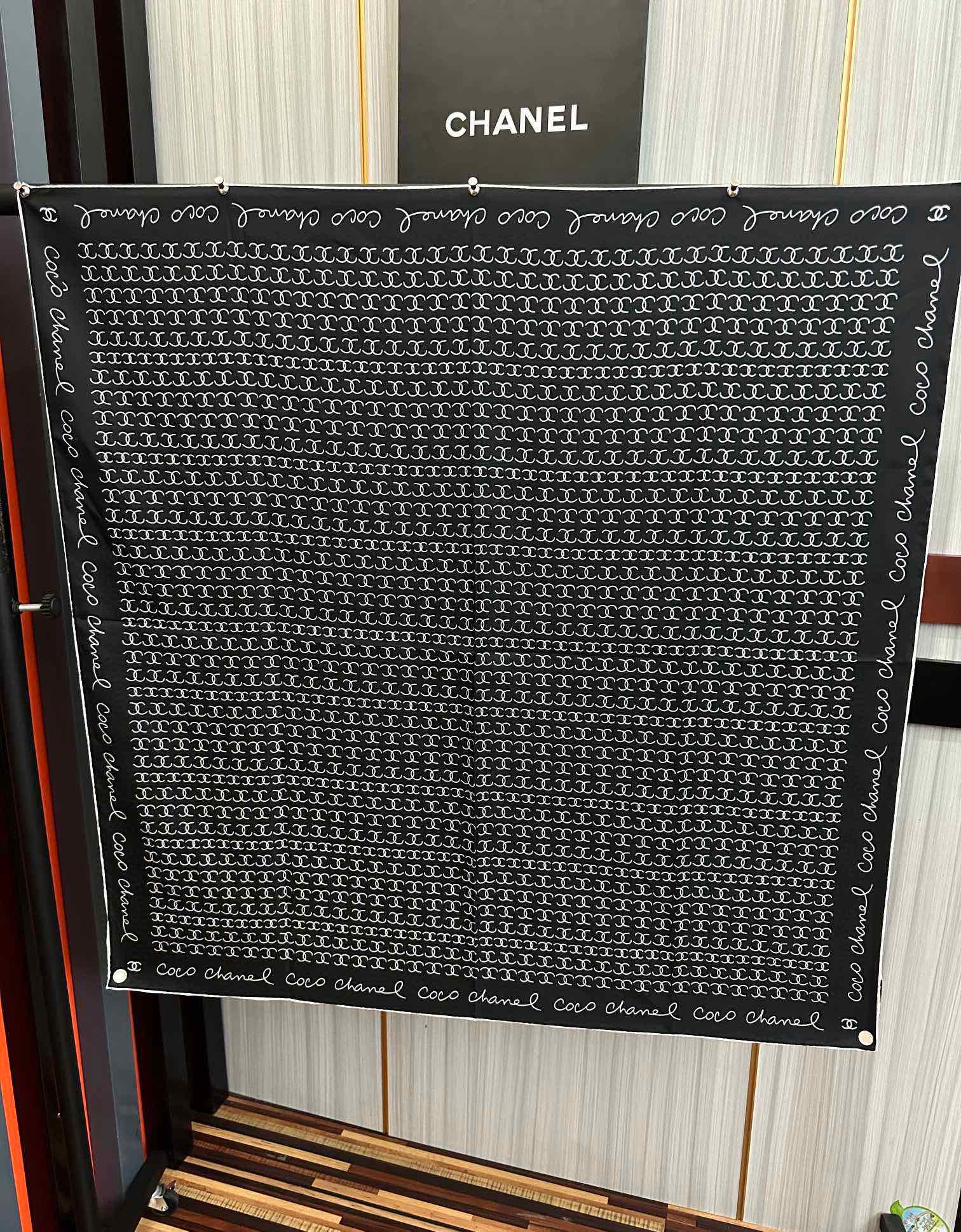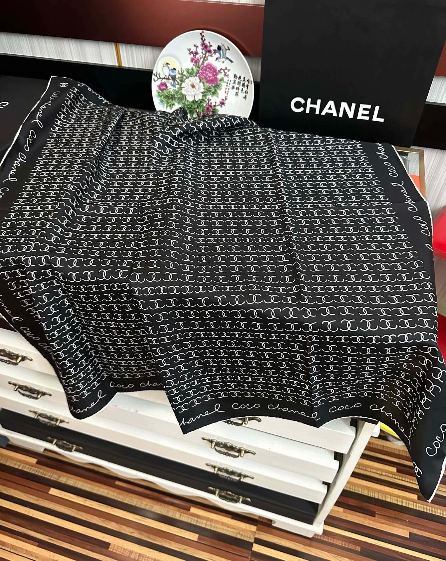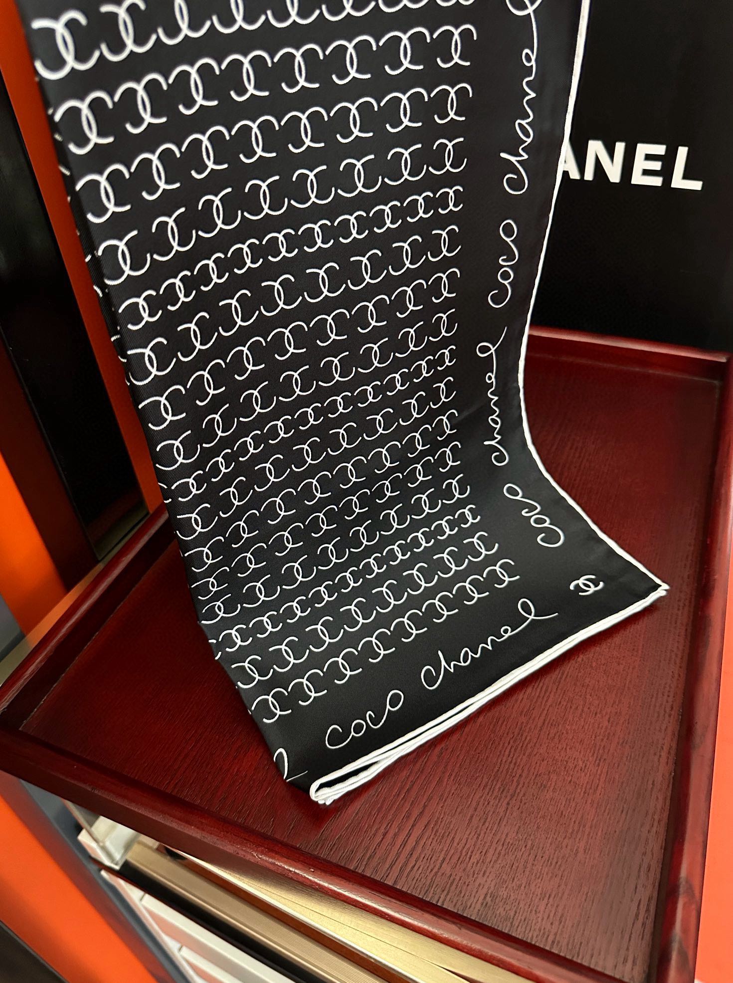 Add a touch of elegance to your wardrobe with this Chanel-inspired silk scarf. This scarf is perfect for adding a refined touch to any outfit.