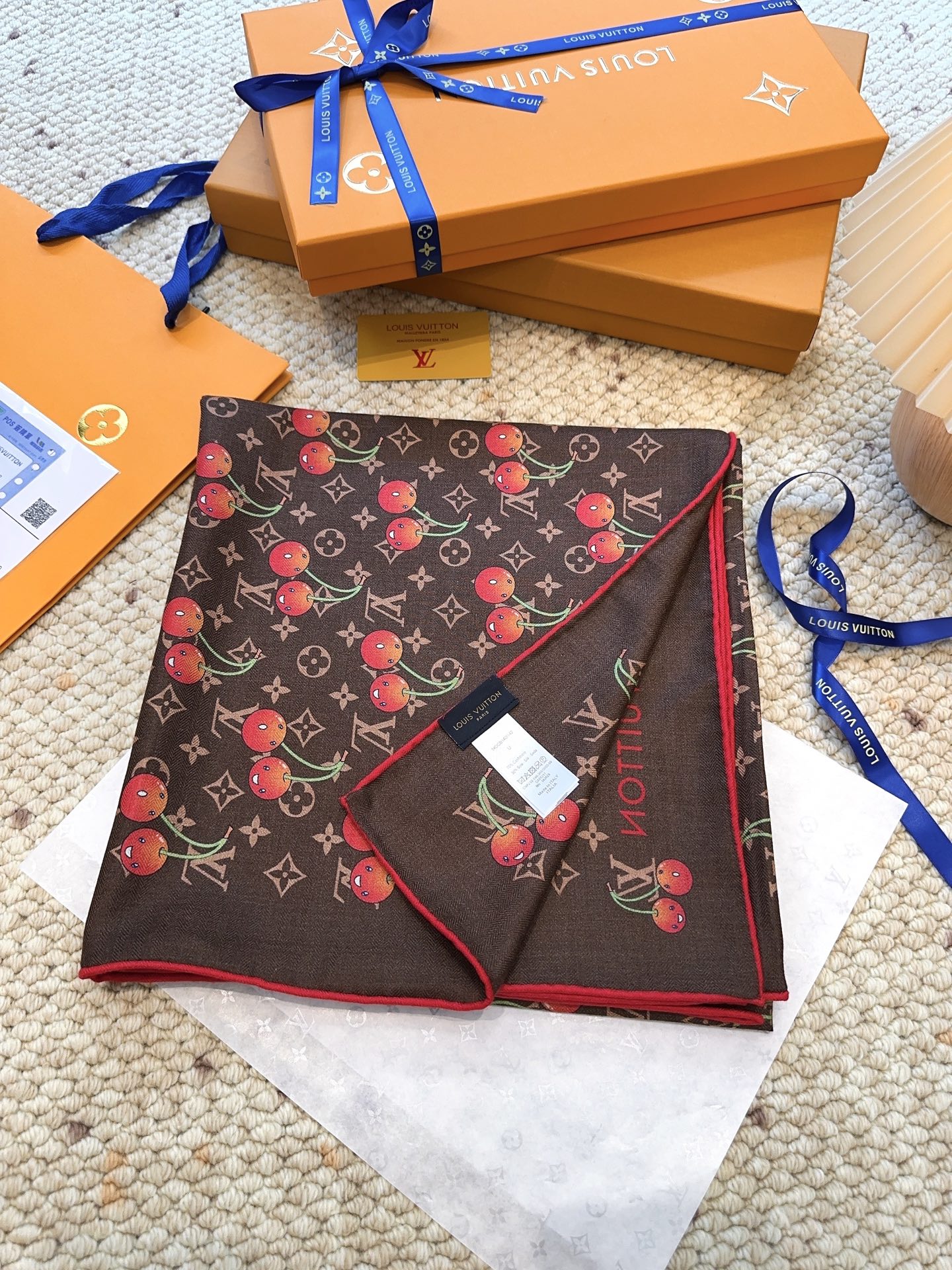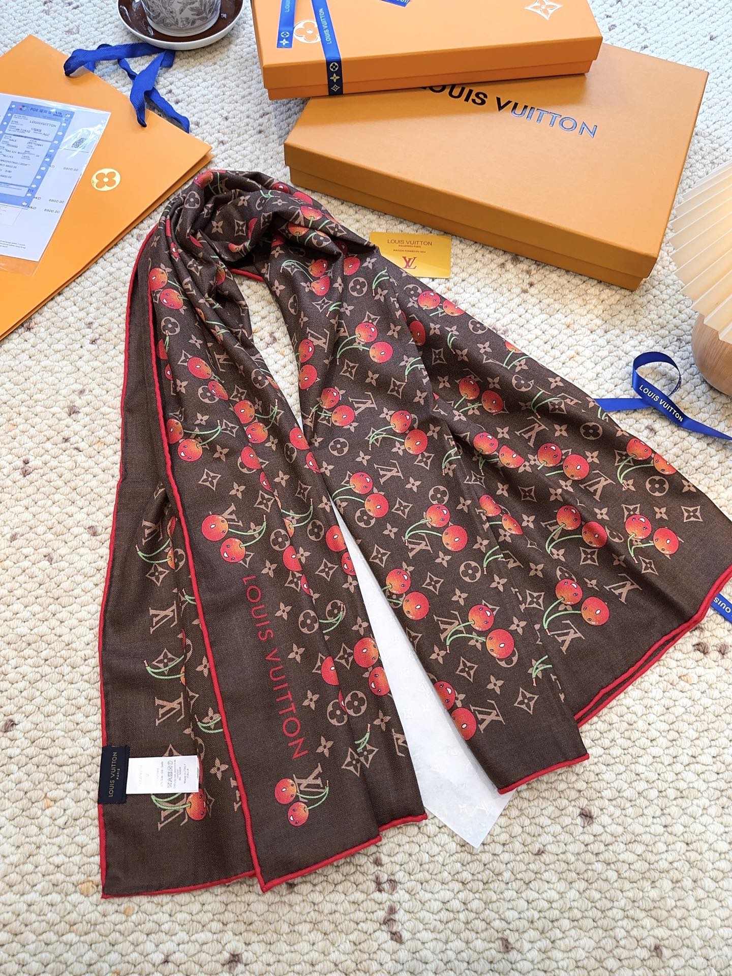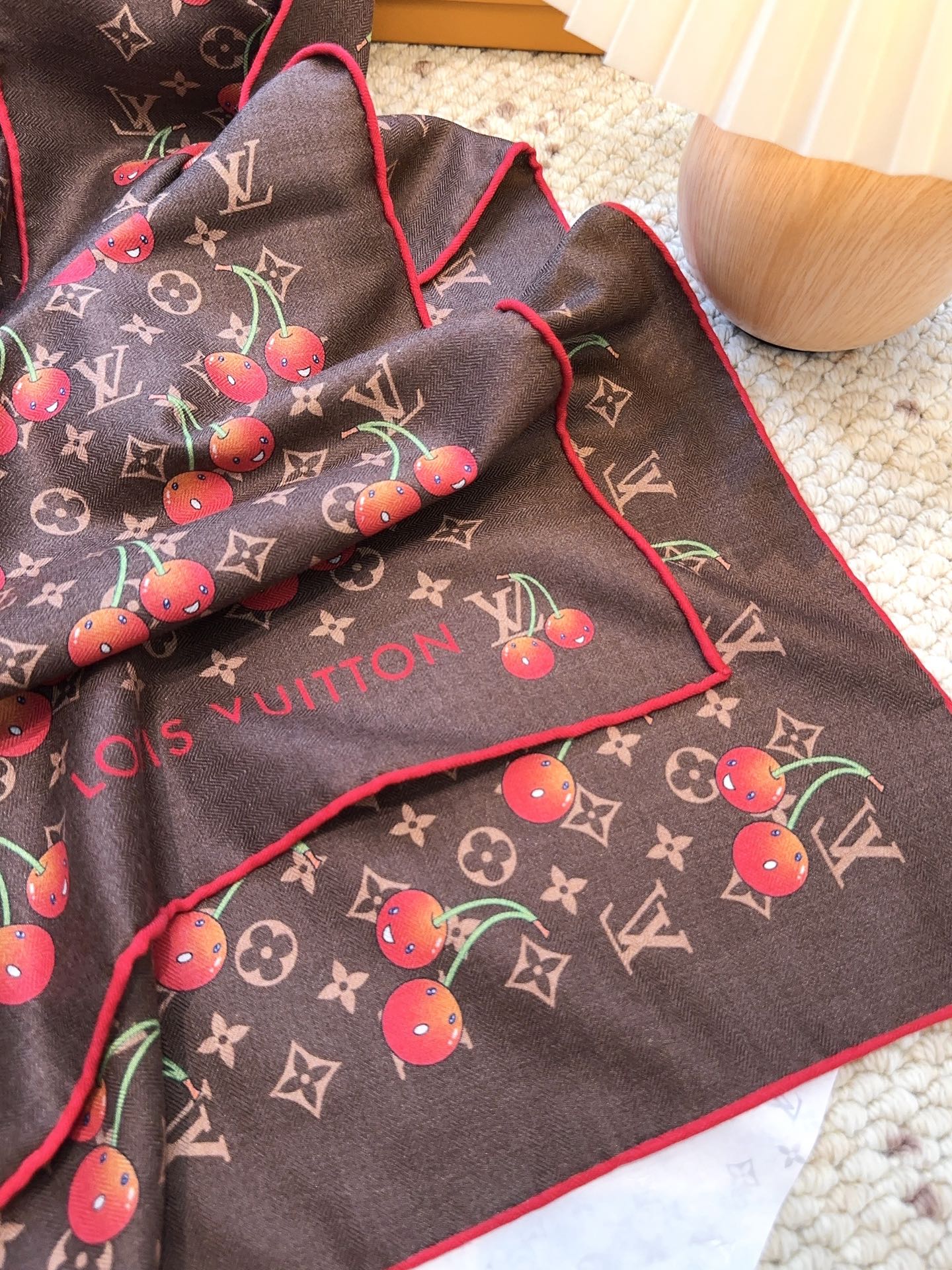 Elevate your style with the Louis Vuitton x TM Monogram Cerise Scarf. This exquisite silk-wool blend features a playful cherry motif. Perfect as a statement piece.