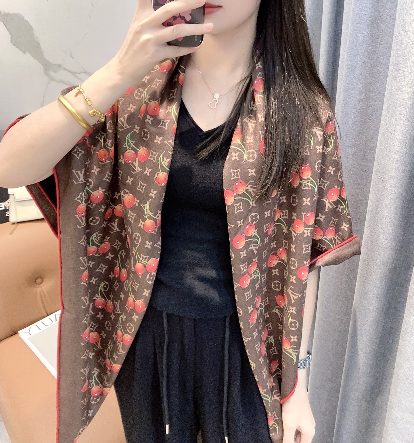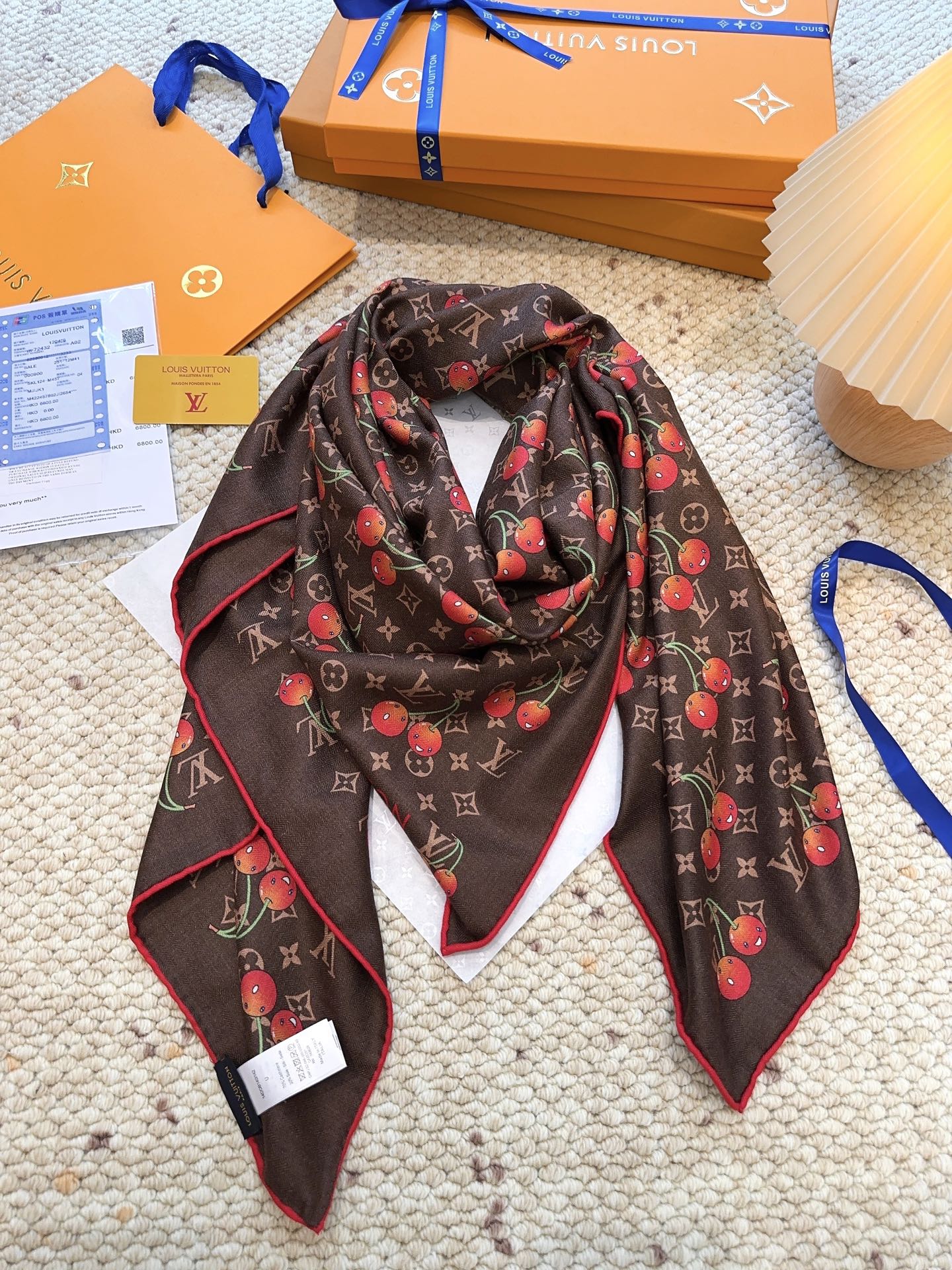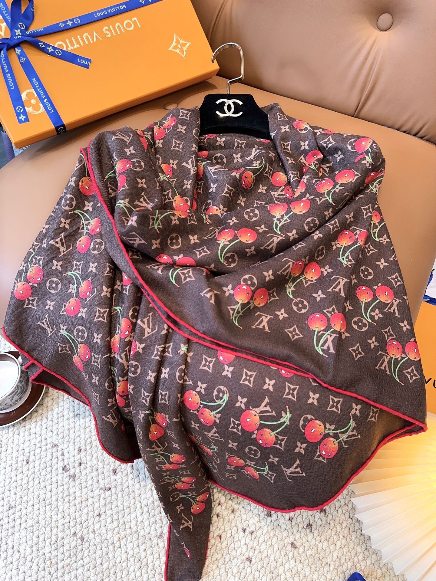 Elevate your style with the Louis Vuitton x TM Monogram Cerise Scarf. This exquisite silk-wool blend features a playful cherry motif. Perfect as a statement piece.