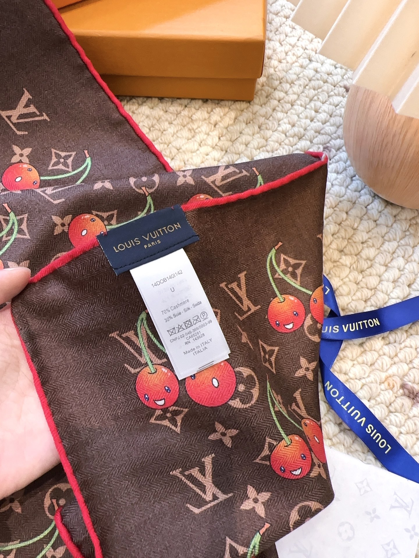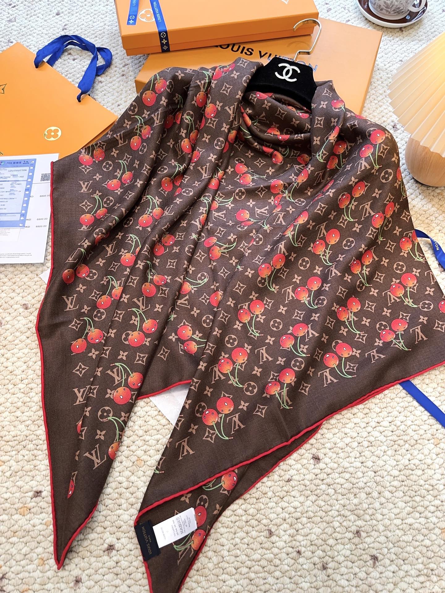 Elevate your wardrobe with the Louis Vuitton x TM Monogram Cerise Scarf, a luxurious blend of silk and wool. This exquisite scarf features the iconic Monogram pattern adorned with whimsical cherry motifs, adding a playful touch to your ensemble.