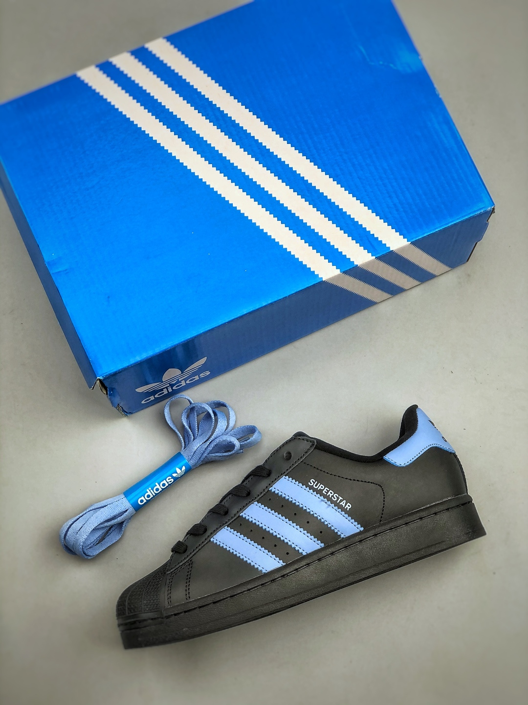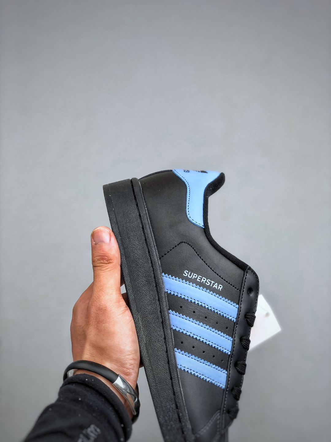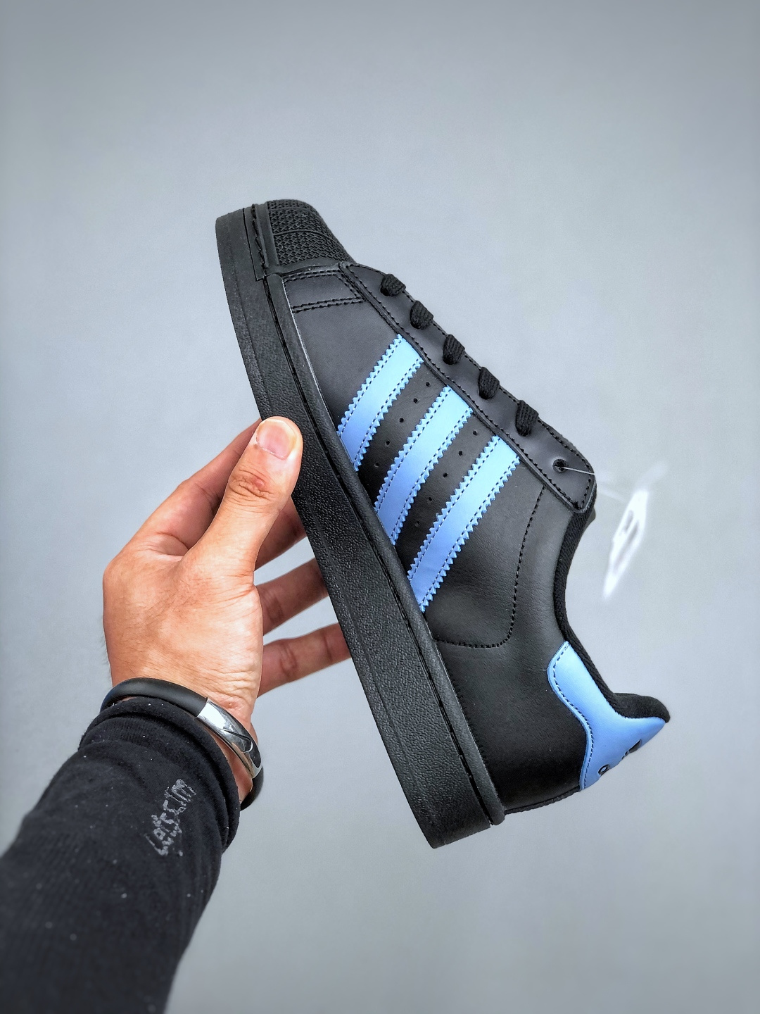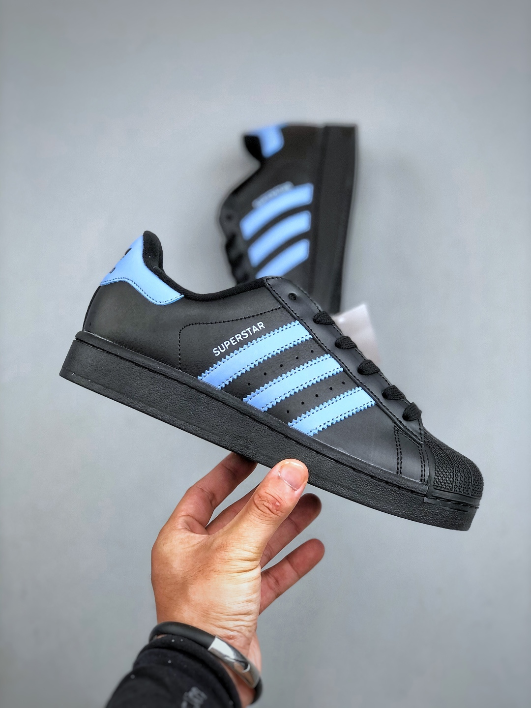 Step into style with these classic Adidas Superstar sneakers. Featuring a sleek black leather upper with iconic blue stripes.