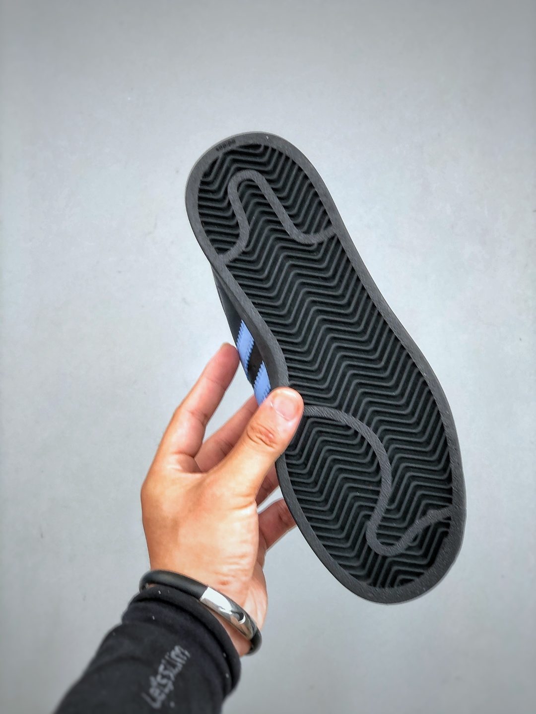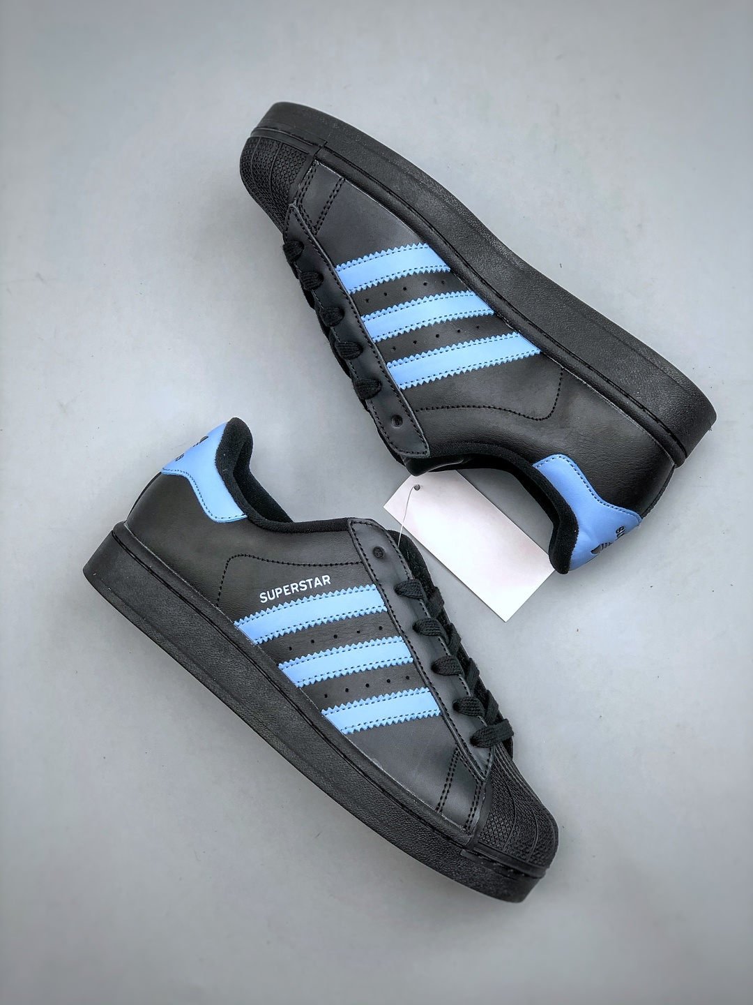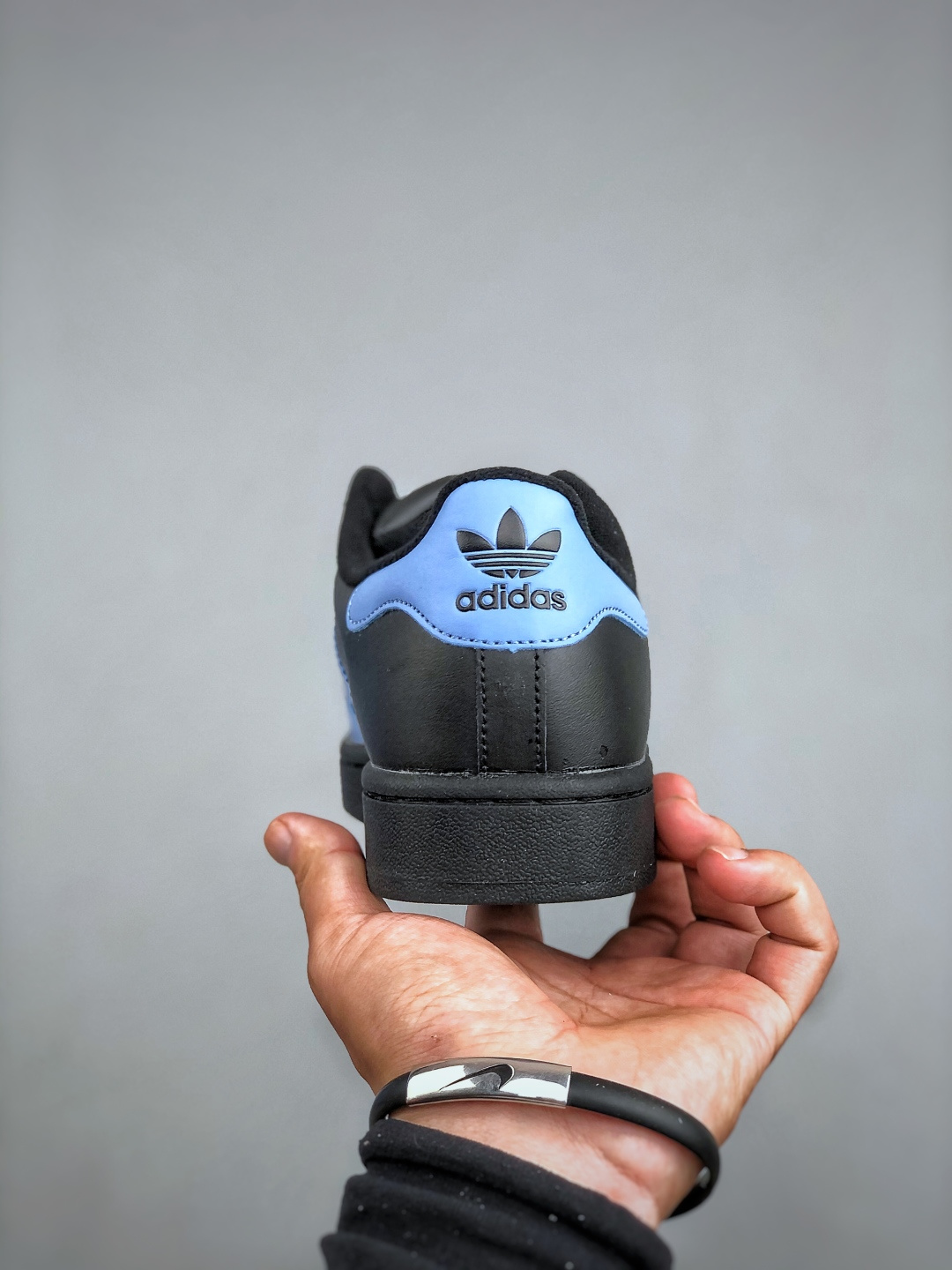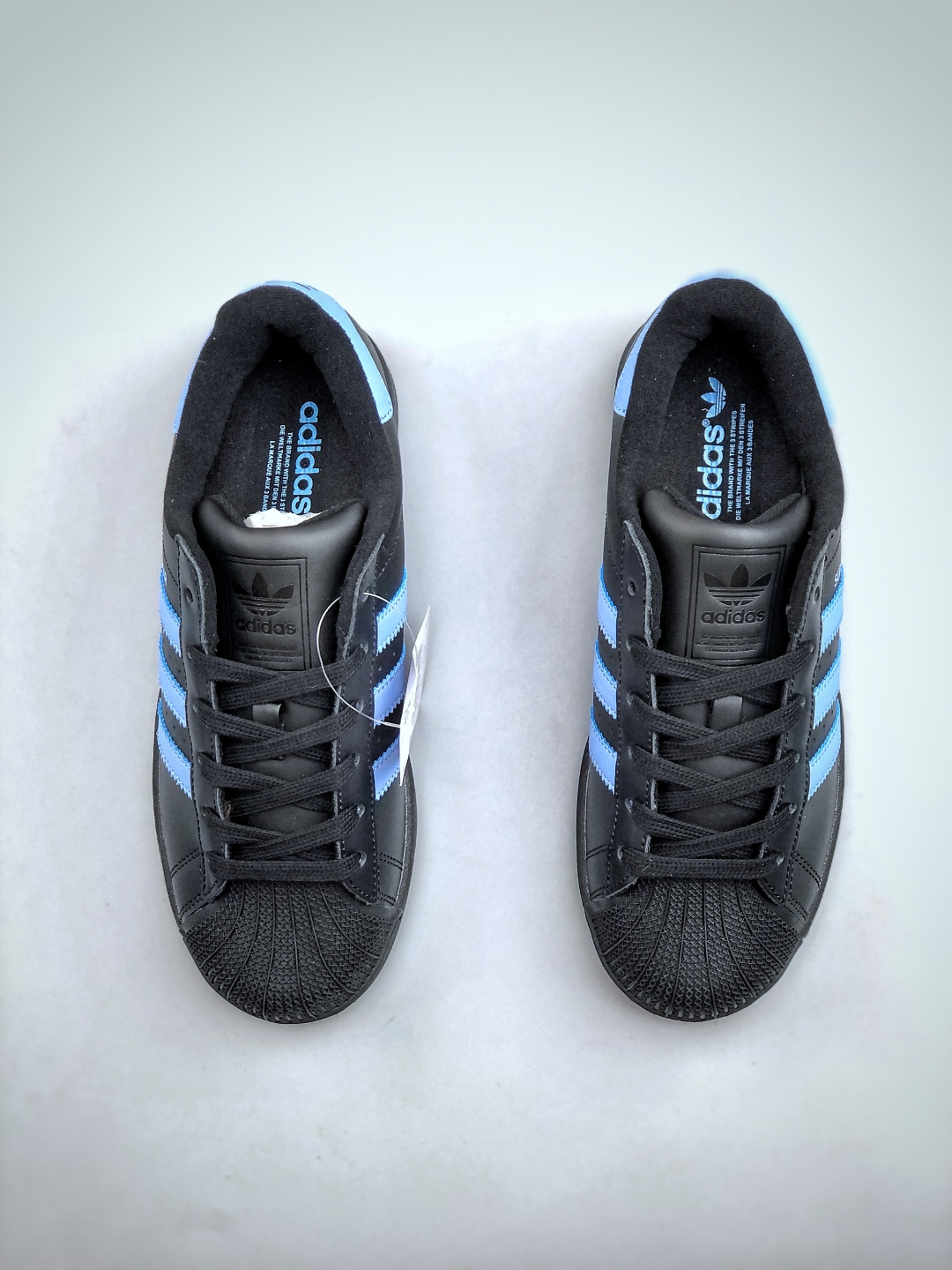 Step into style with these classic Adidas Superstar sneakers. Featuring a sleek black leather upper with iconic blue stripes.