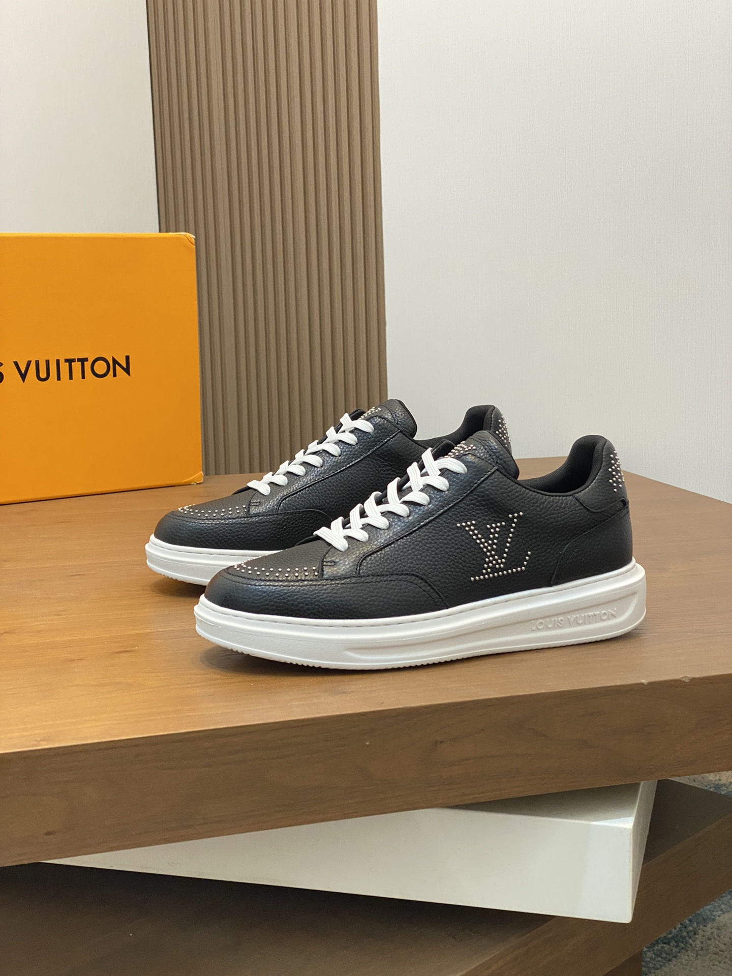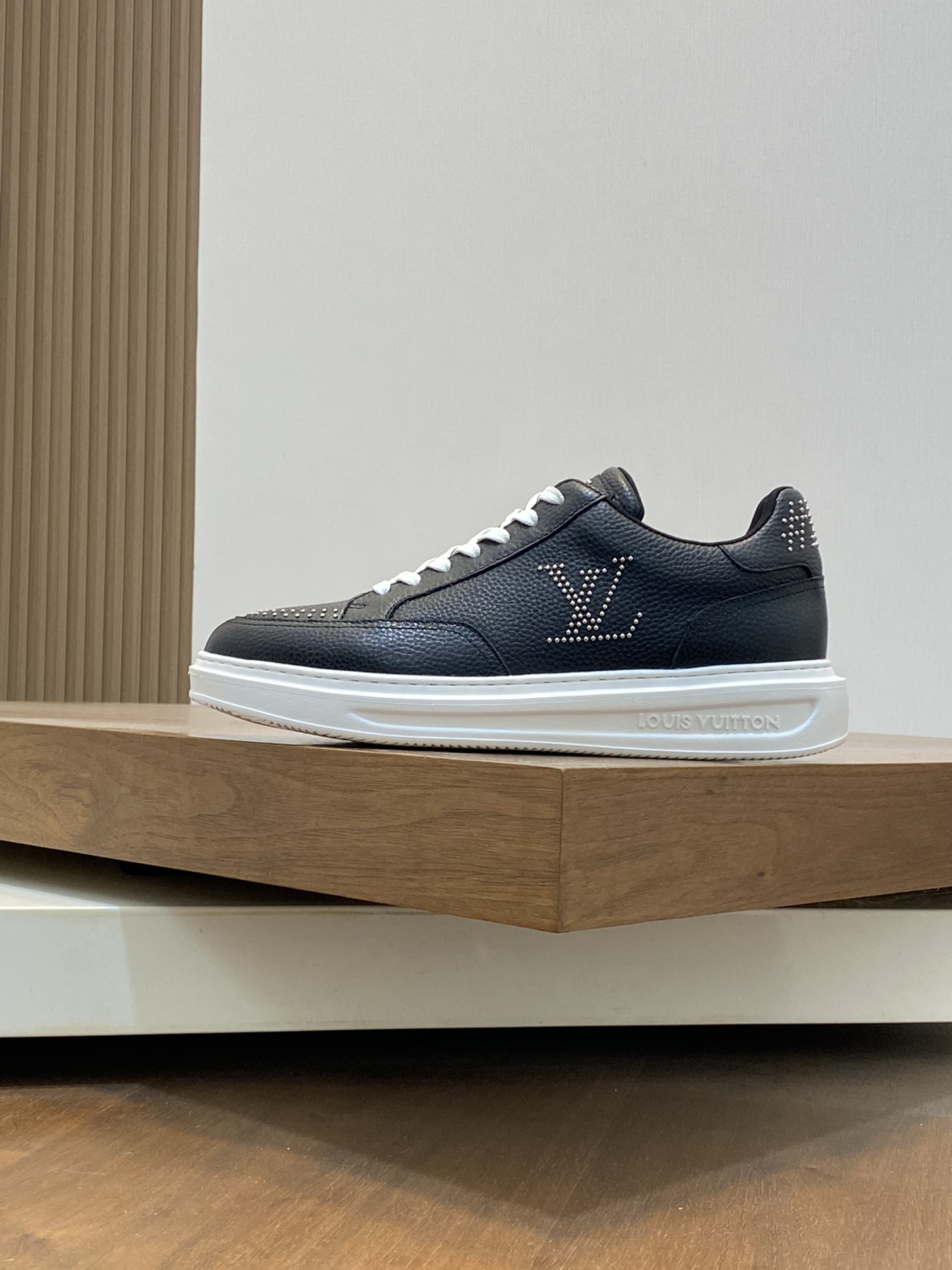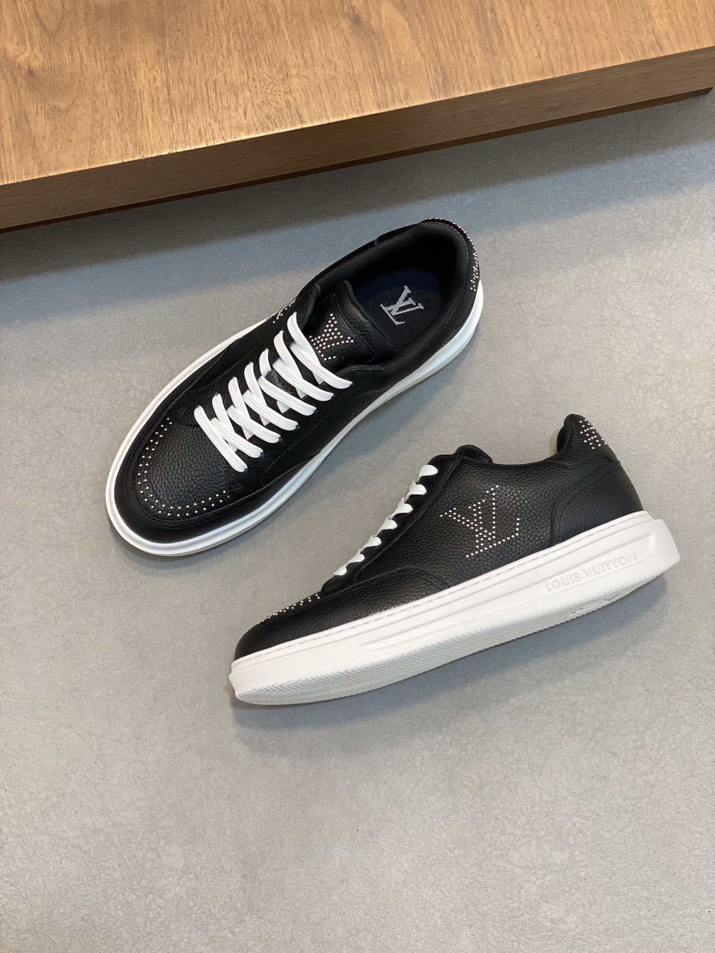 Elevate your style with these premium black leather sneakers from Louis Vuitton, featuring a sleek design and comfortable TPU sole. Perfect for a casual, refined look.