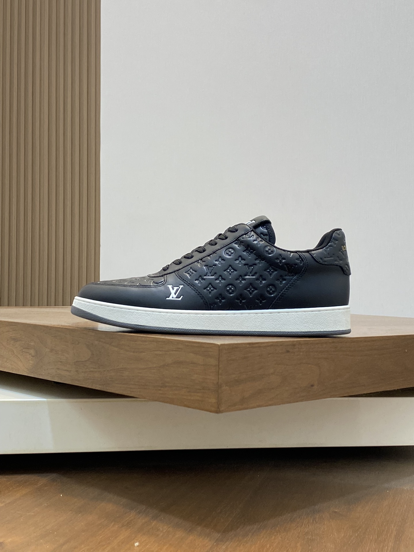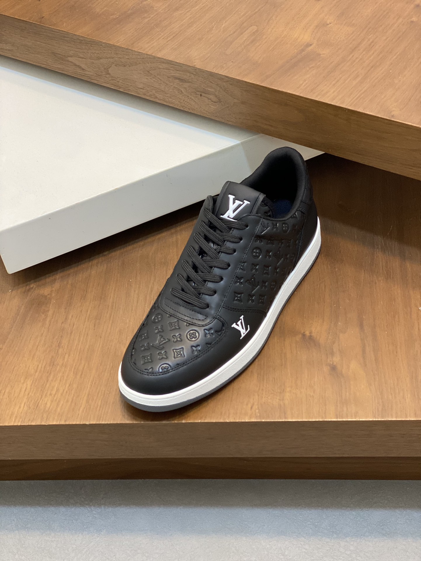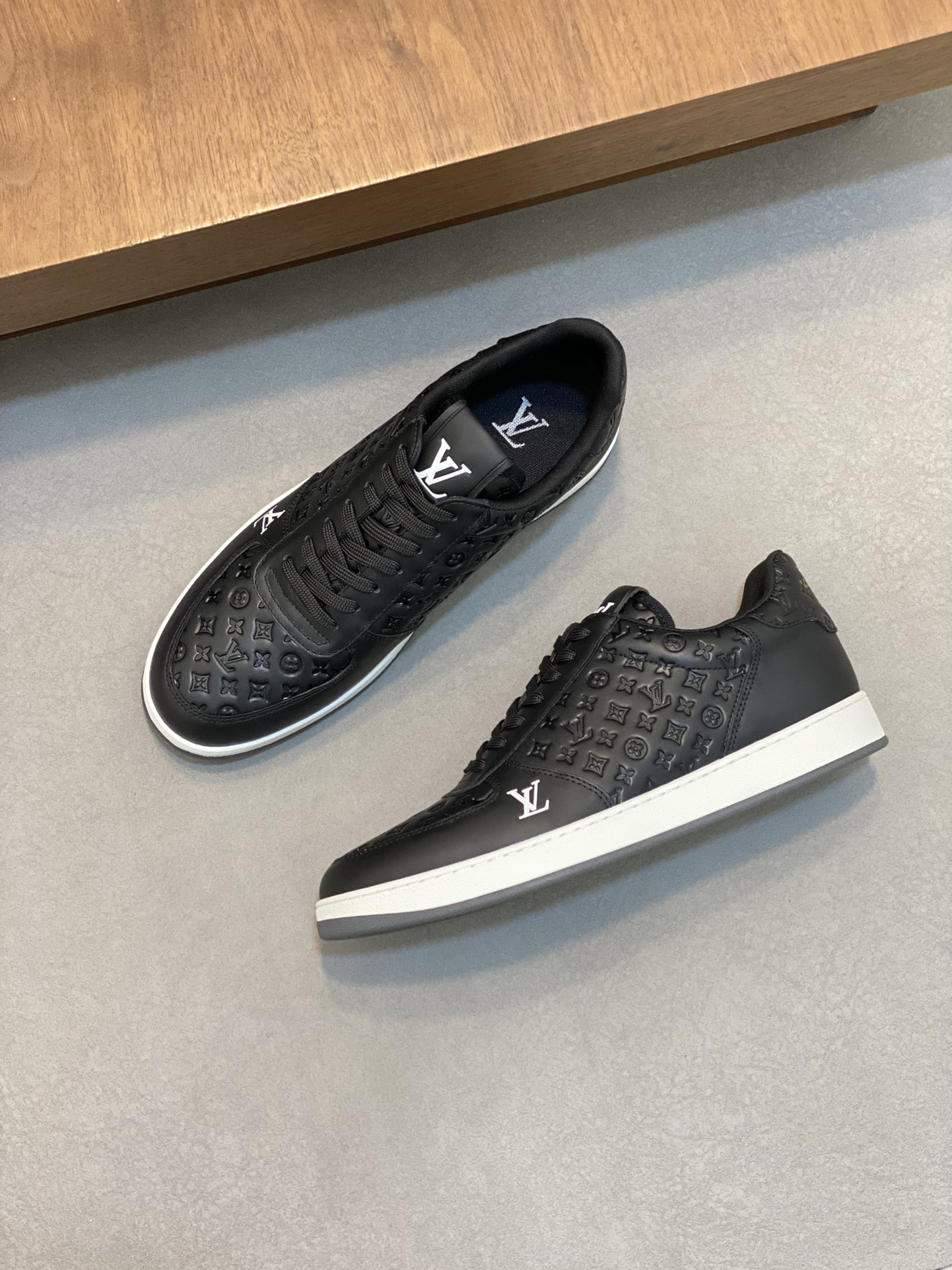 Elevate your style with these premium Louis Vuitton black leather sneakers. Featuring a signature monogram embossed design for a luxury look.