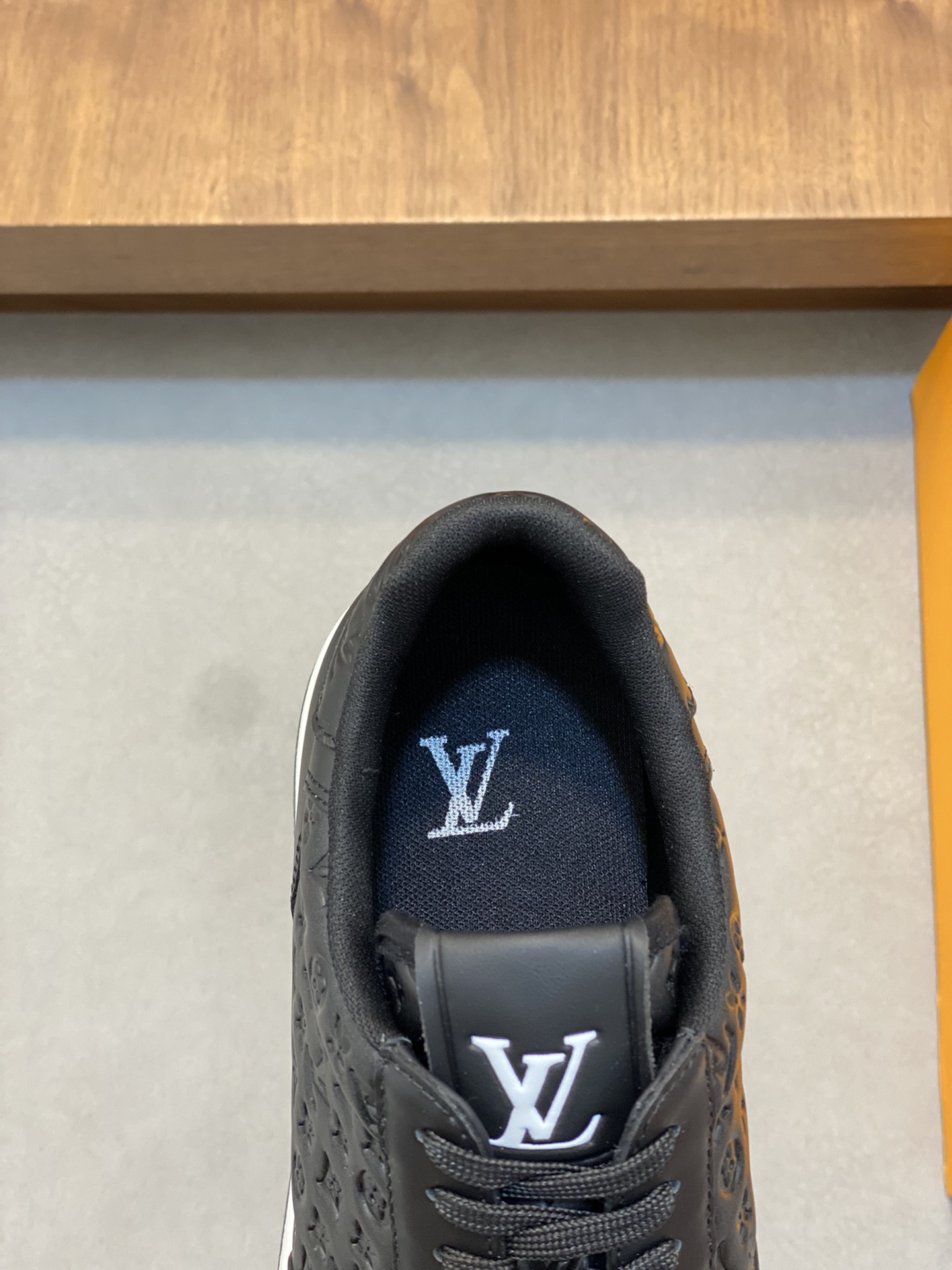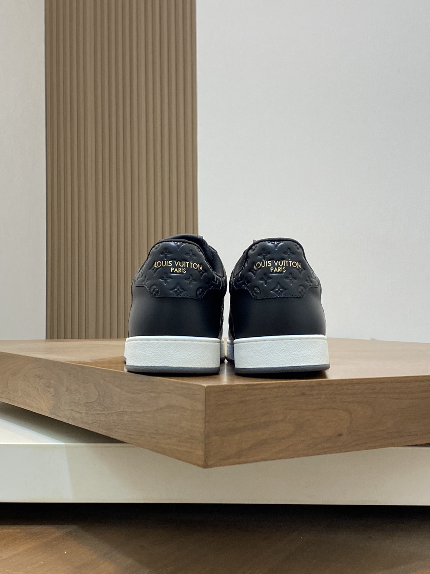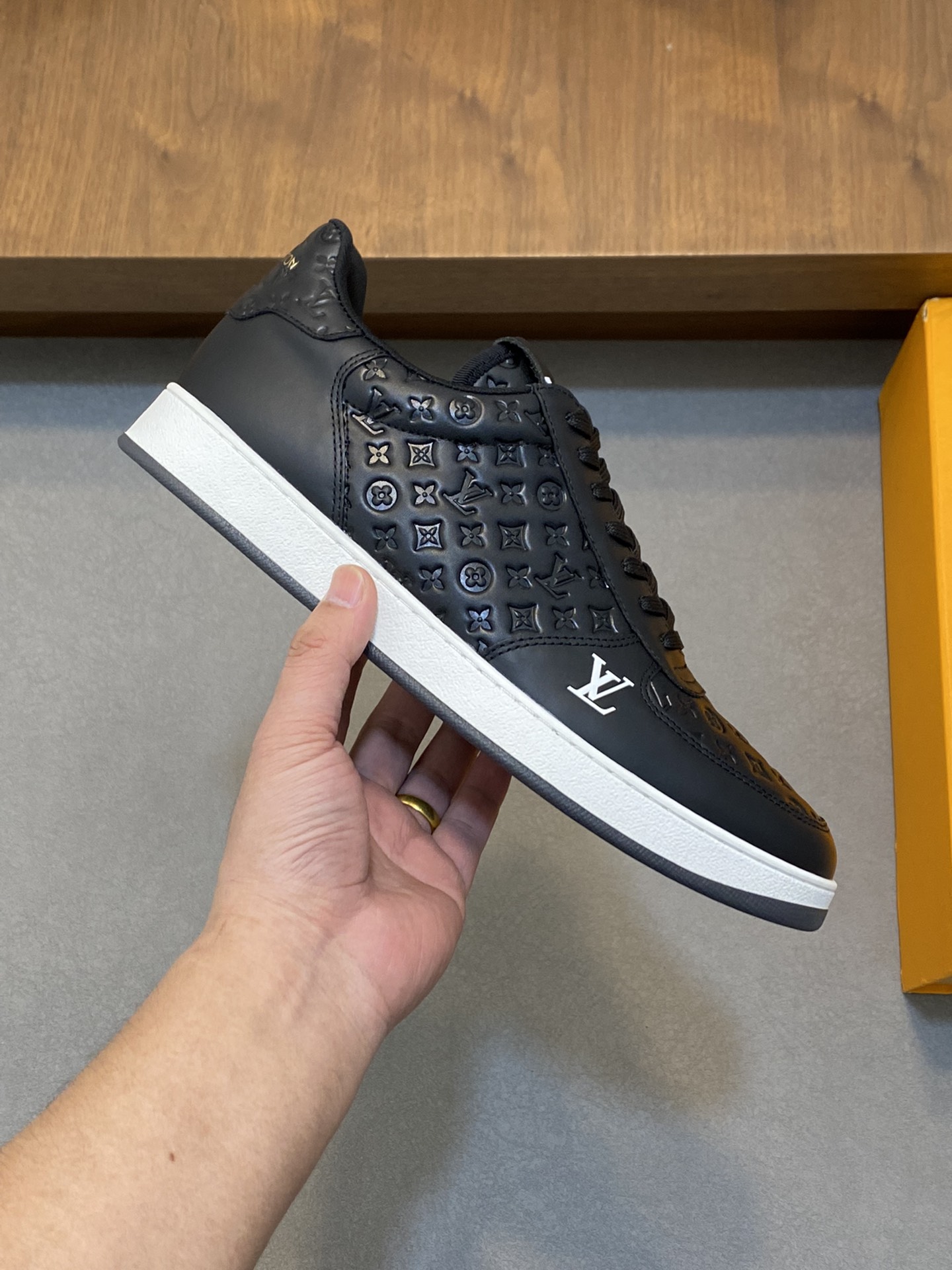 Elevate your style with these premium Louis Vuitton black leather sneakers. Featuring a signature monogram embossed design for a luxury look.