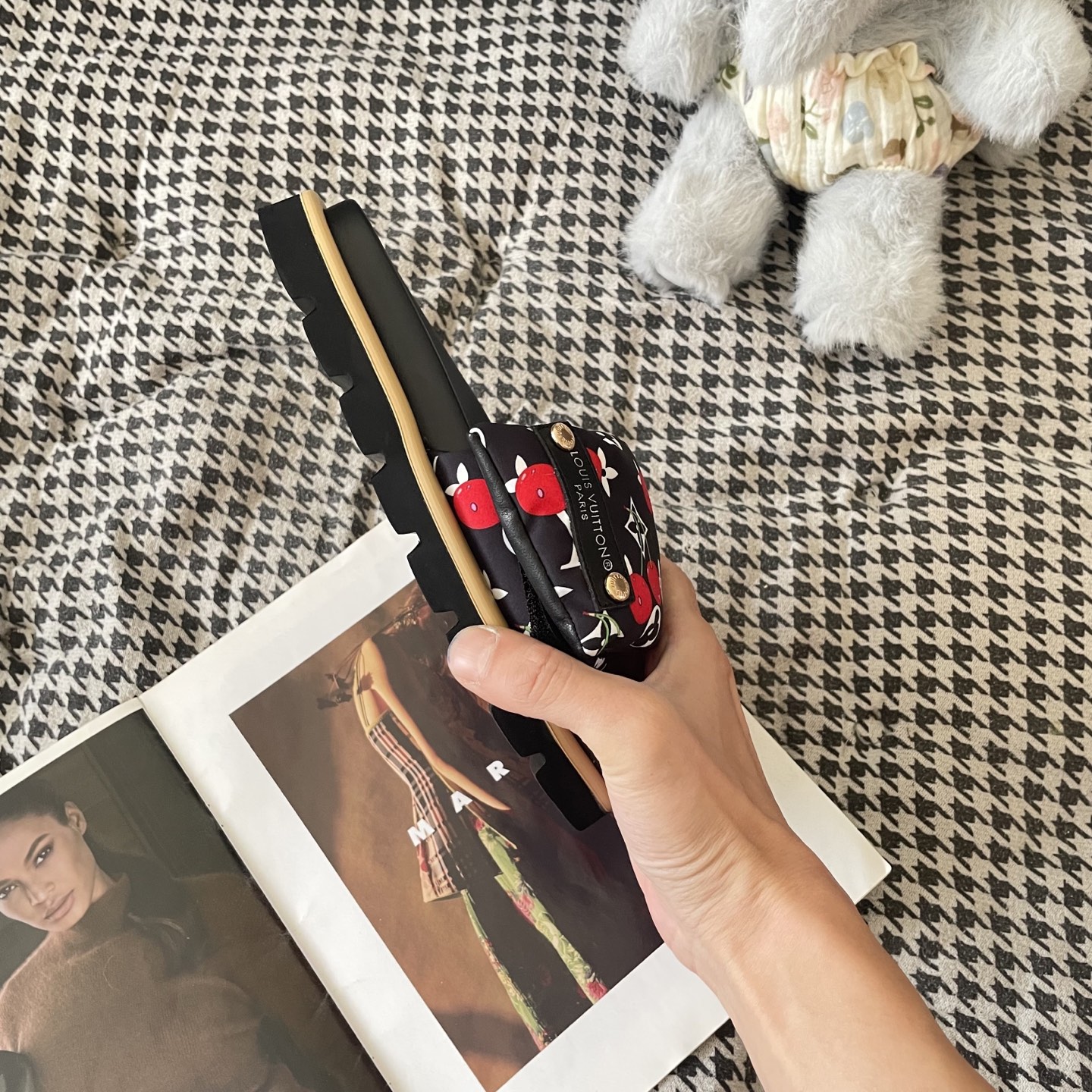 Step out in style with these Louis Vuitton 20th Anniversary slides featuring the iconic Murakami Takashi cherry print. A must-have for any fashion enthusiast.