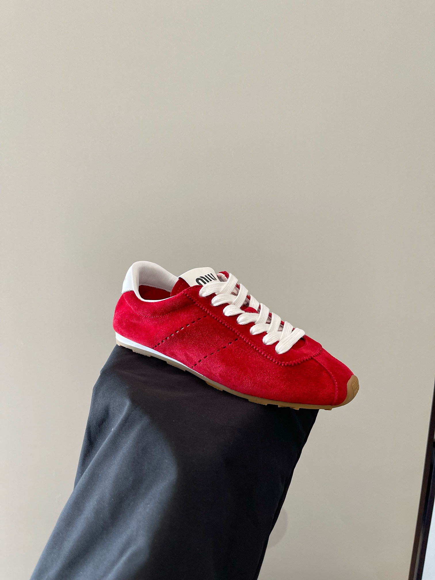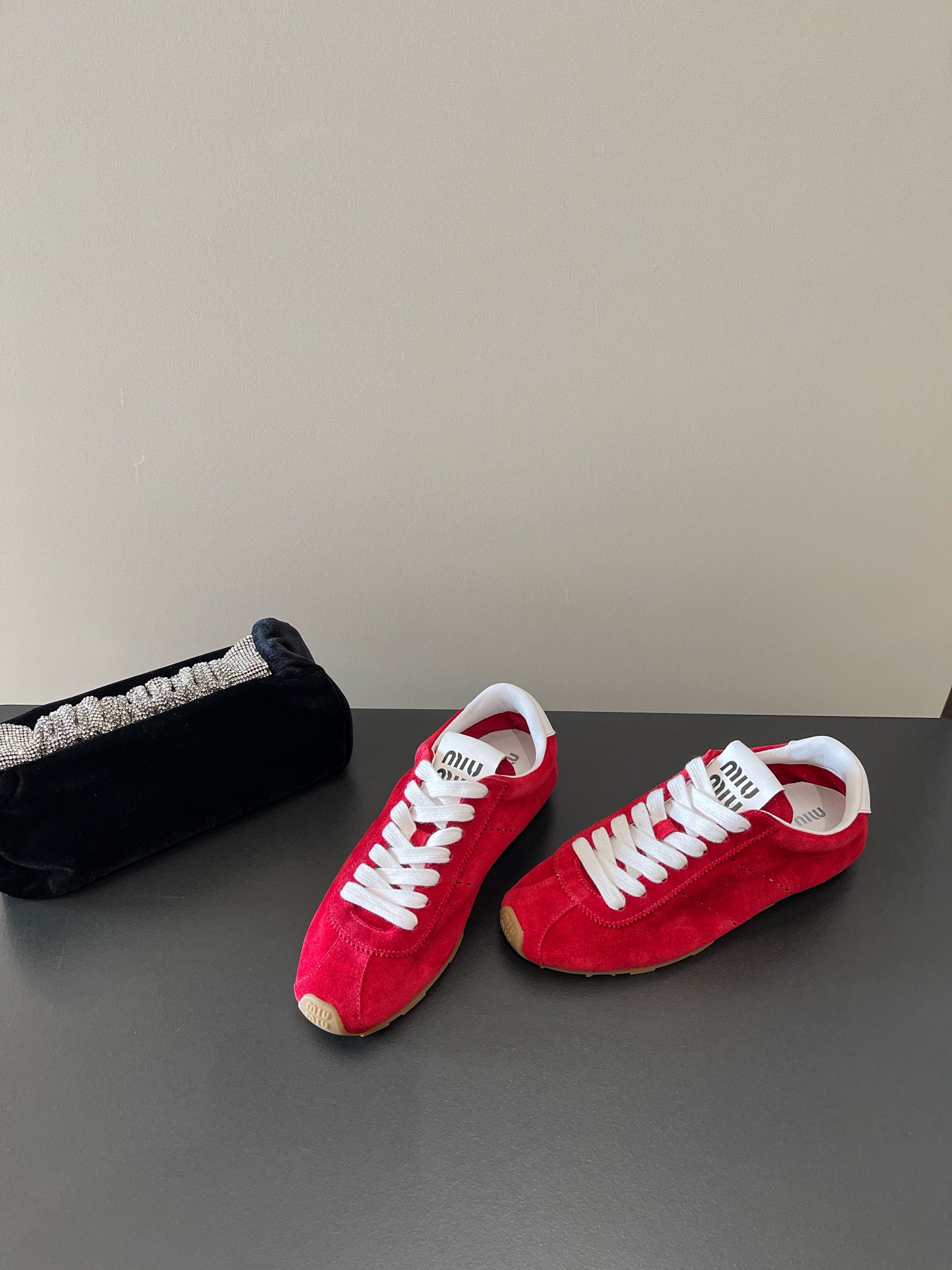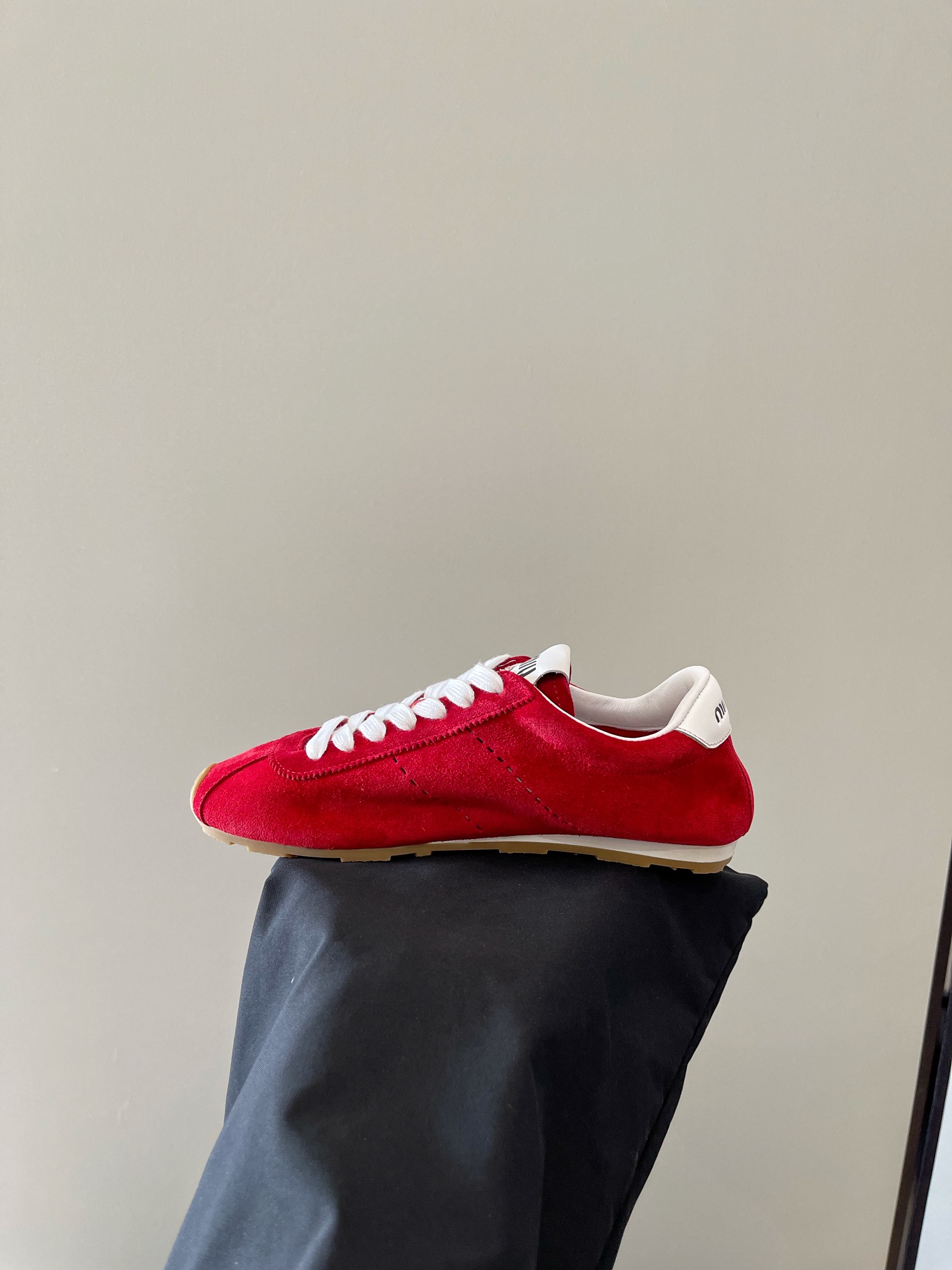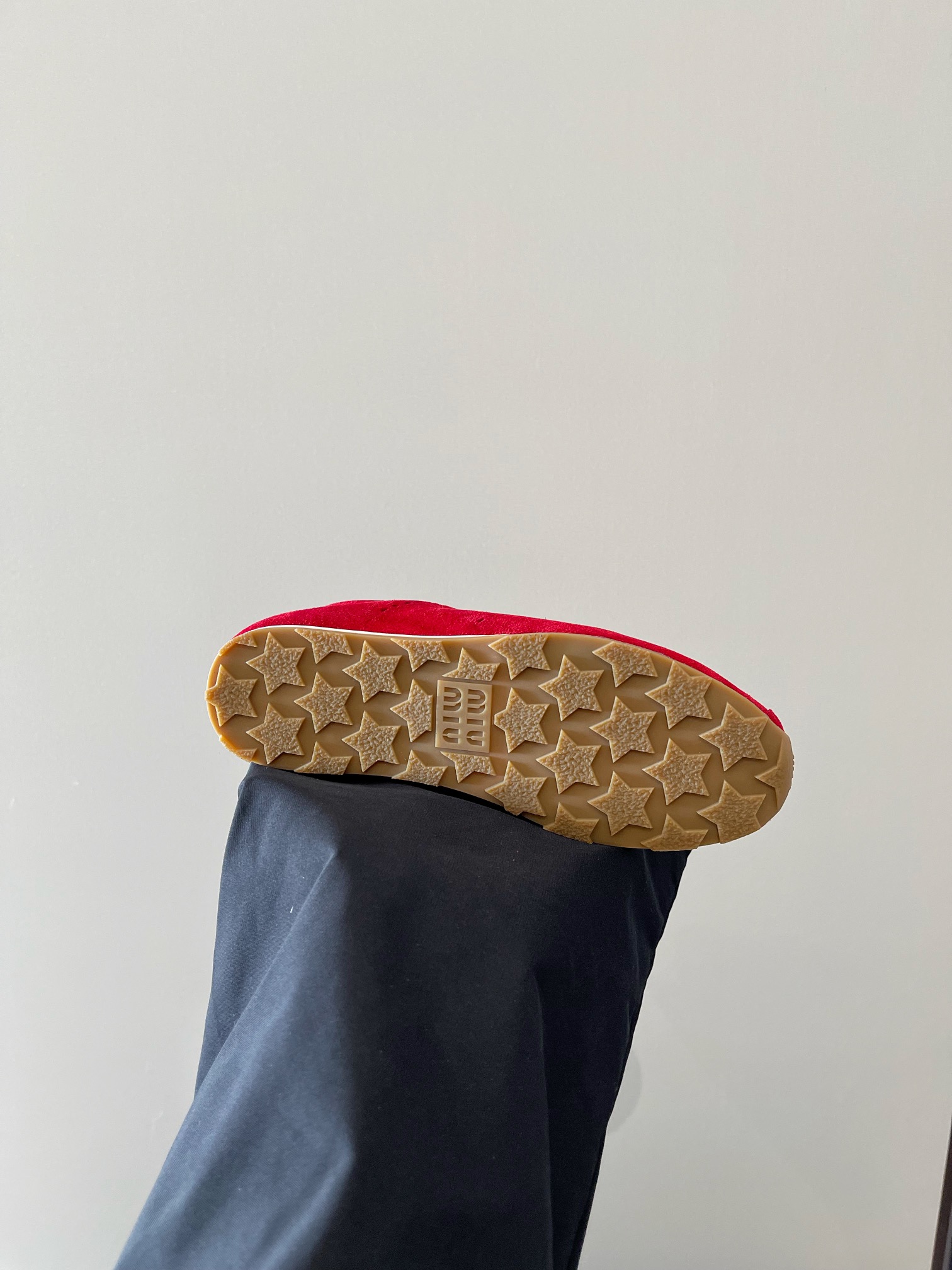 Step out in style with these Miu Miu retro-inspired red suede sneakers. Comfortable, chic, and ready to elevate your everyday look.