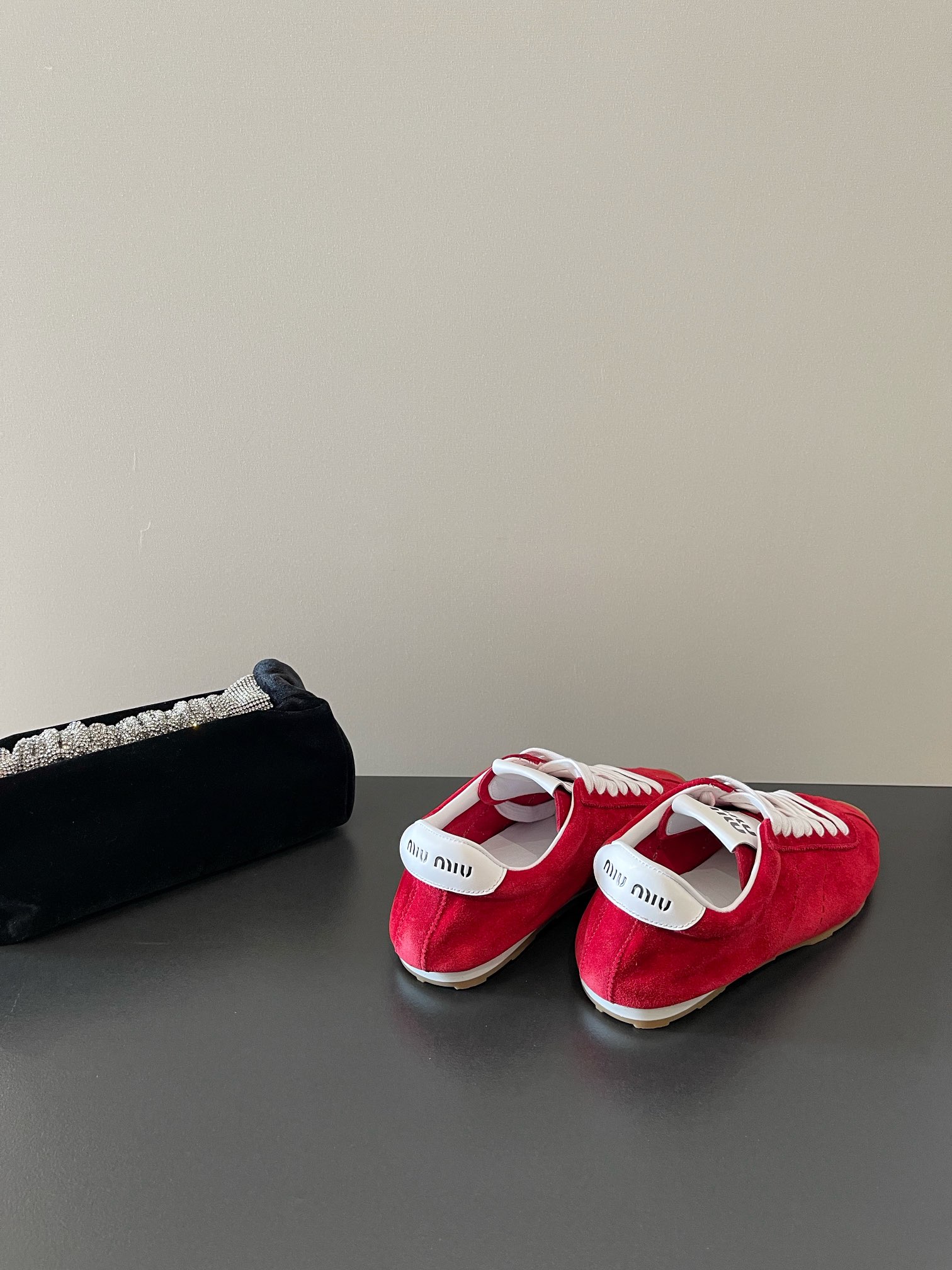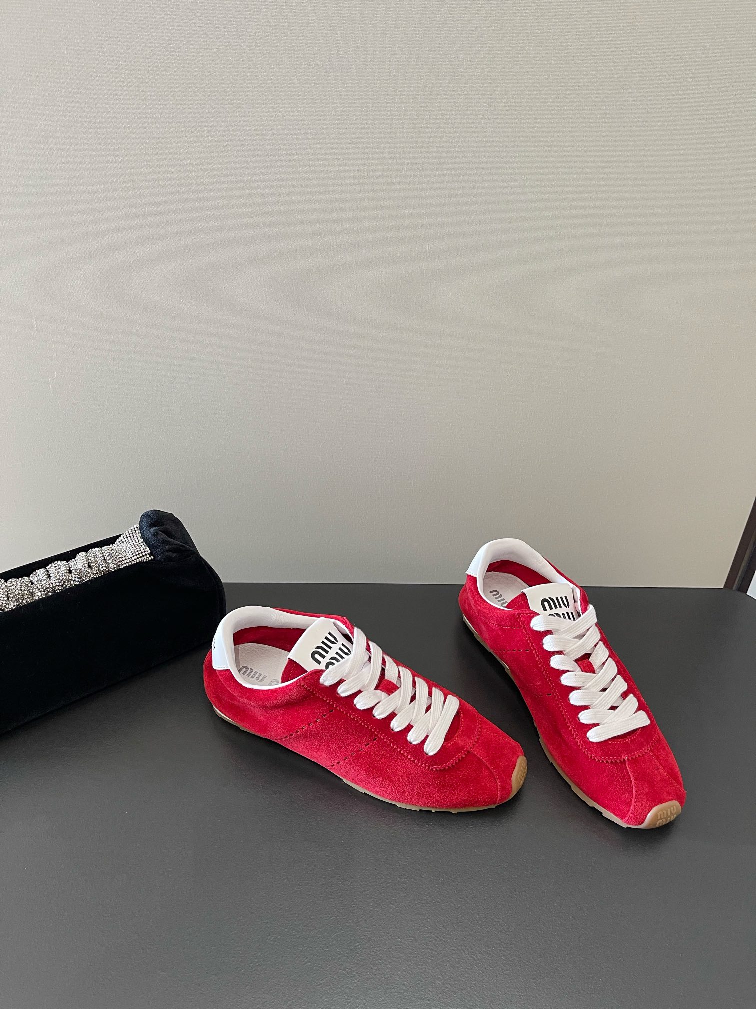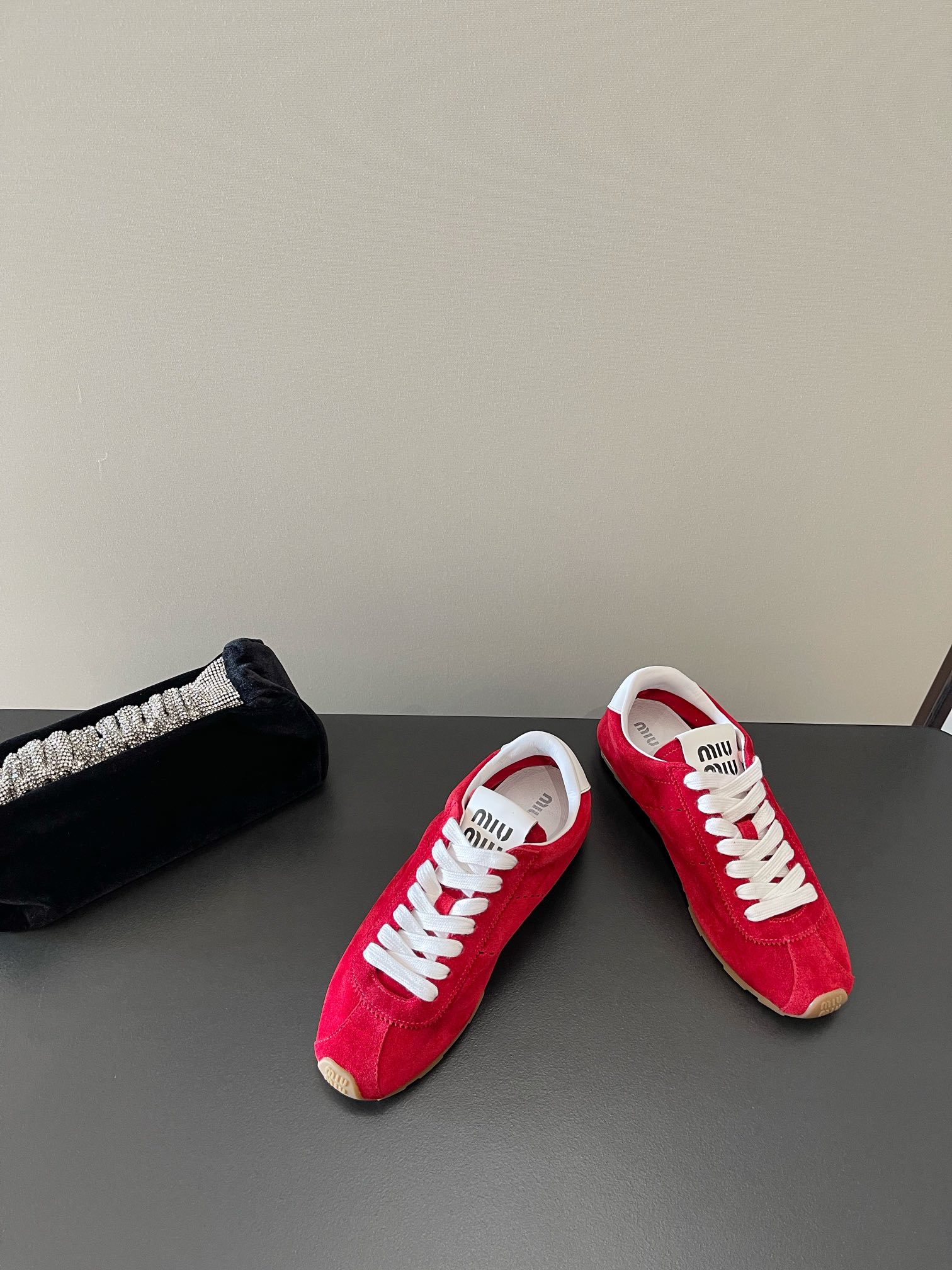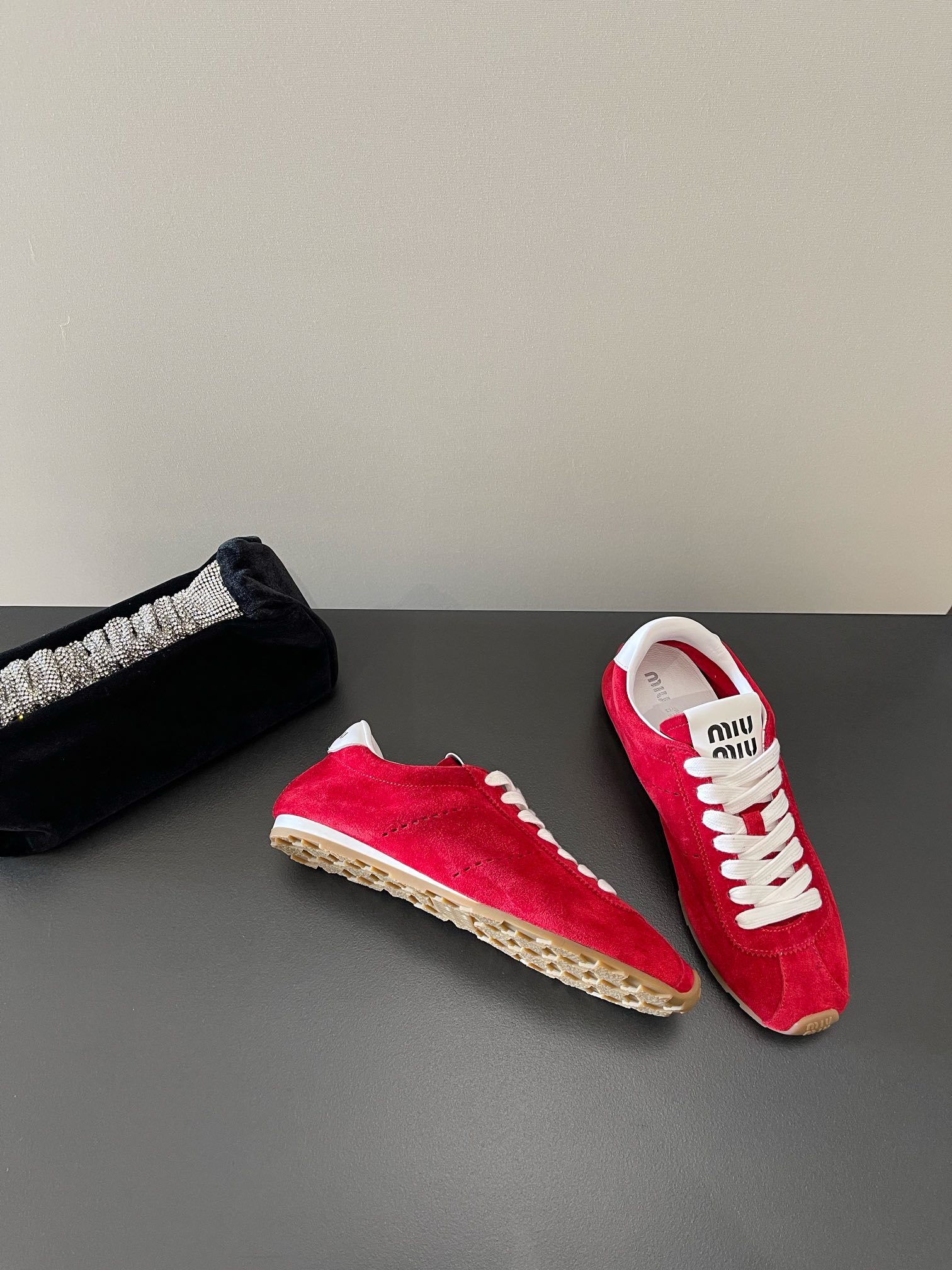 Step out in style with these Miu Miu retro-inspired red suede sneakers. Comfortable, chic, and ready to elevate your everyday look.