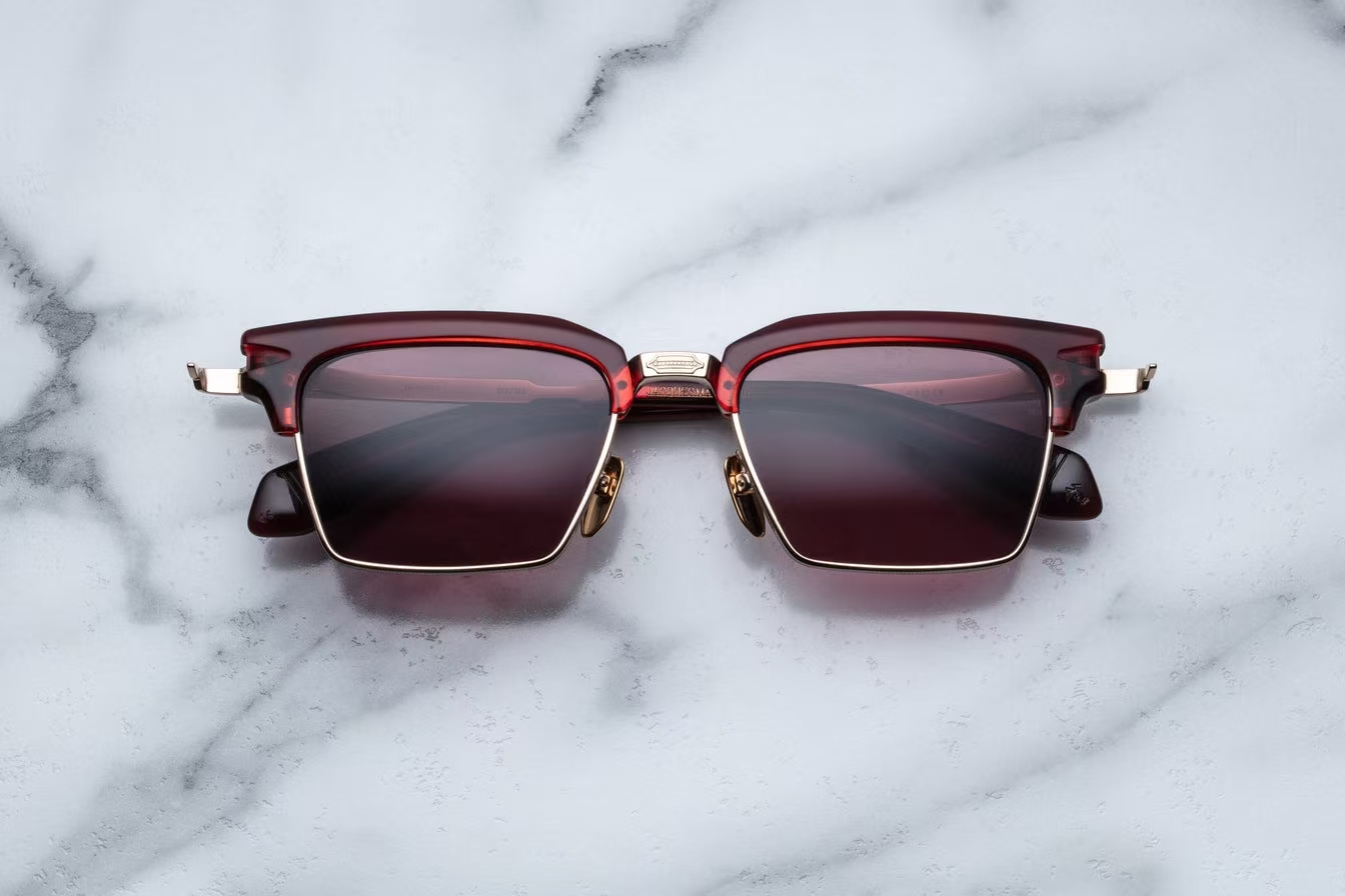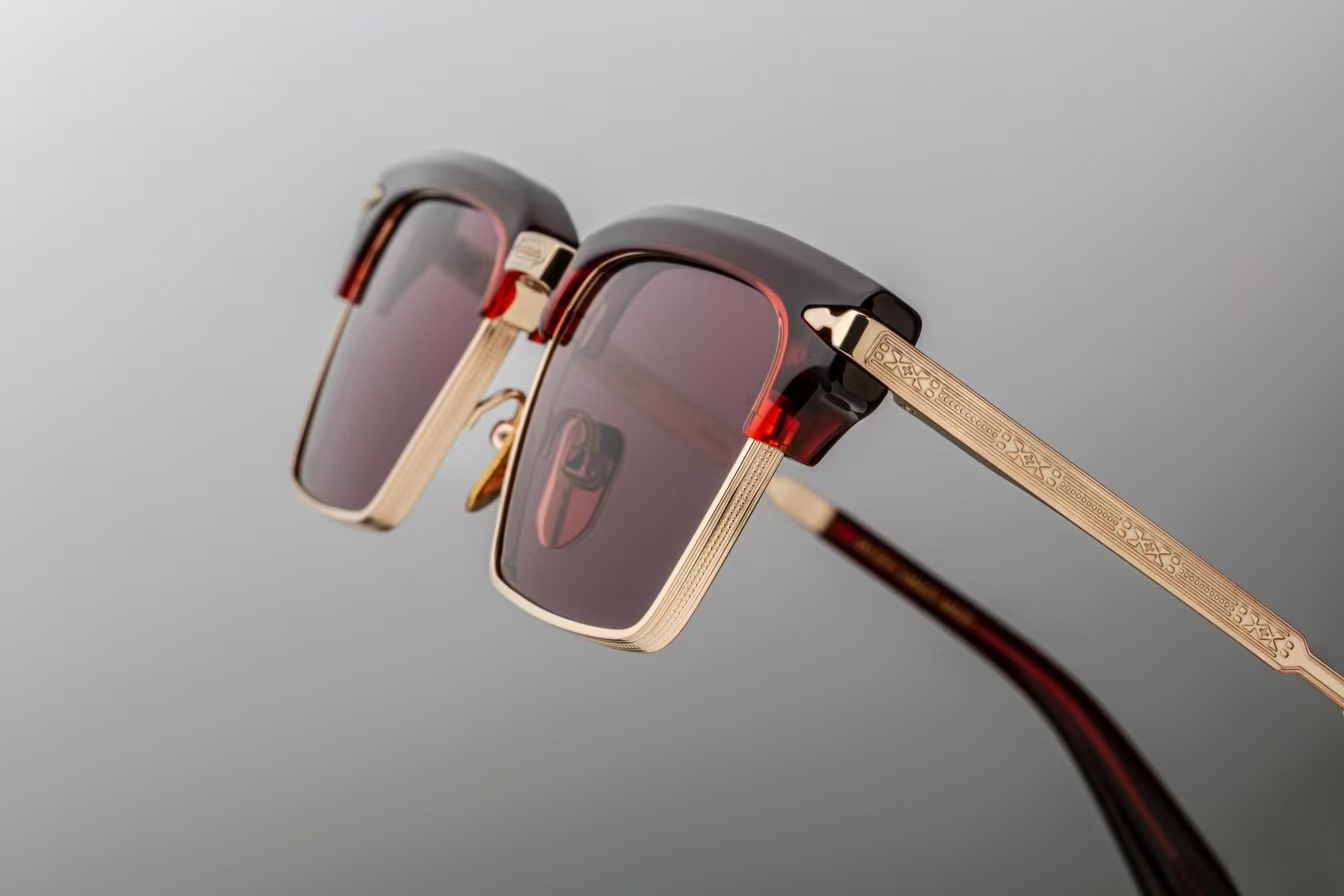 Elevate your style with these JACQUES MARIE MAGE sunglasses. Featuring a unique red tortoise frame and elegant gold detailing.