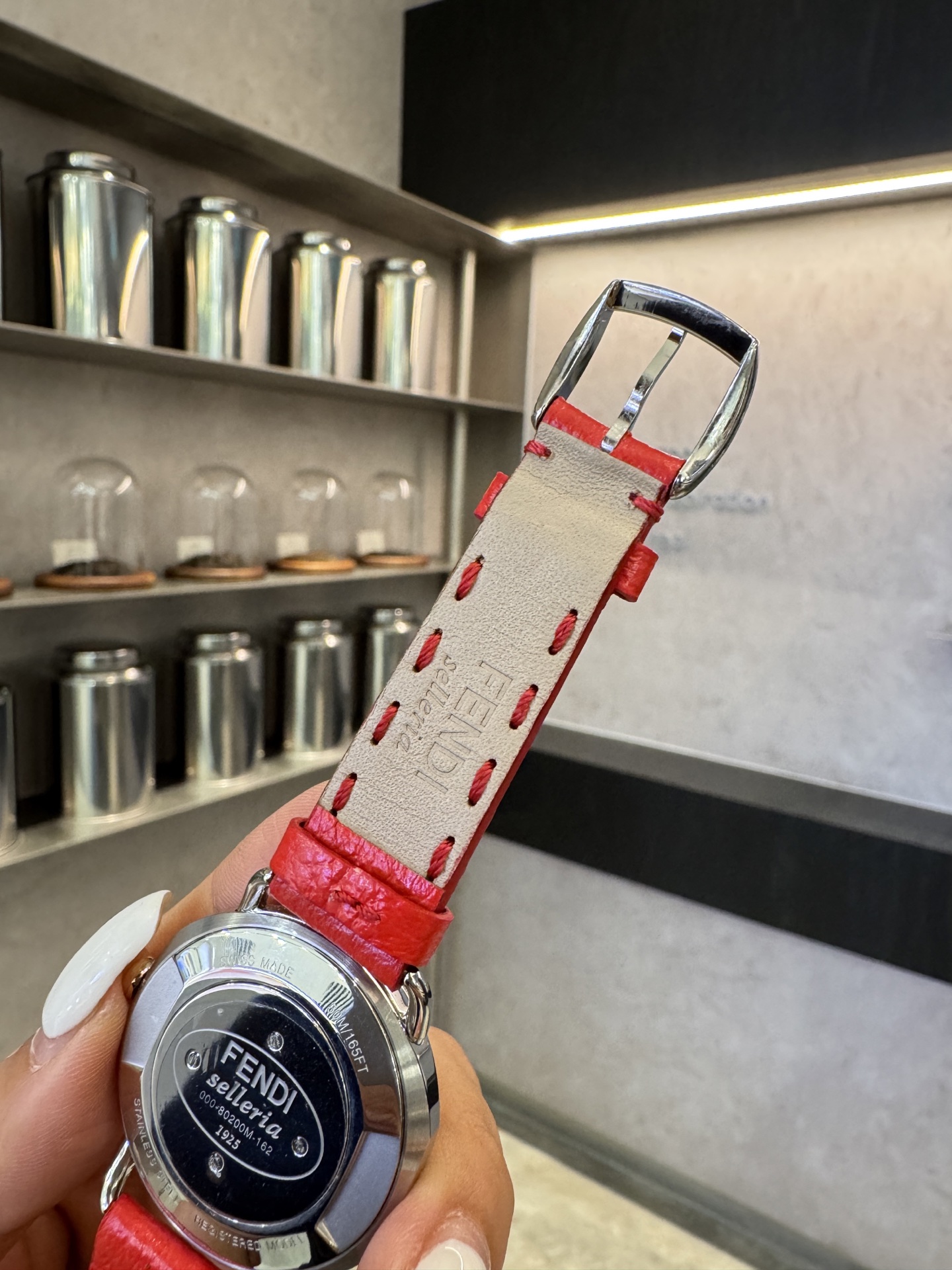 Elegant Fendi Selleria watch with a 36mm dial, genuine leather strap, and Swiss quartz movement. Perfect for everyday wear.