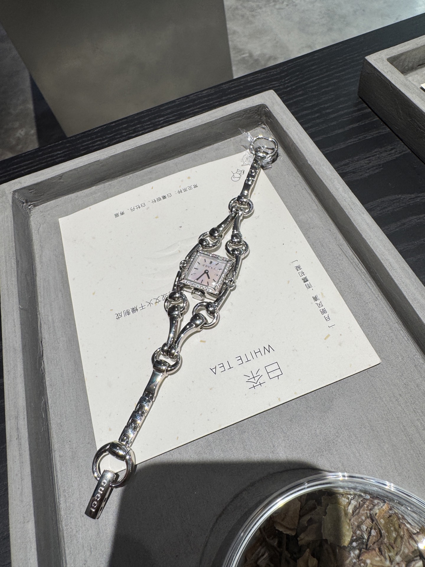 Elegant Gucci bracelet watch featuring a Swiss quartz movement, diamond accents, and a unique horsebit design.