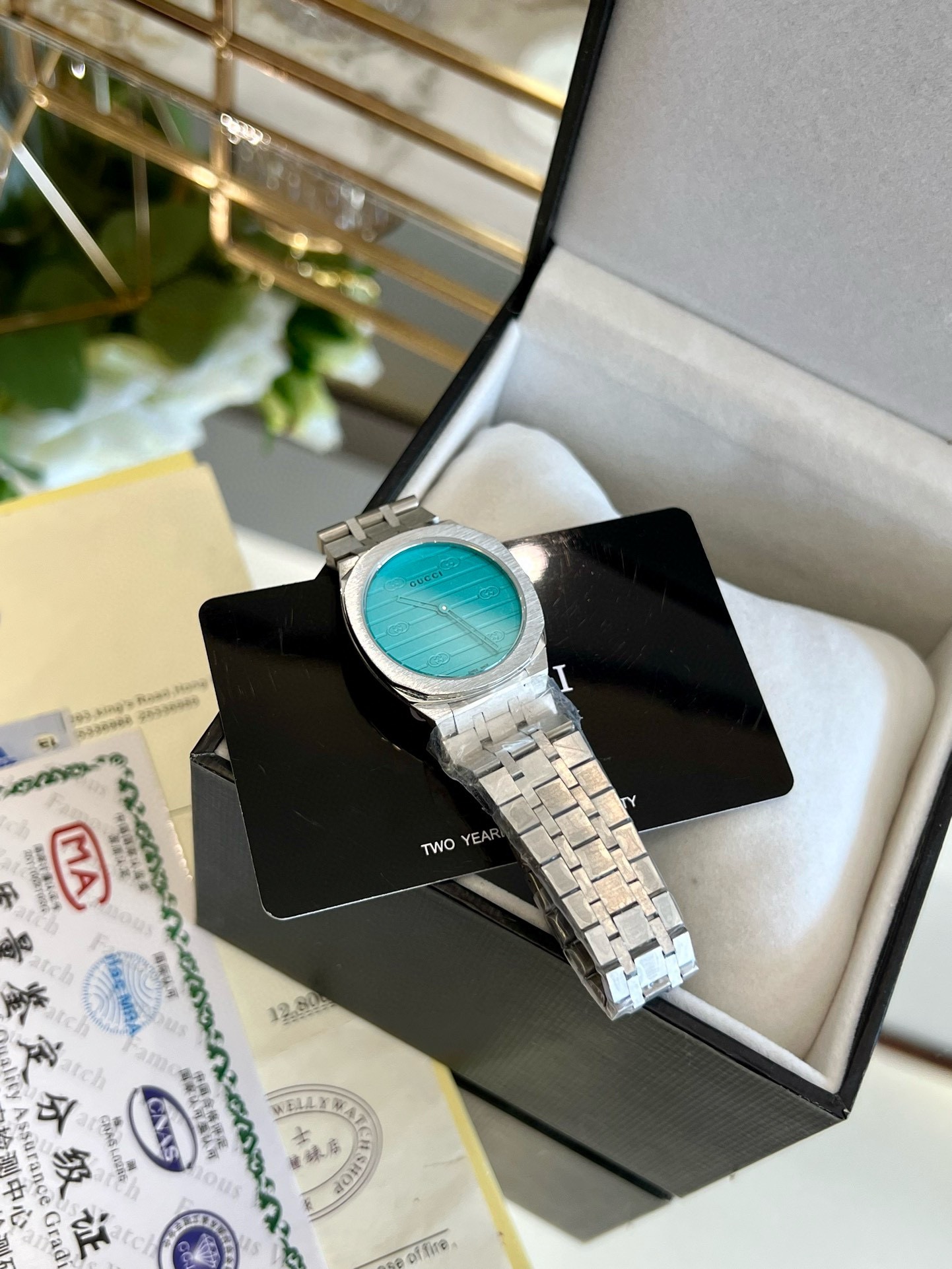 This Gucci watch is a timeless piece that will add a touch of elegance to any outfit. It's a must-have for any watch collector.