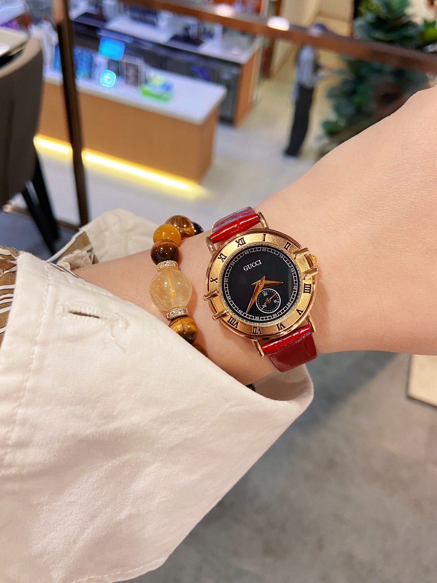 - High-Quality Materials: Crafted with a durable red leather band and a gold-tone case.