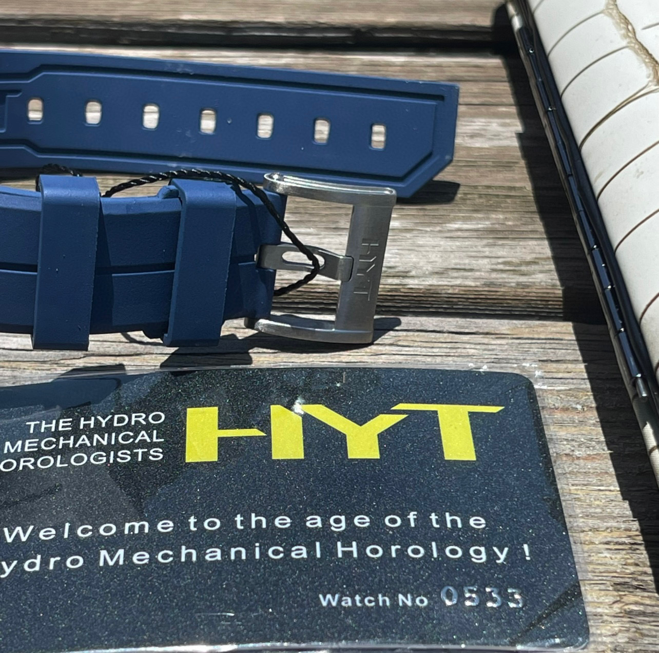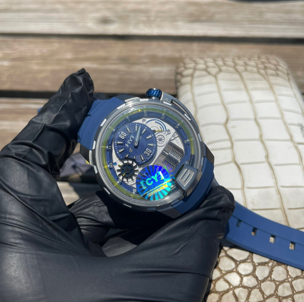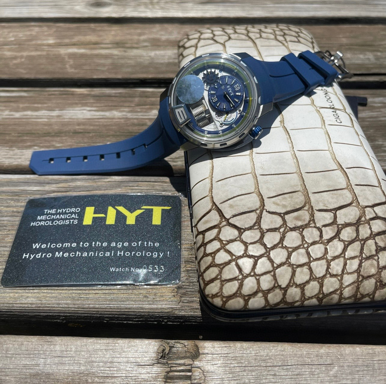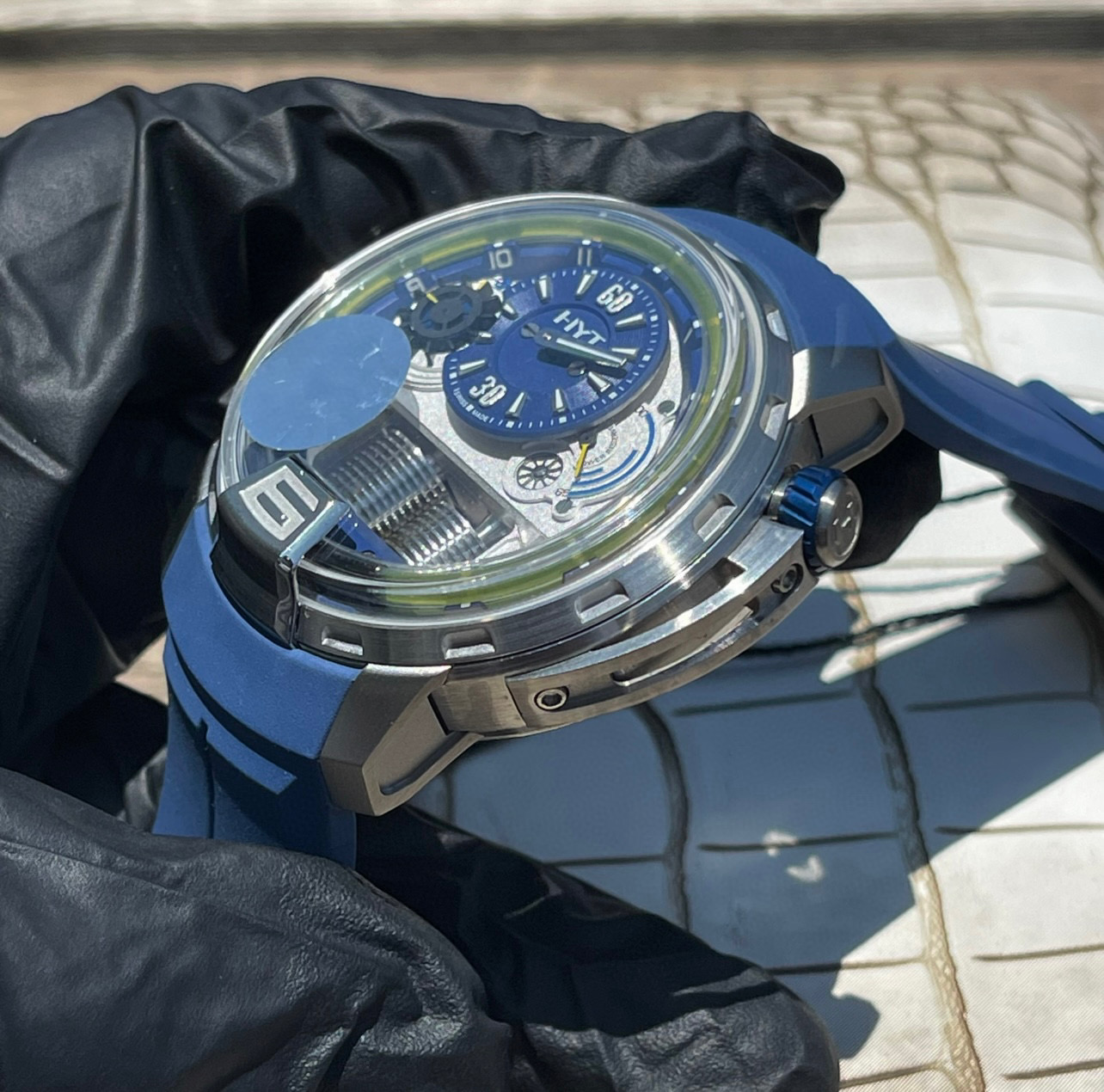 Experience the innovative HYT H1 Series watch. Features a 46mm 904 stainless steel case, automatic movement, and a comfortable blue rubber strap. Limited edition.