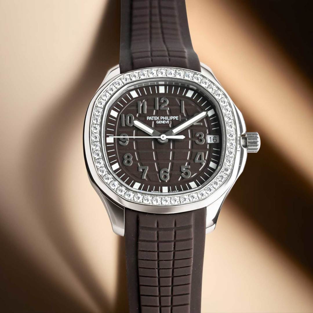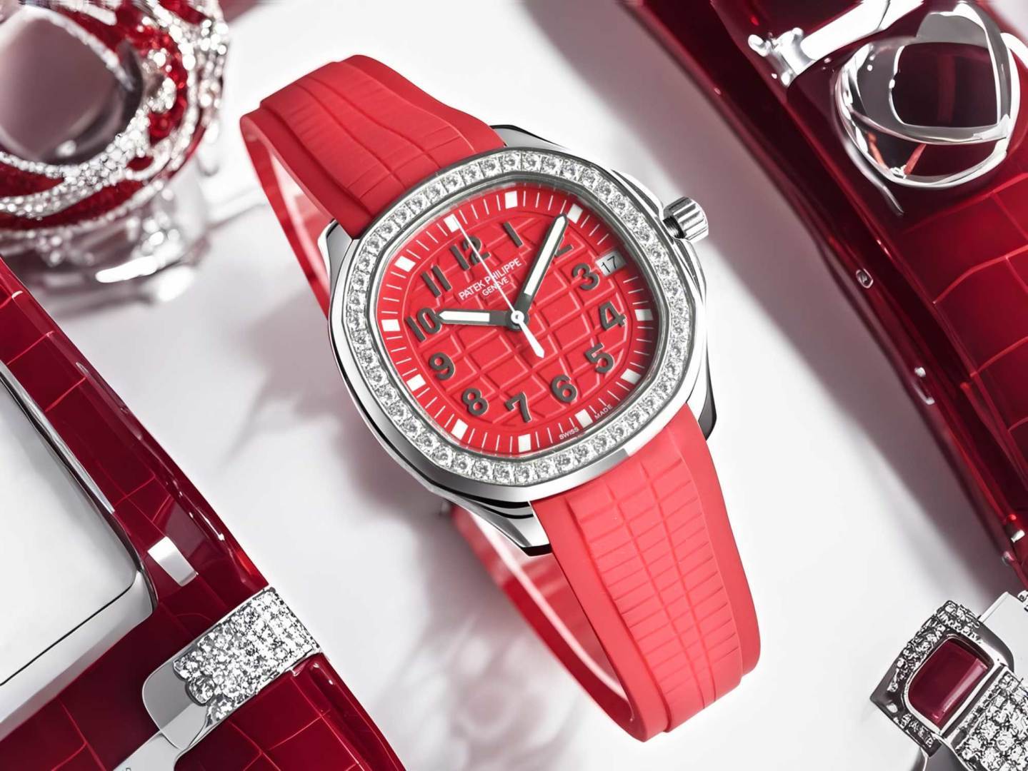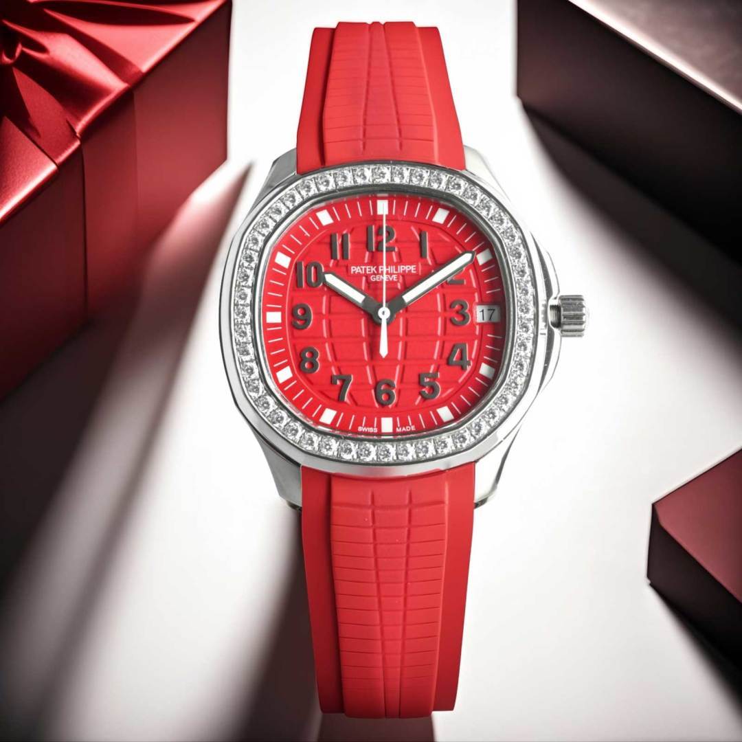 Experience the dynamic elegance of the Patek Philippe Aquanaut. Featuring a unique red rubber strap, diamond bezel, and precise automatic movement.