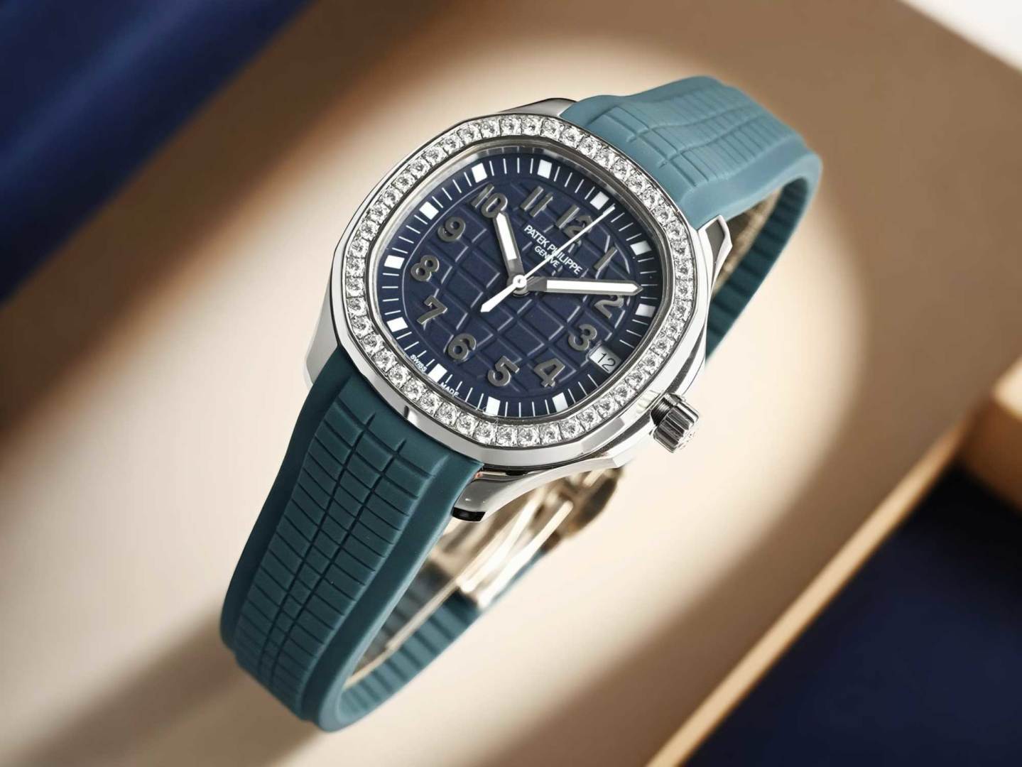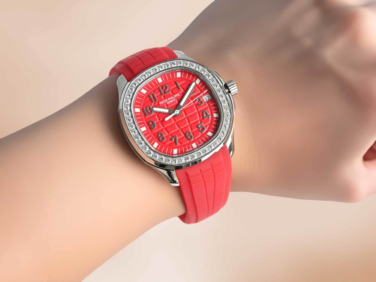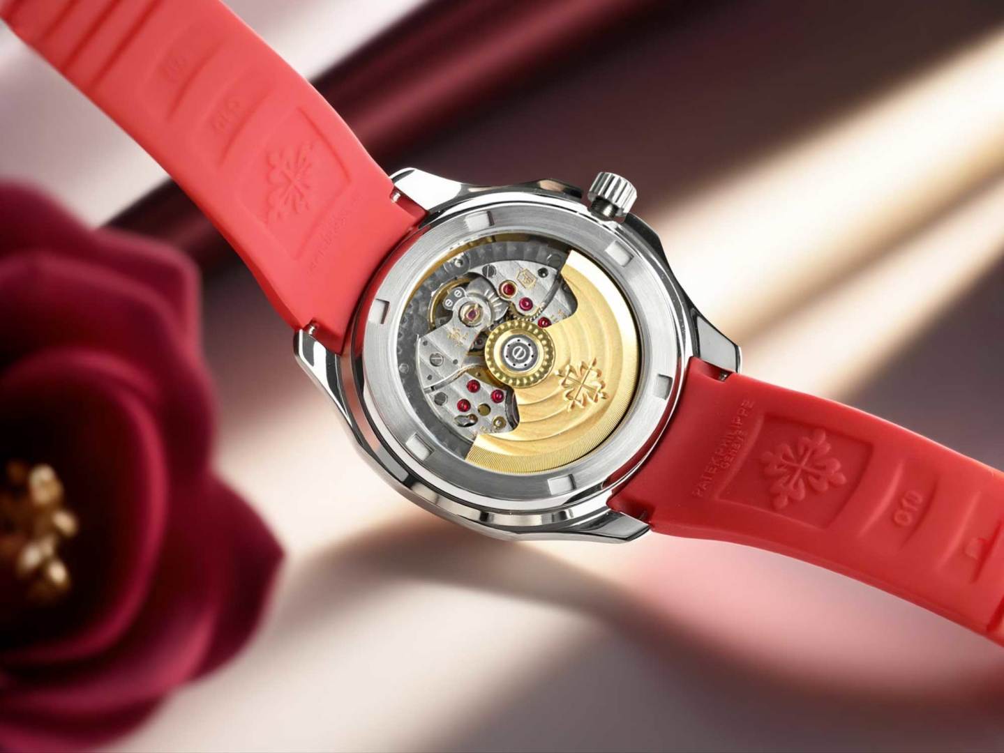 Experience the dynamic elegance of the Patek Philippe Aquanaut. Featuring a unique red rubber strap, diamond bezel, and precise automatic movement.