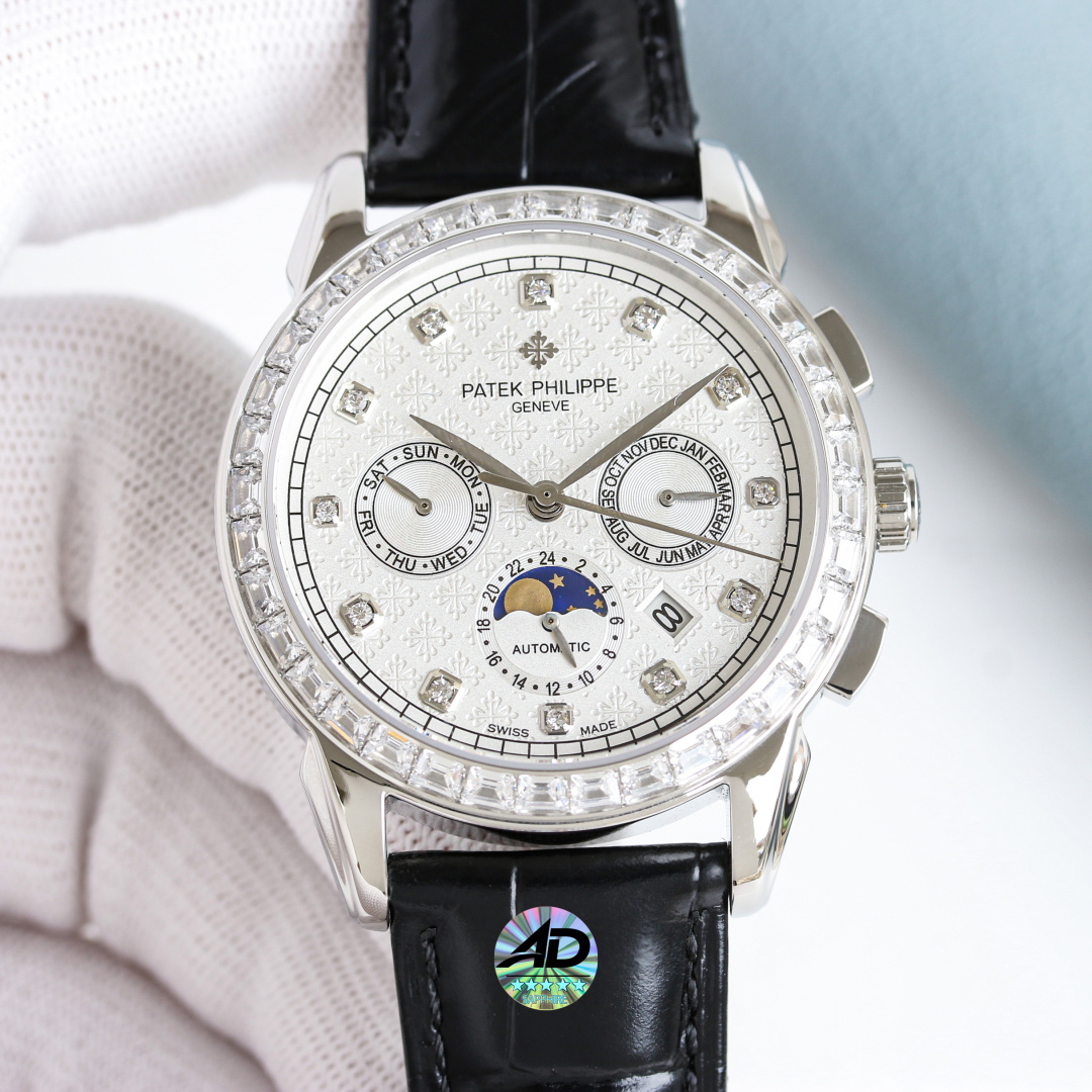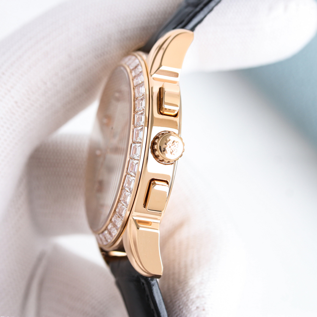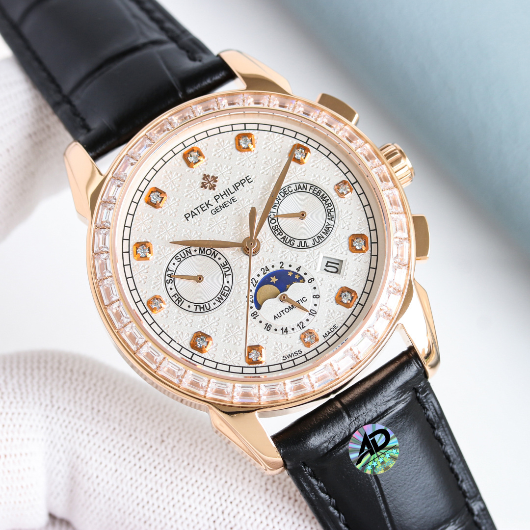 Experience luxury with this Patek Philippe watch. Featuring a sophisticated design, multifunction movement, and diamond-set bezel, it's a timeless masterpiece.